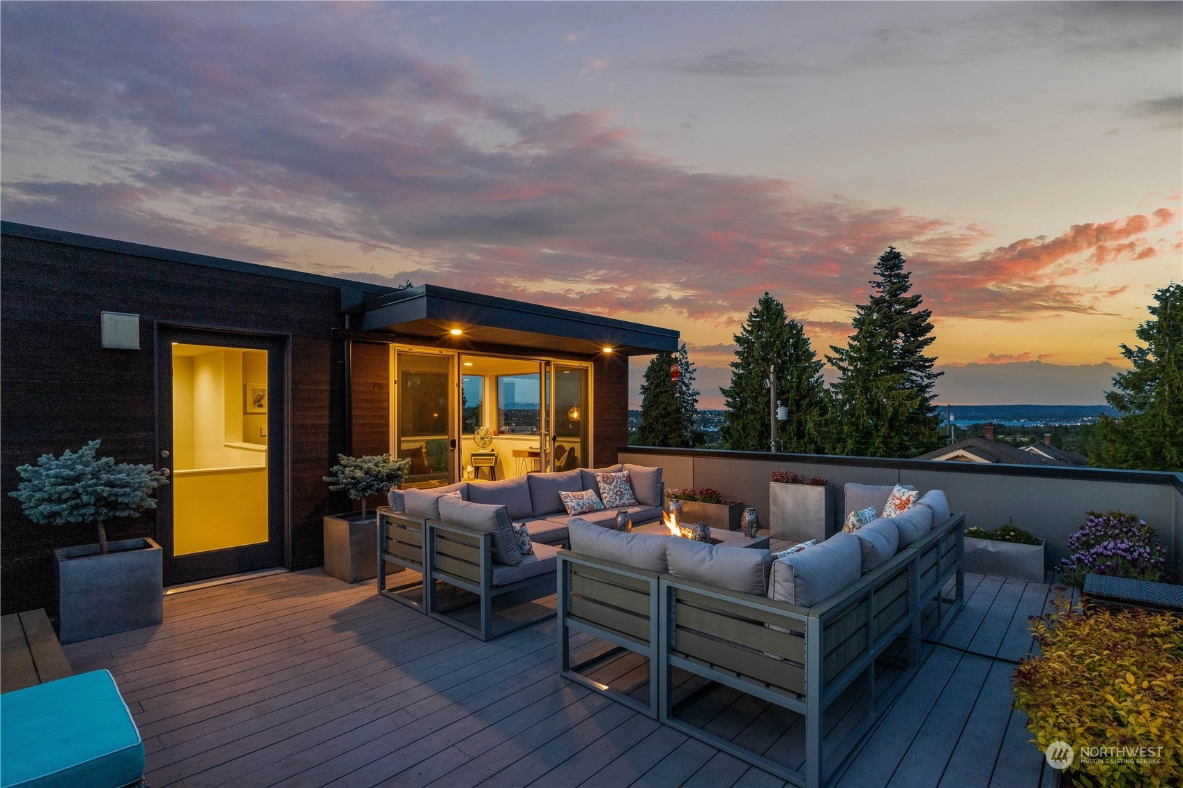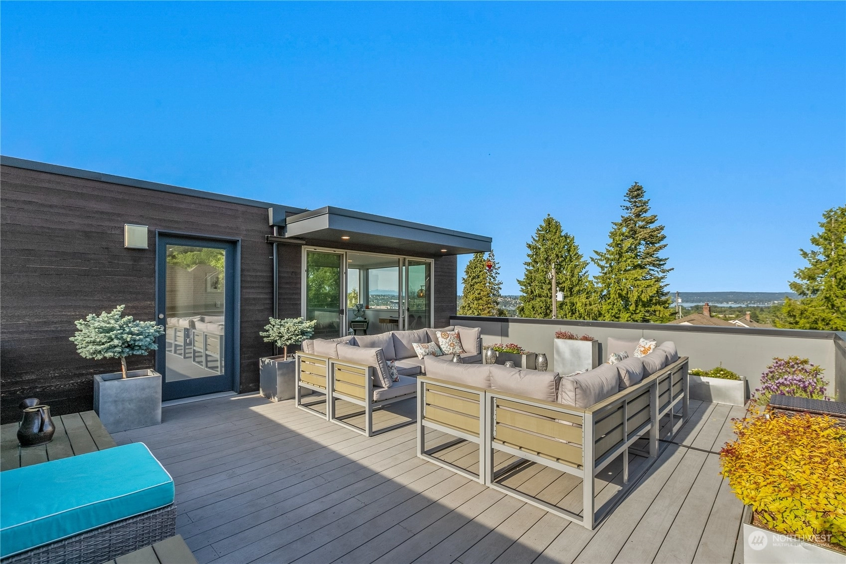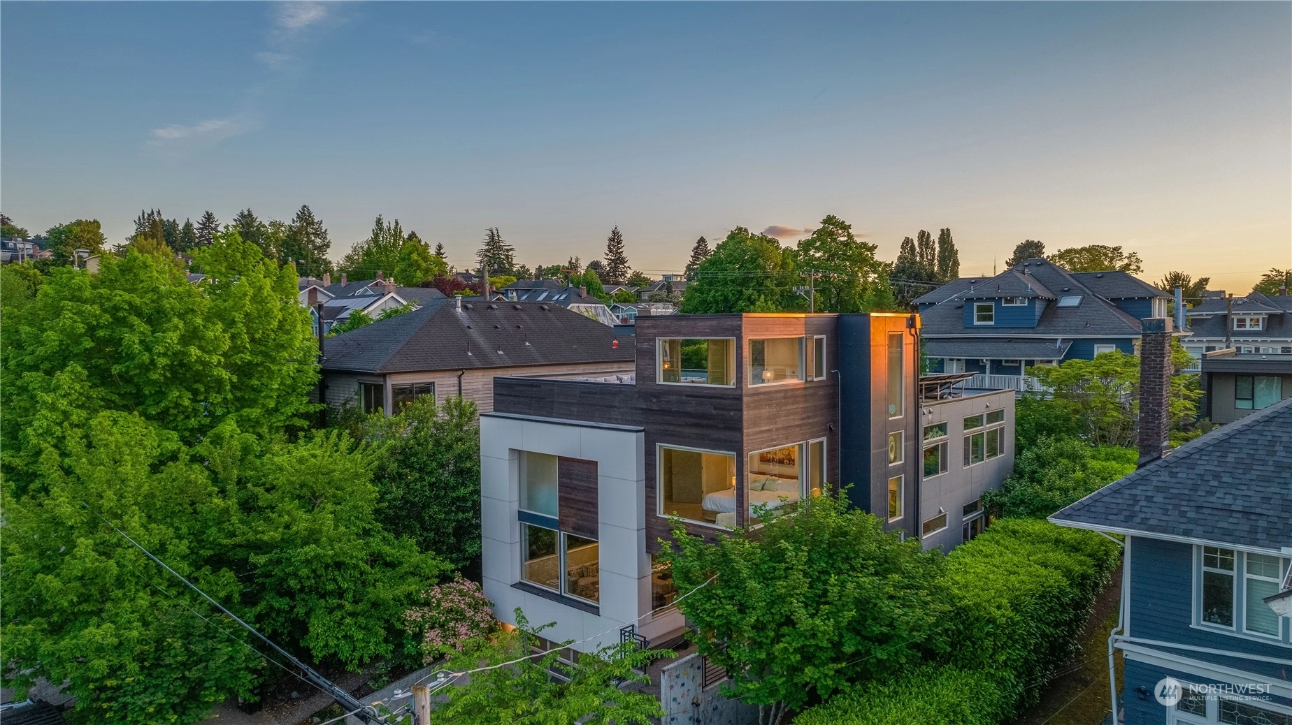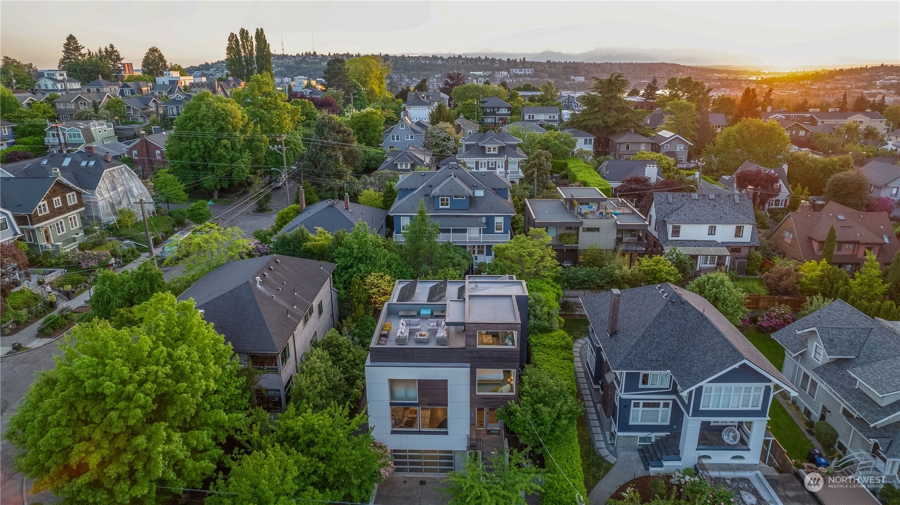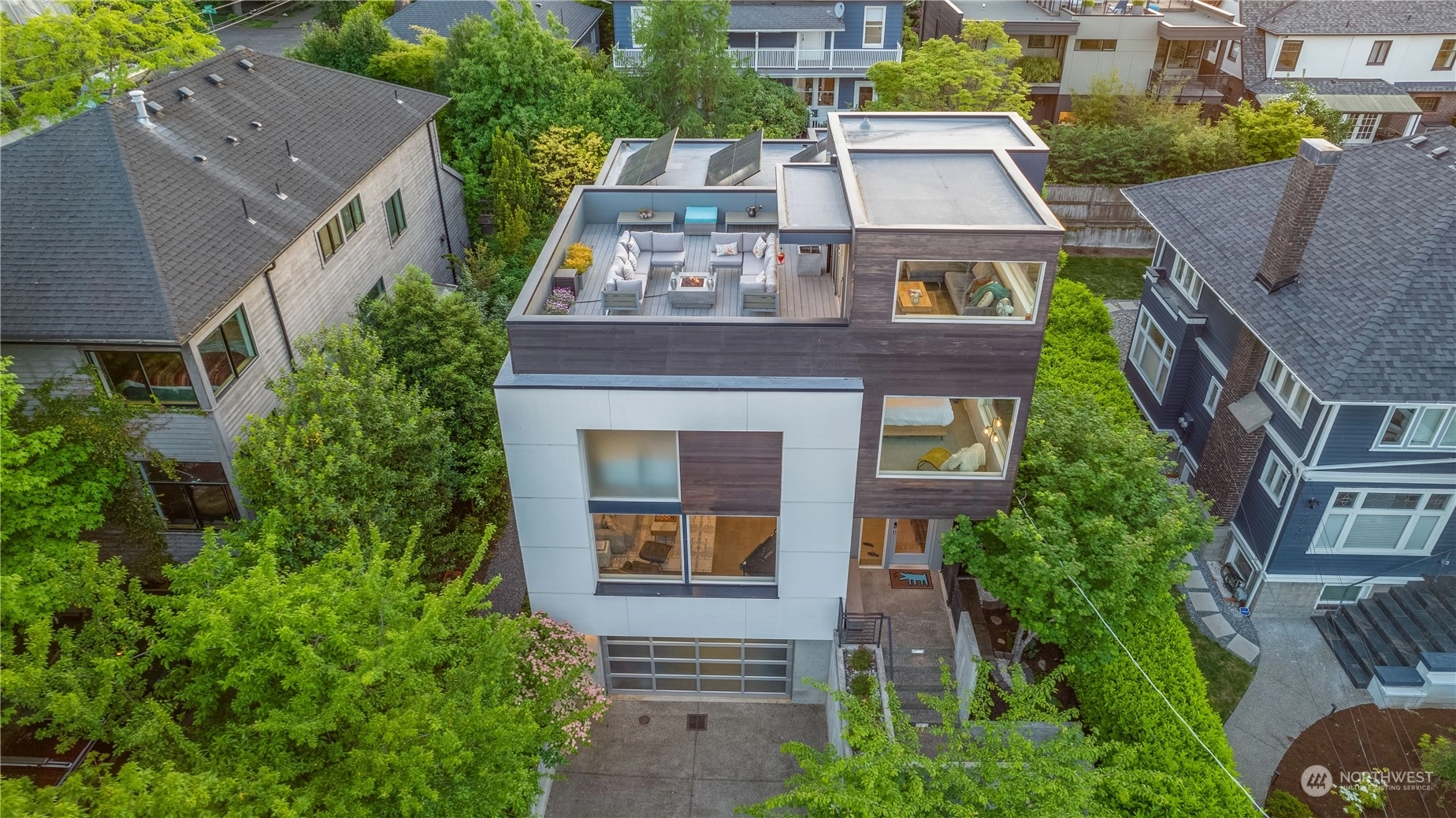 Coveted North Capitol Hill, Urban Oasis. Modern luxury meets convenience and views. Easy access to I-5, 520, Downtown or Eastside take your pick. Bars and restaurants minutes away. Seattle Prep, Bertschi Elementary and TOPS at Seward K-8. No winter blues here; picture windows fill the house with light all year long. The open-plan main floor makes entertaining a dream, brand new deck and folding wall of glass brings the outside in. 3 spacious bedrooms on 2nd floor provide room for everyone. Generous roof deck has cozy studio with amazing views, UW stadium, Lake WA, Cascades. 4th bedroom and Family room on the two-car garage level serves as an extra office, home theater or gym. Solar panels pay for roughly half of electrical needs.