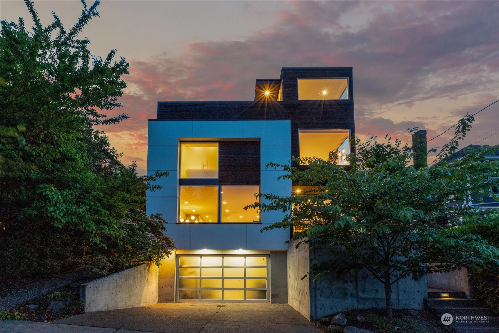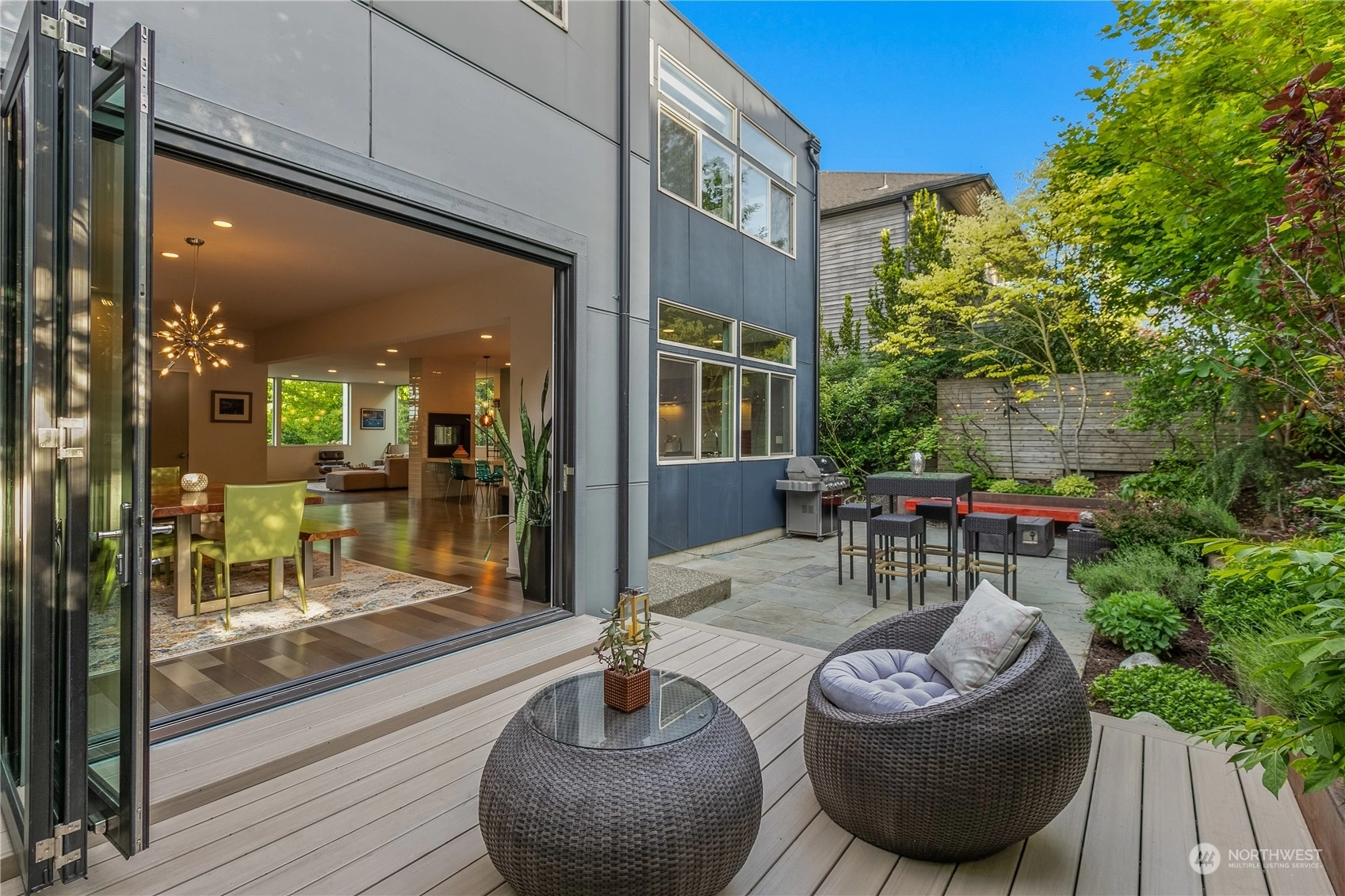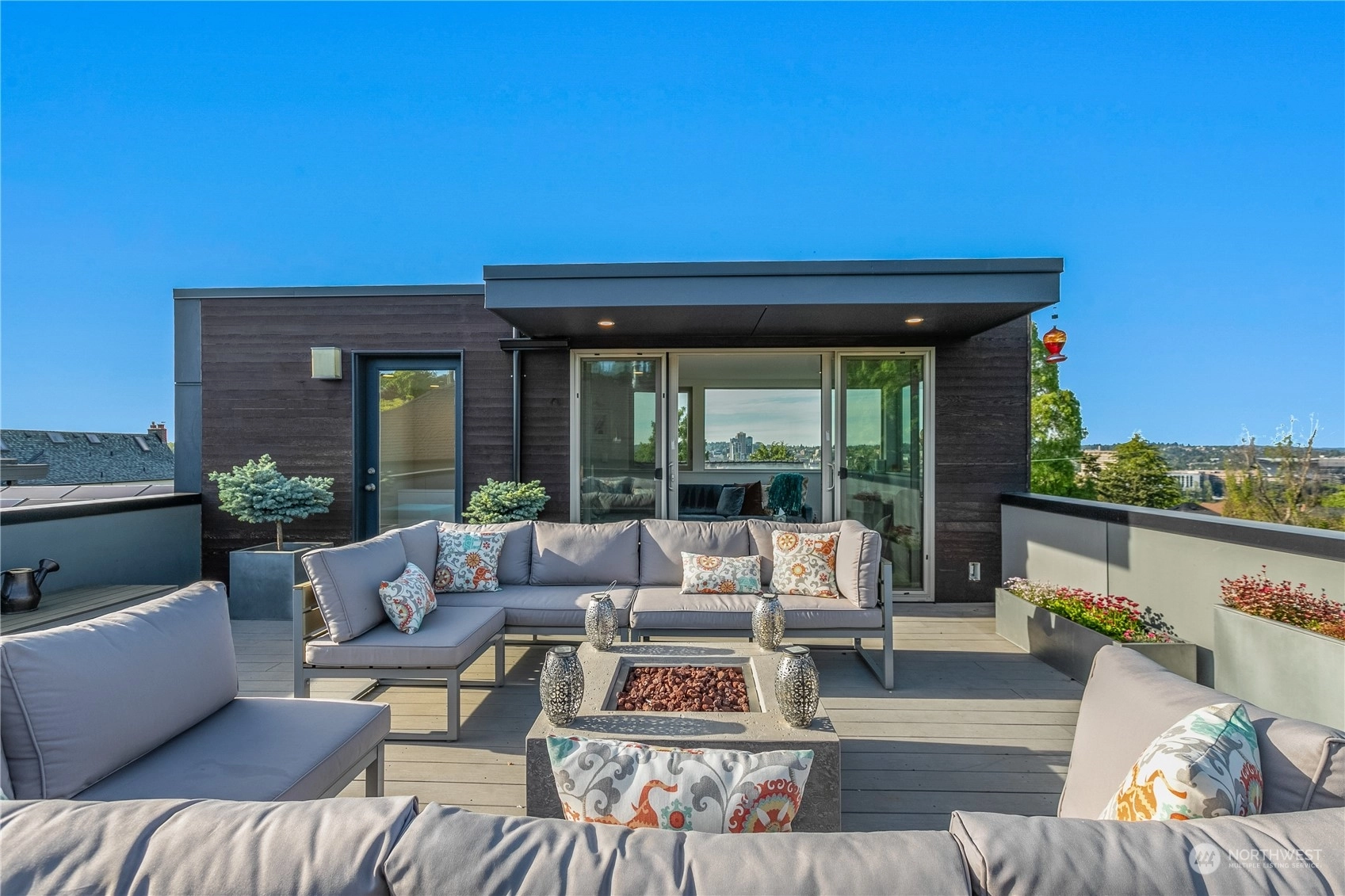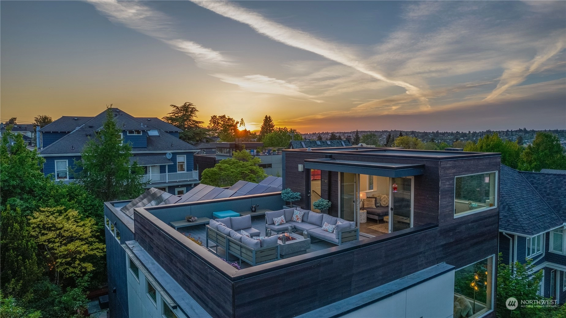 Coveted North Capitol Hill, Urban Oasis. Modern luxury meets convenience and views. Easy access to I-5, 520, Downtown or Eastside take your pick. Bars and restaurants minutes away. Seattle Prep, Bertschi Elementary and TOPS at Seward K-8. No winter blues here; picture windows fill the house with light all year long. The open-plan main floor makes entertaining a dream, brand new deck and folding wall of glass brings the outside in. 3 spacious bedrooms on 2nd floor provide room for everyone. Generous roof deck has cozy studio with amazing views, UW stadium, Lake WA, Cascades. 4th bedroom and Family room on the two-car garage level serves as an extra office, home theater or gym. Solar panels pay for roughly half of electrical needs.