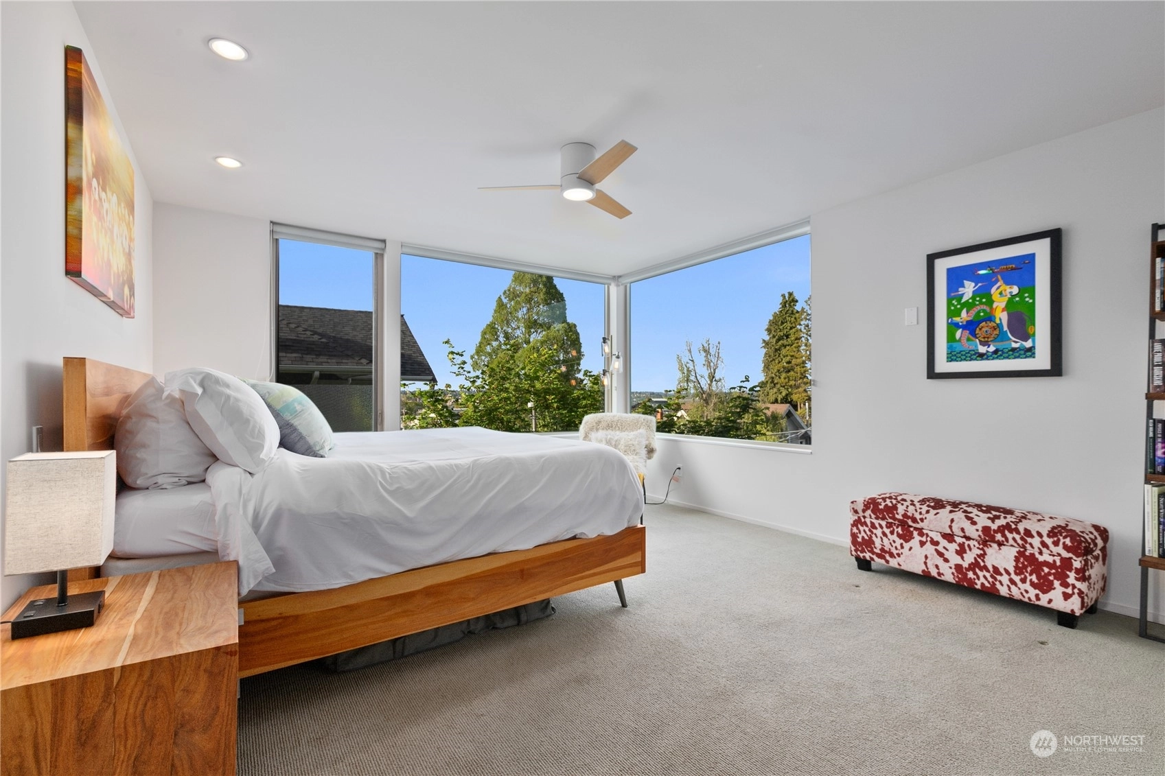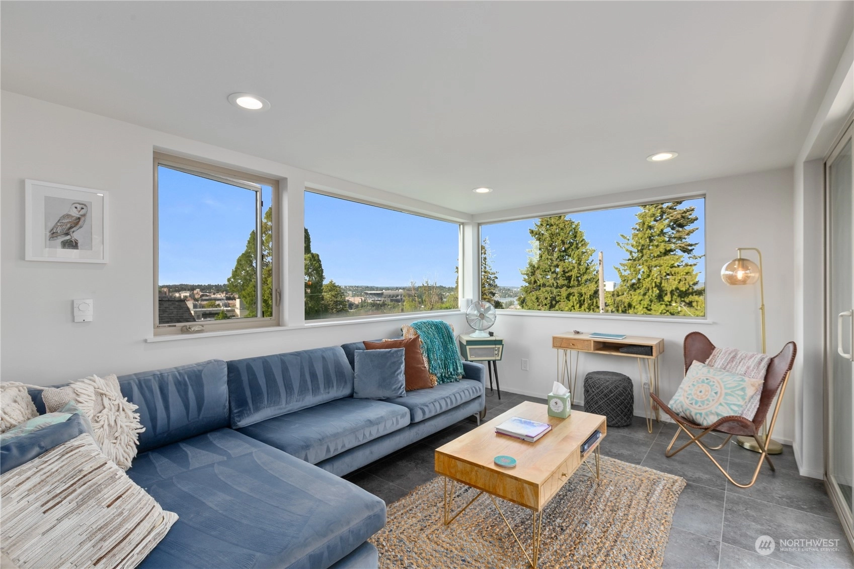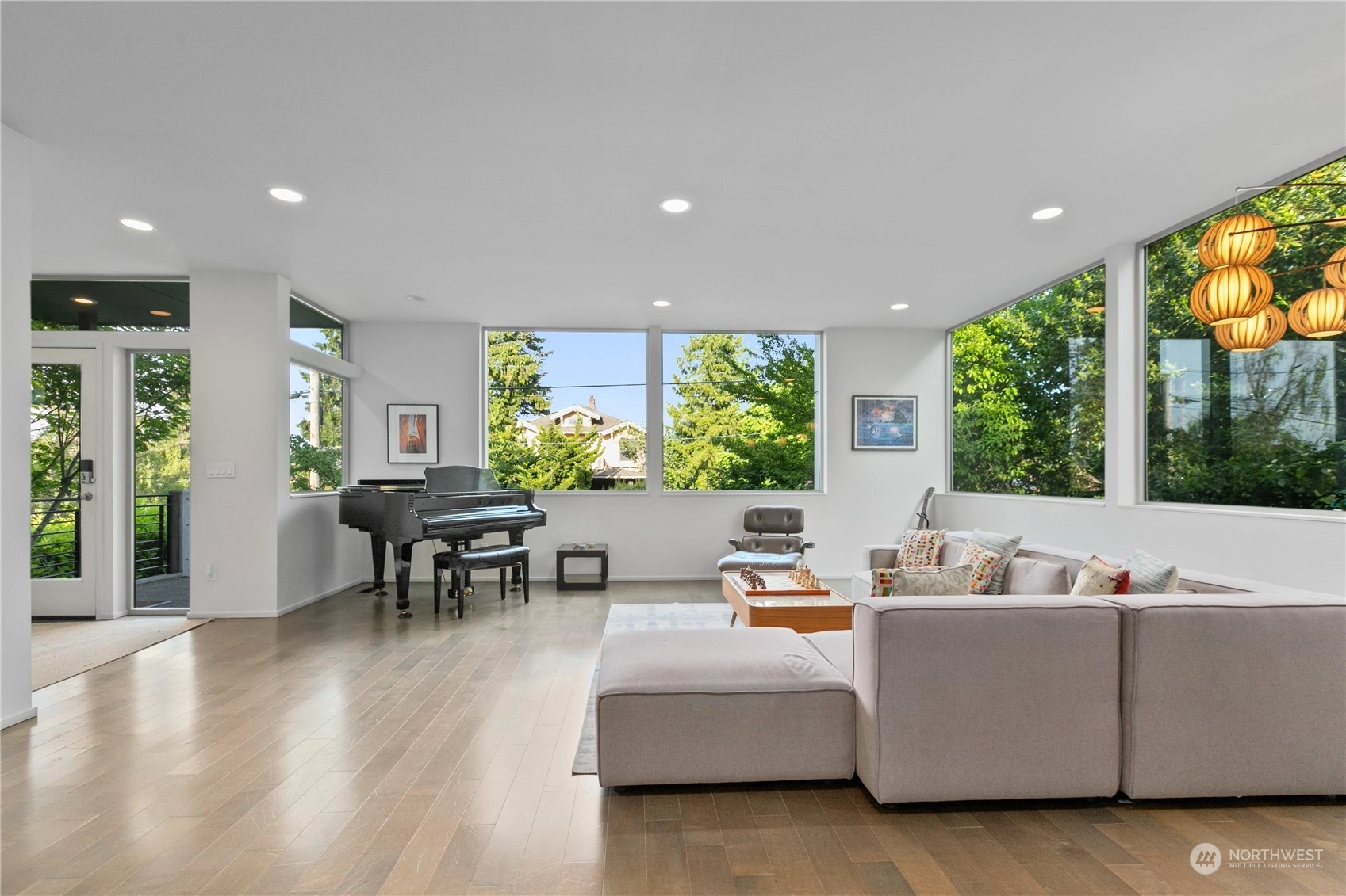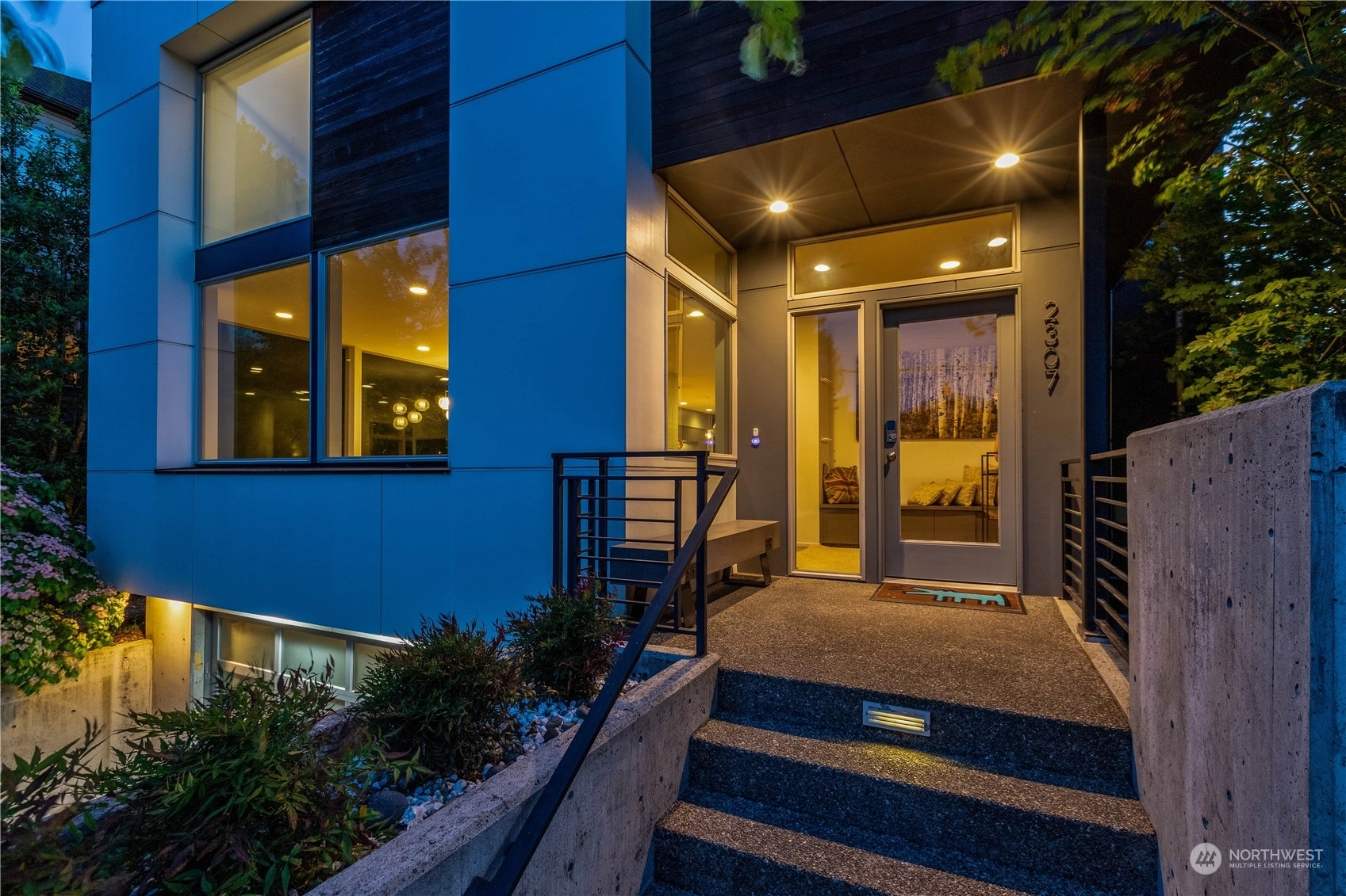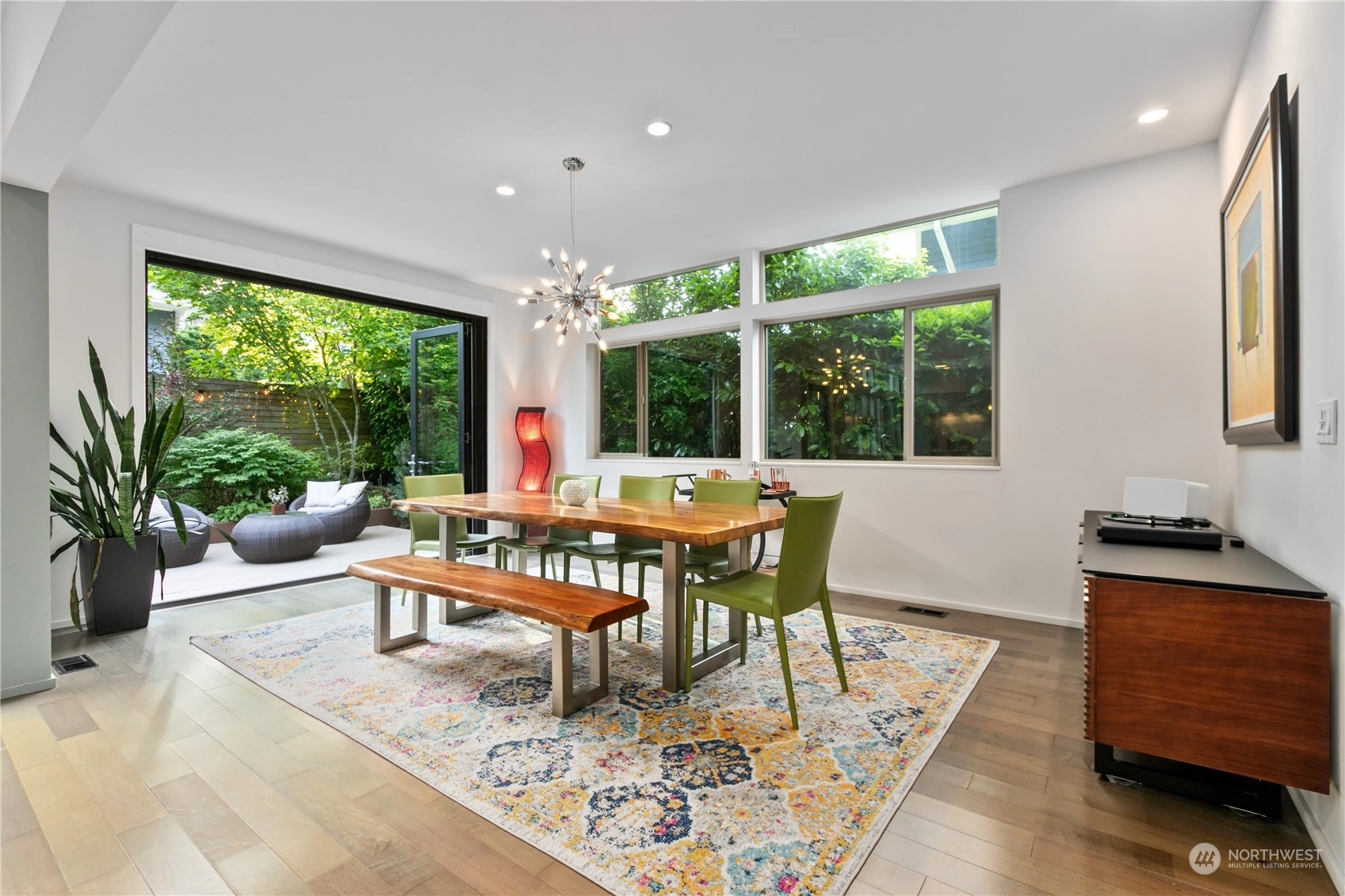 Coveted North Capitol Hill, Urban Oasis. Modern luxury meets convenience and views. Easy access to I-5, 520, Downtown or Eastside take your pick. Bars and restaurants minutes away. Seattle Prep, Bertschi Elementary and TOPS at Seward K-8. No winter blues here; picture windows fill the house with light all year long. The open-plan main floor makes entertaining a dream, brand new deck and folding wall of glass brings the outside in. 3 spacious bedrooms on 2nd floor provide room for everyone. Generous roof deck has cozy studio with amazing views, UW stadium, Lake WA, Cascades. 4th bedroom and Family room on the two-car garage level serves as an extra office, home theater or gym. Solar panels pay for roughly half of electrical needs.