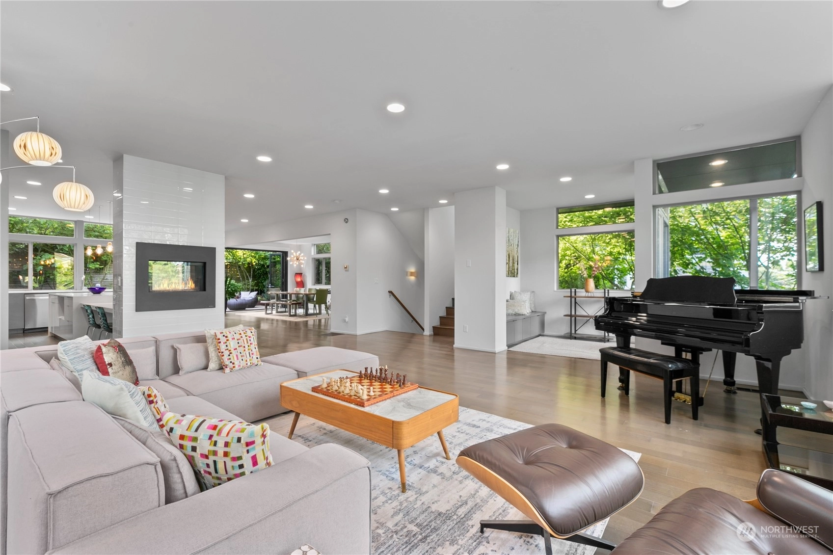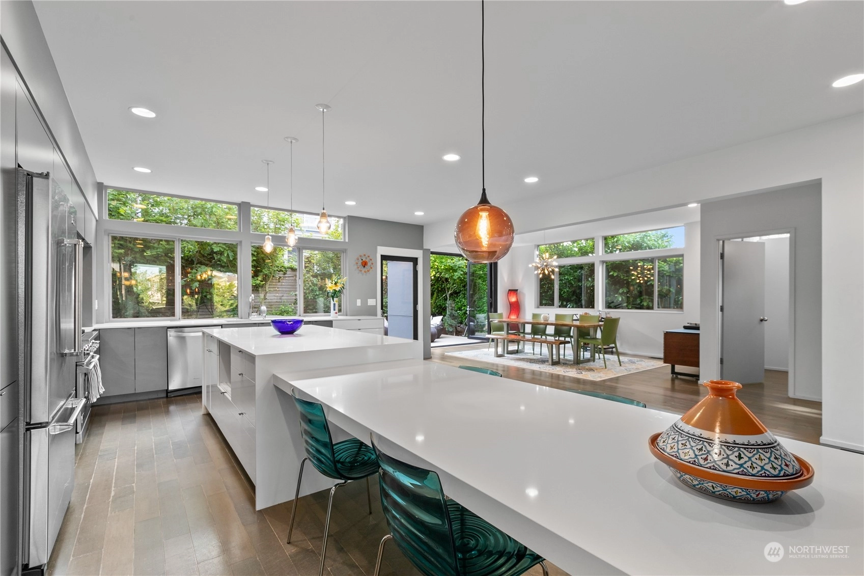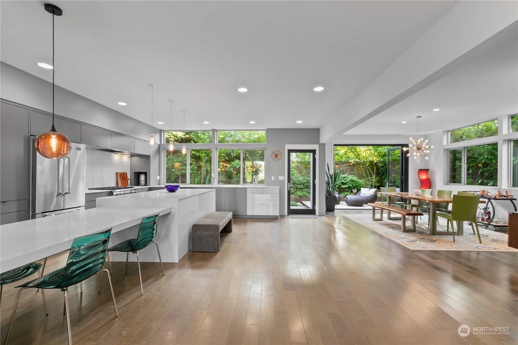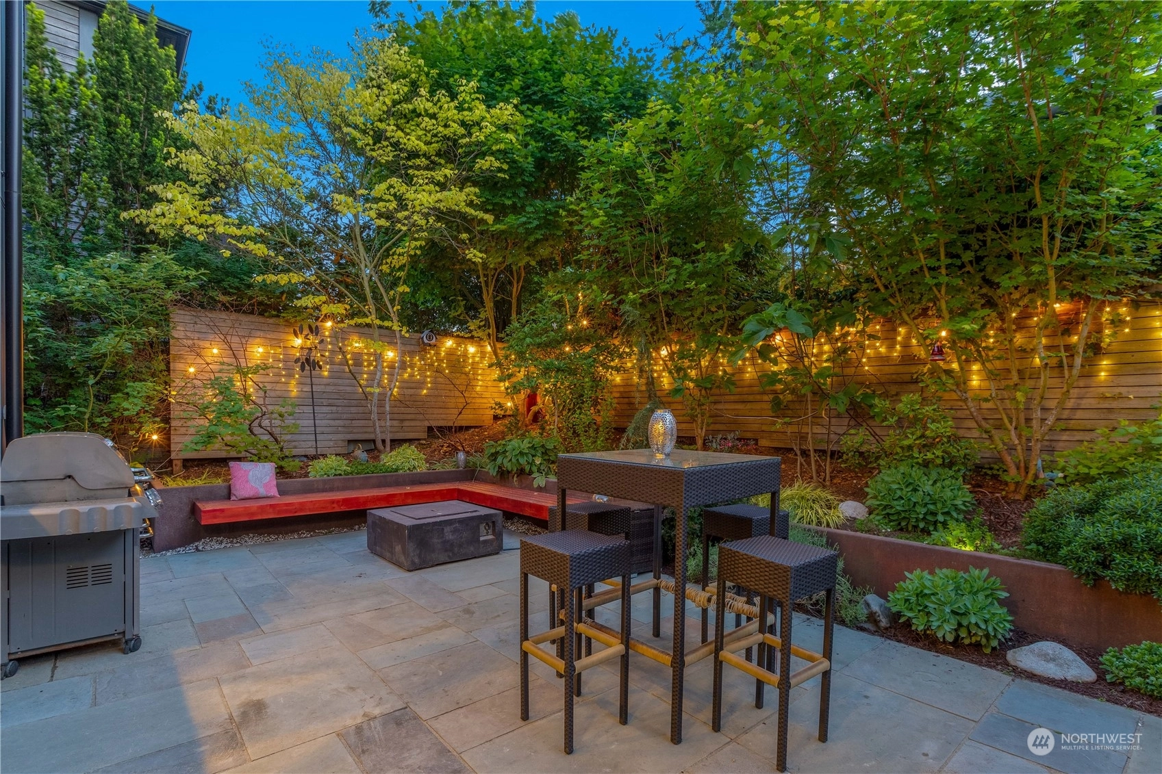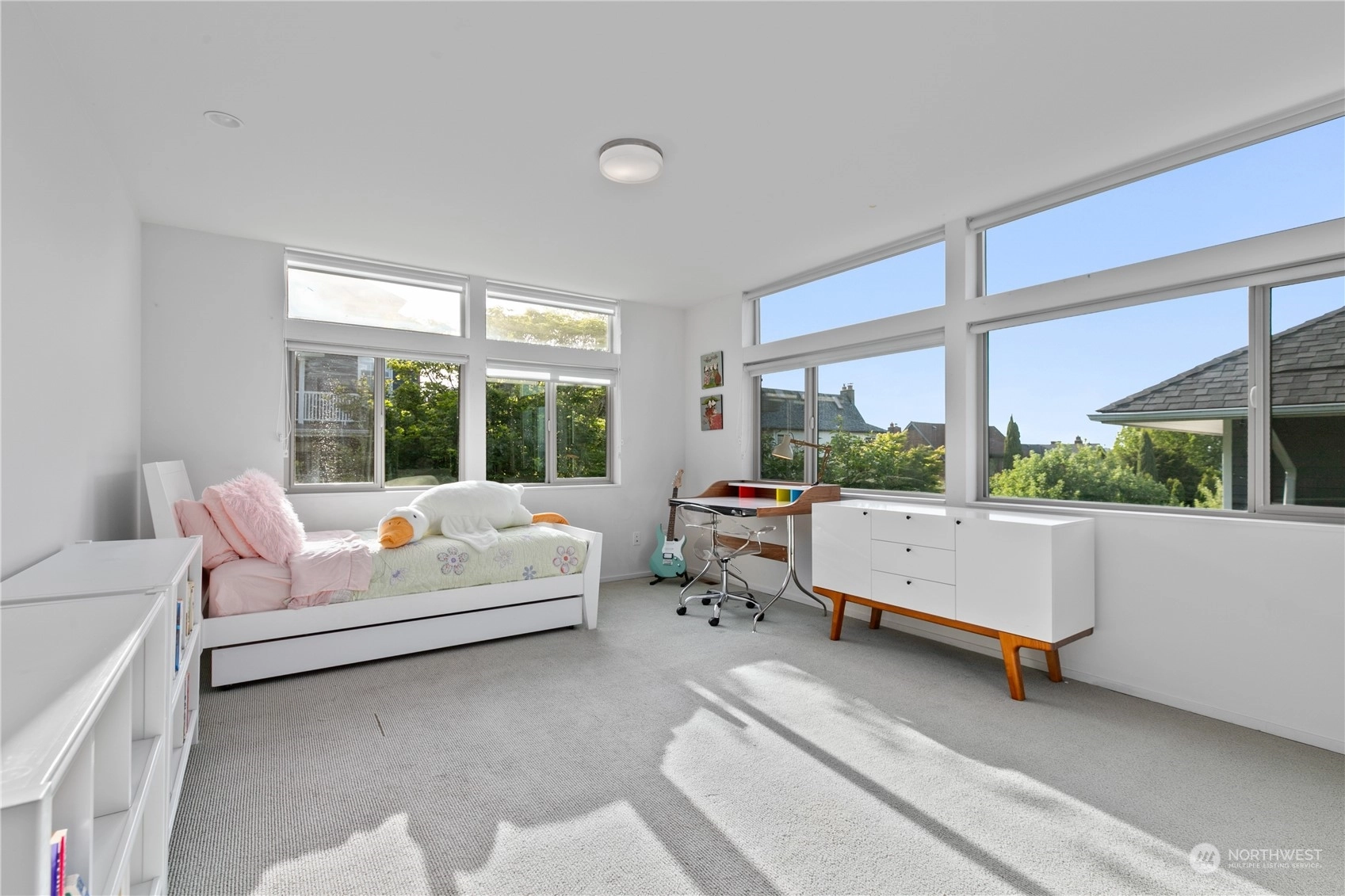 Coveted North Capitol Hill, Urban Oasis. Modern luxury meets convenience and views. Easy access to I-5, 520, Downtown or Eastside take your pick. Bars and restaurants minutes away. Seattle Prep, Bertschi Elementary and TOPS at Seward K-8. No winter blues here; picture windows fill the house with light all year long. The open-plan main floor makes entertaining a dream, brand new deck and folding wall of glass brings the outside in. 3 spacious bedrooms on 2nd floor provide room for everyone. Generous roof deck has cozy studio with amazing views, UW stadium, Lake WA, Cascades. 4th bedroom and Family room on the two-car garage level serves as an extra office, home theater or gym. Solar panels pay for roughly half of electrical needs.