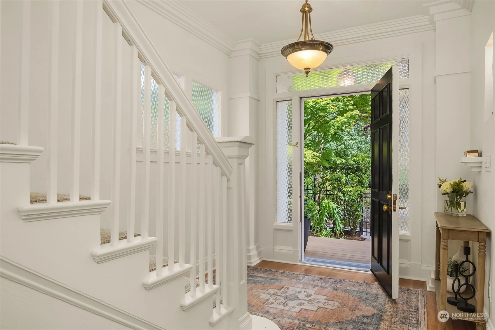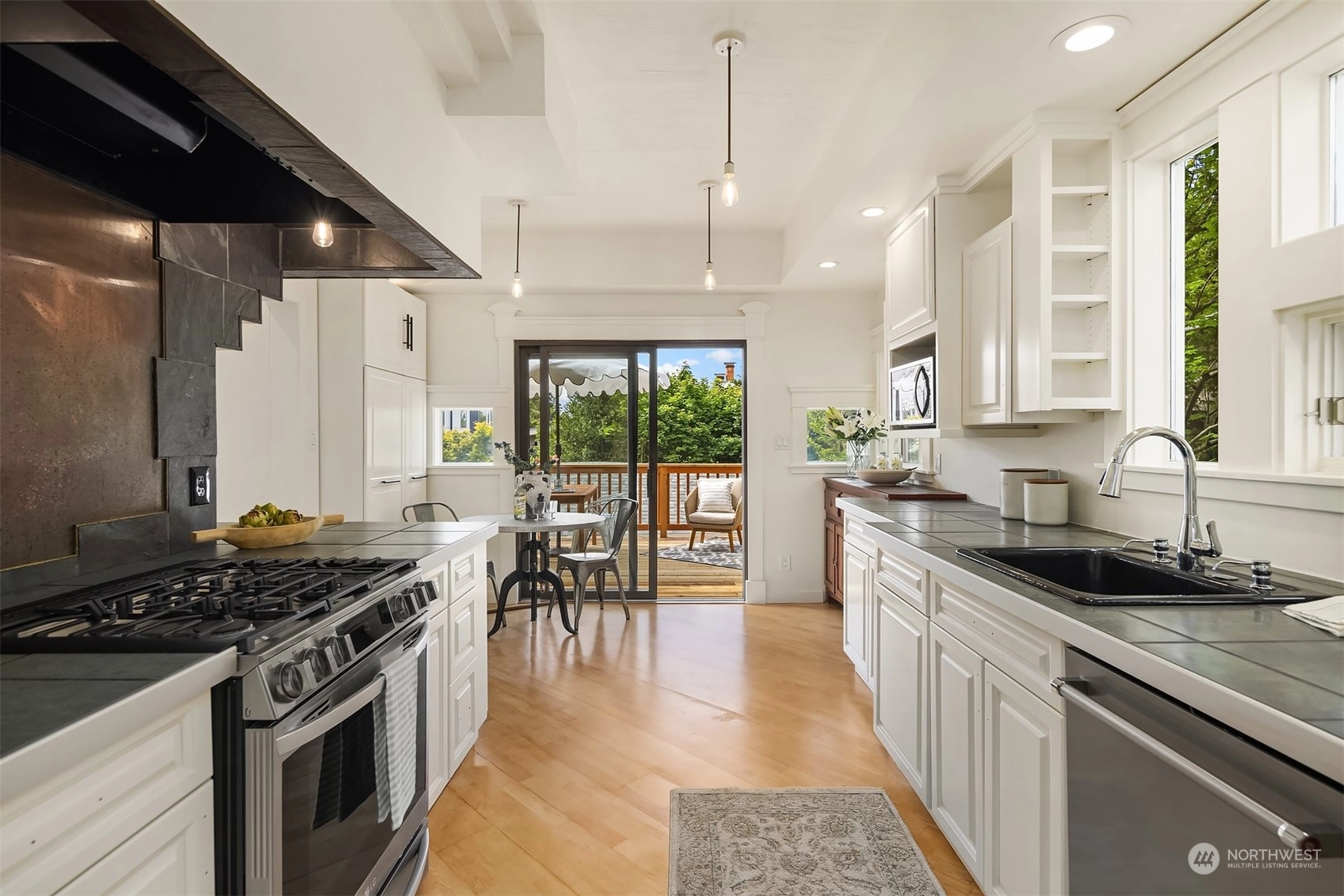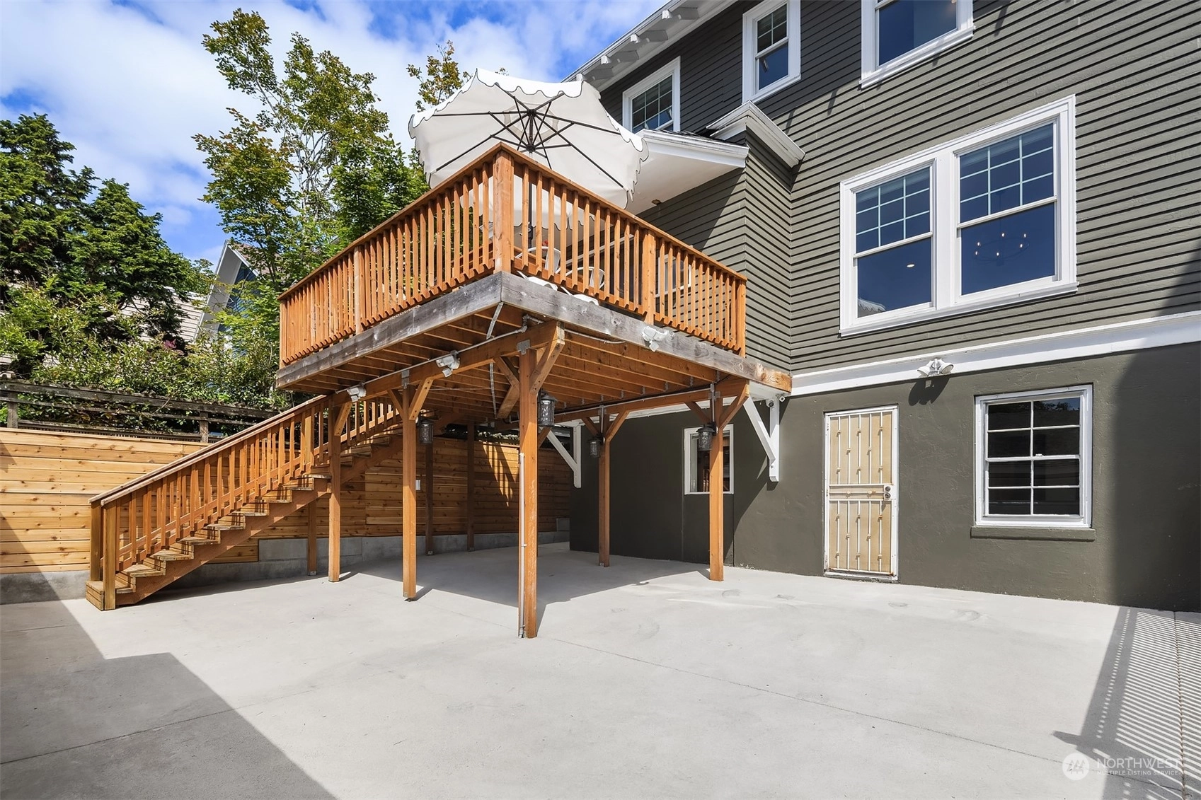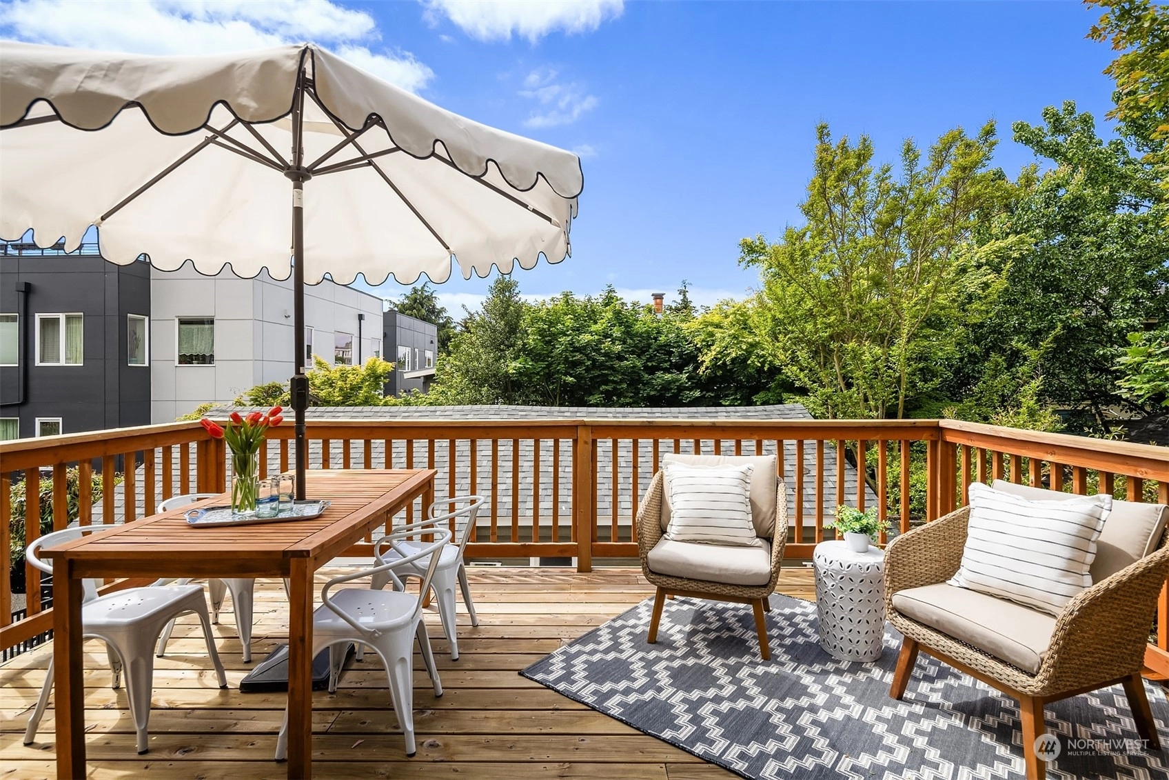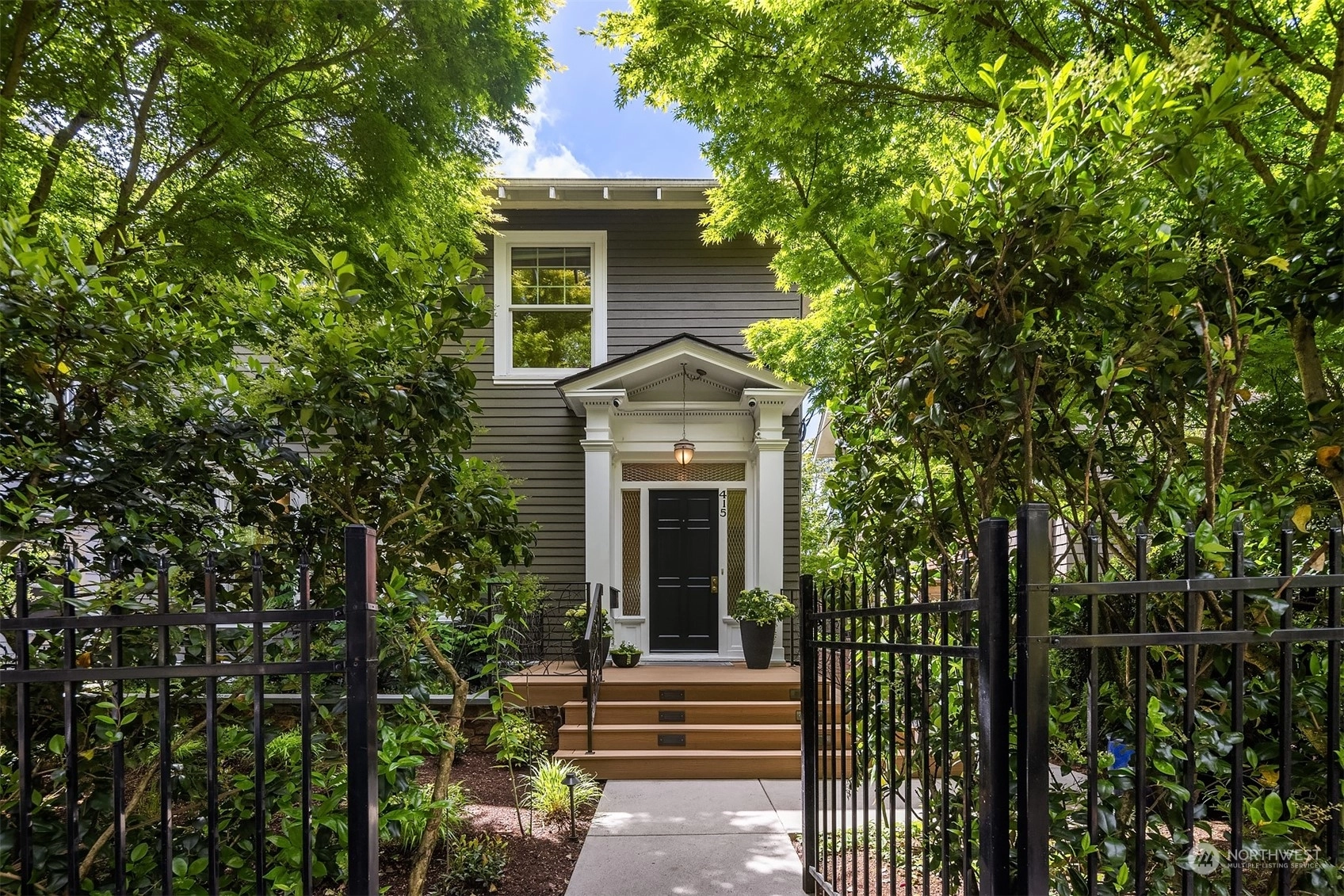 Welcome to this Capitol Hill charmer, where traditional elegance meets Art Deco-inspired details. The fully fenced property offers privacy while the lush greenery highlights the inviting entrance. Enjoy an oversized light filled living room with gas fireplace, spacious formal dining room, and a kitchen that opens to a west facing deck perfect for al fresco dining. The top floor has 3 bedrooms including the primary with en-suite bath, view of the space needle, and laundry. The lower level has a chic ADU suite, ideal for guests or an income generating opportunity. Parking is plentiful with two private gated parking spots and a garage with build-out potential. The home brings timeless sophistication to an already vibrant urban lifestyle.