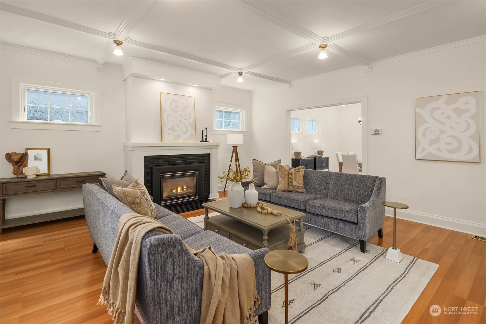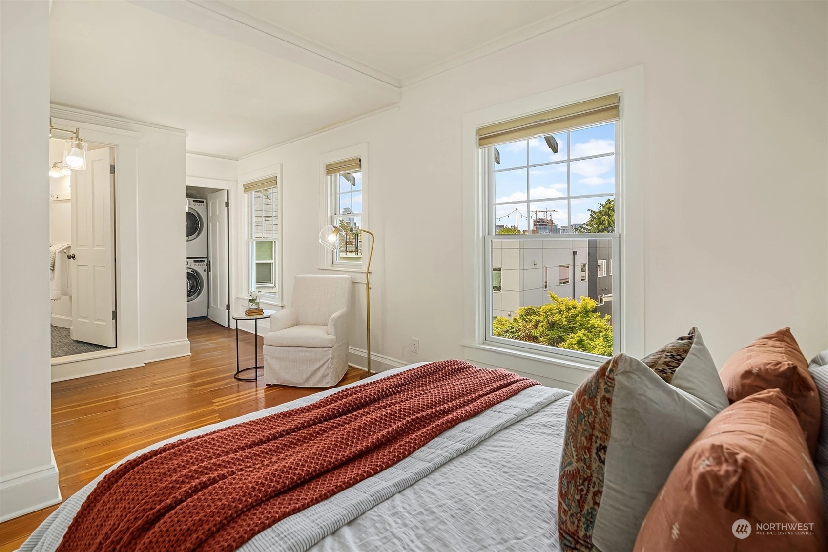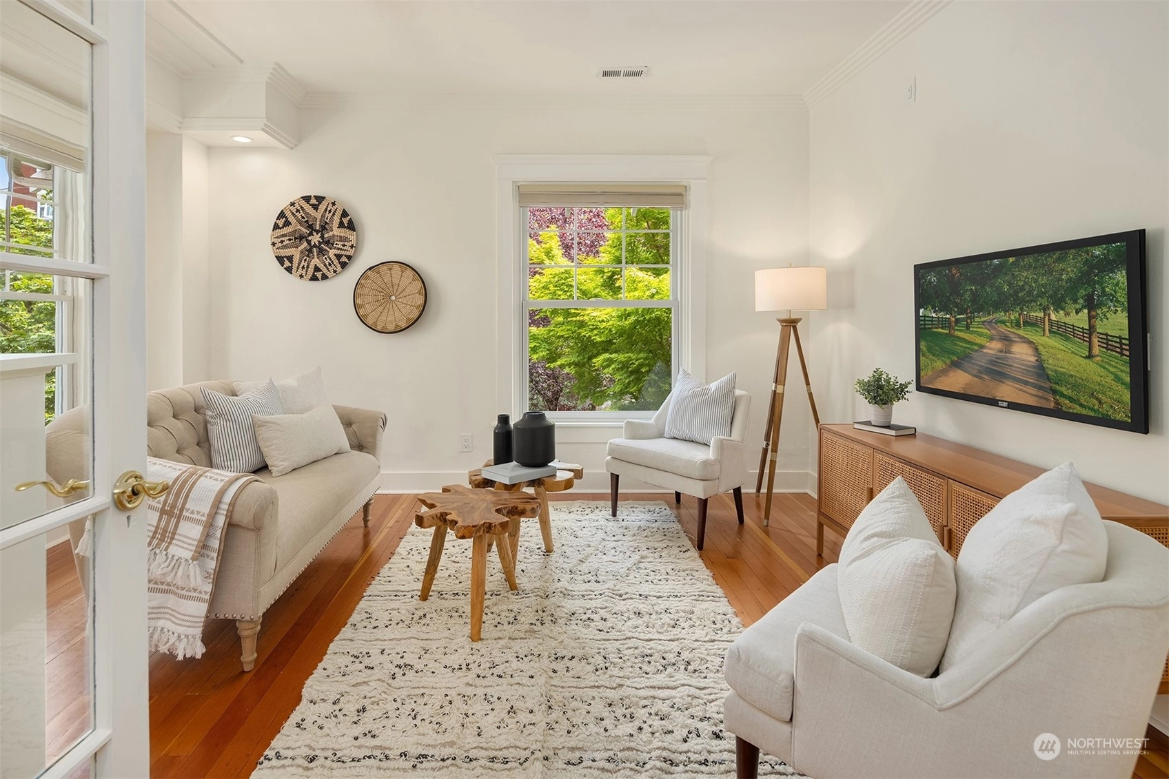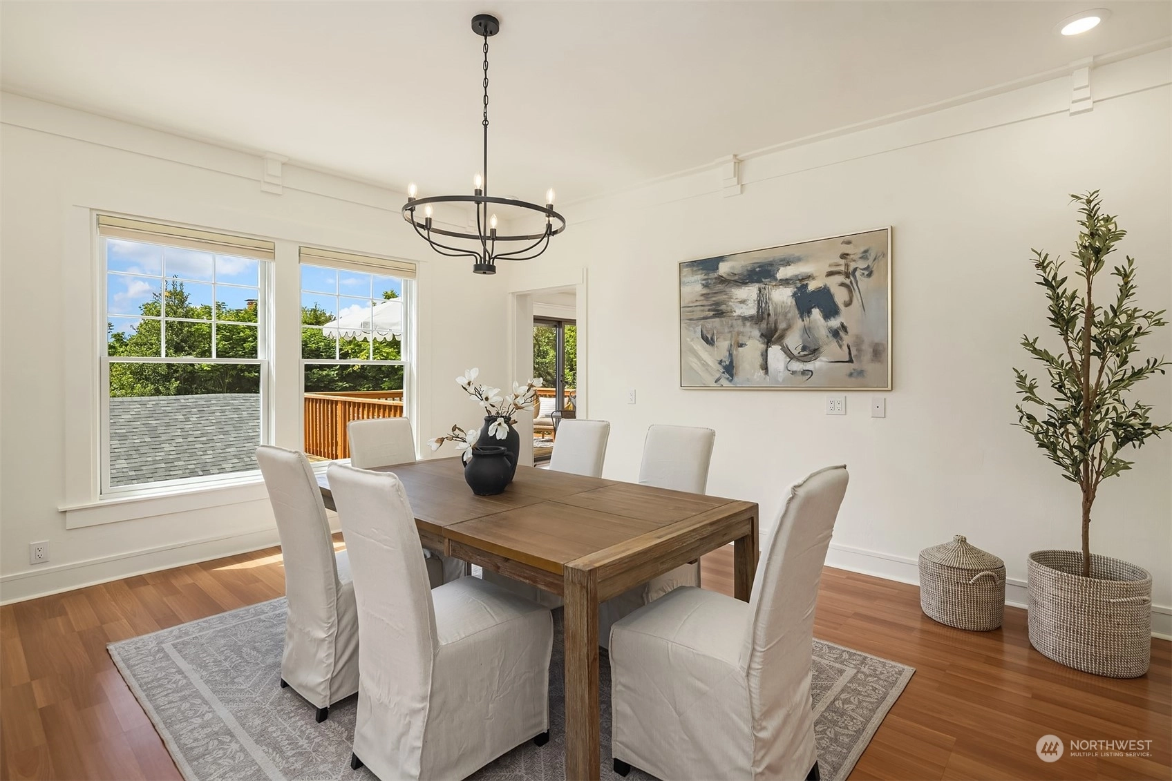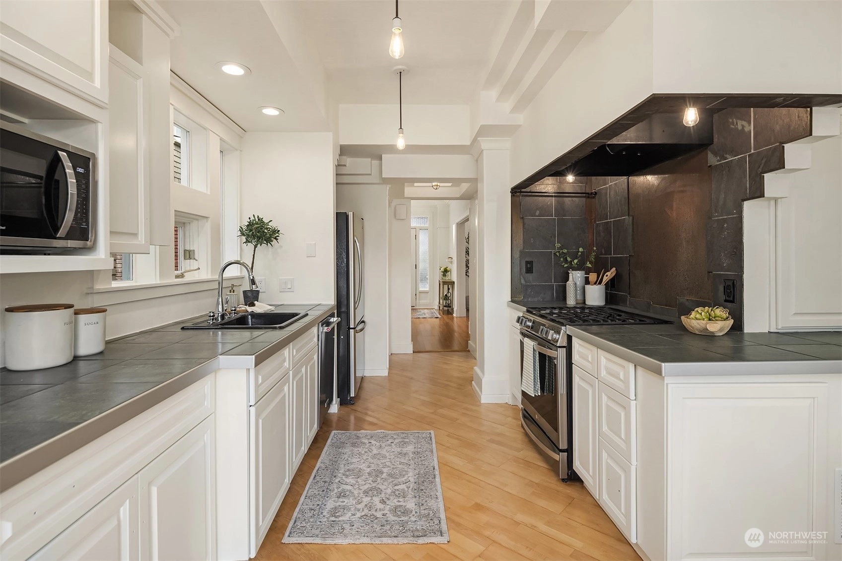 Welcome to this Capitol Hill charmer, where traditional elegance meets Art Deco-inspired details. The fully fenced property offers privacy while the lush greenery highlights the inviting entrance. Enjoy an oversized light filled living room with gas fireplace, spacious formal dining room, and a kitchen that opens to a west facing deck perfect for al fresco dining. The top floor has 3 bedrooms including the primary with en-suite bath, view of the space needle, and laundry. The lower level has a chic ADU suite, ideal for guests or an income generating opportunity. Parking is plentiful with two private gated parking spots and a garage with build-out potential. The home brings timeless sophistication to an already vibrant urban lifestyle.