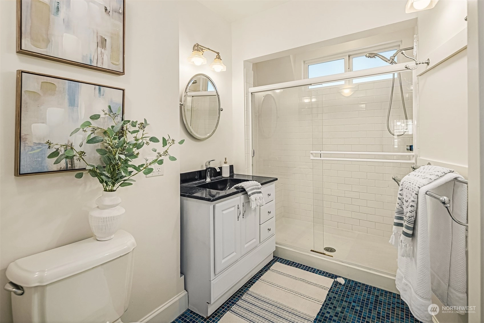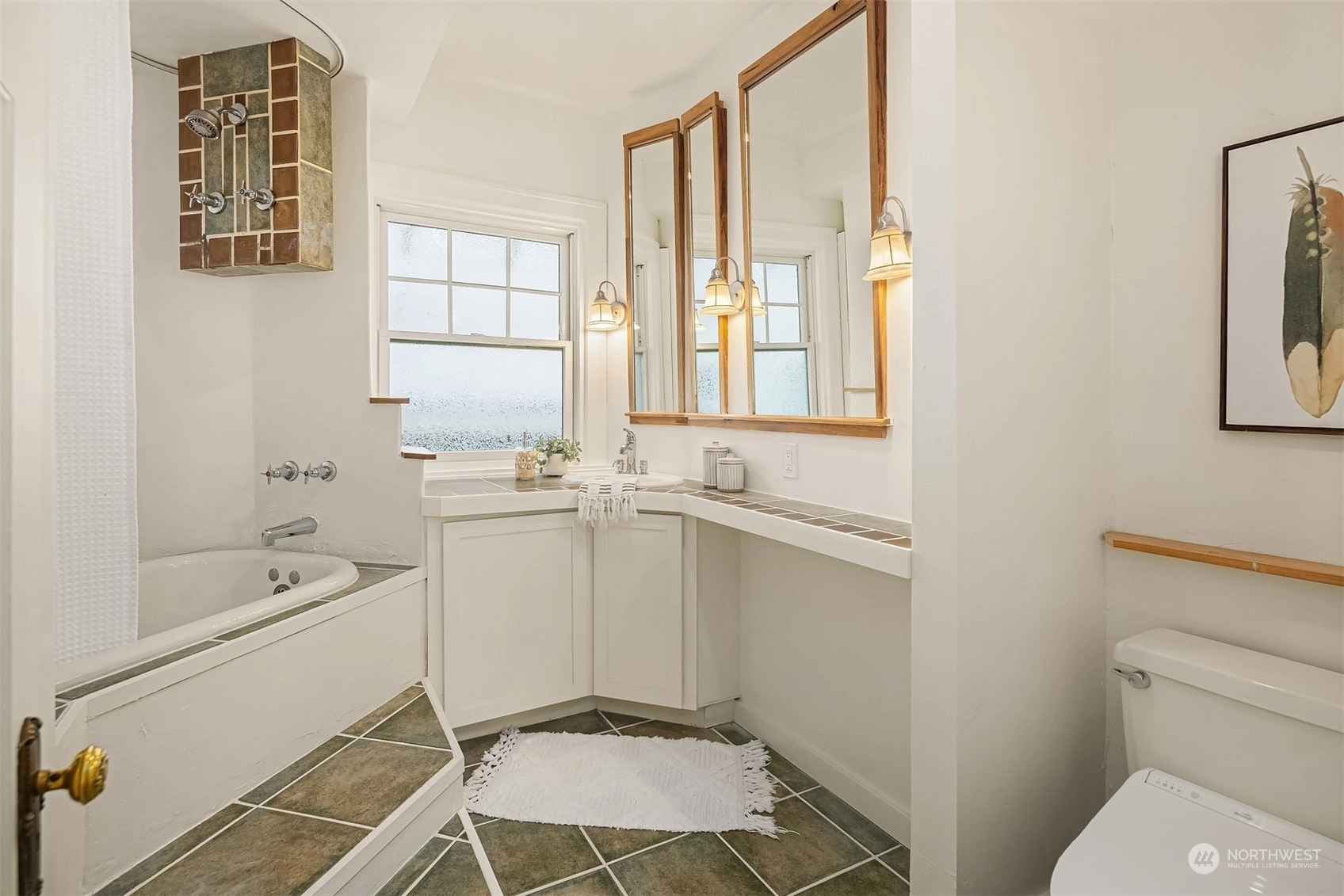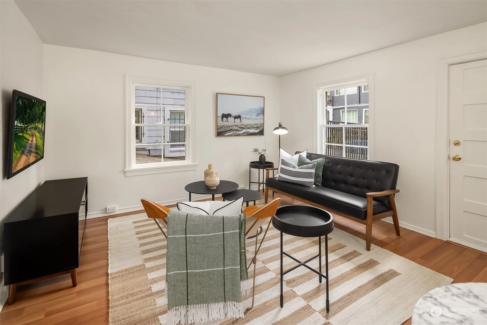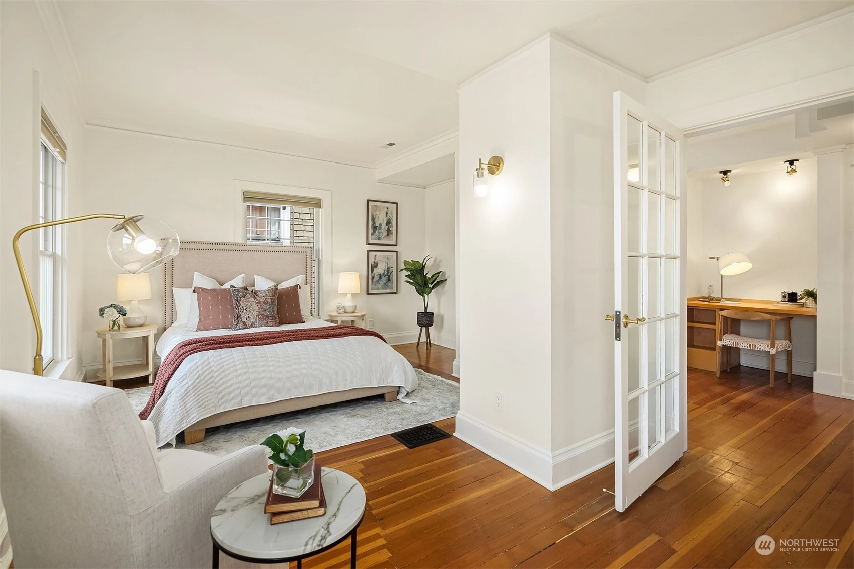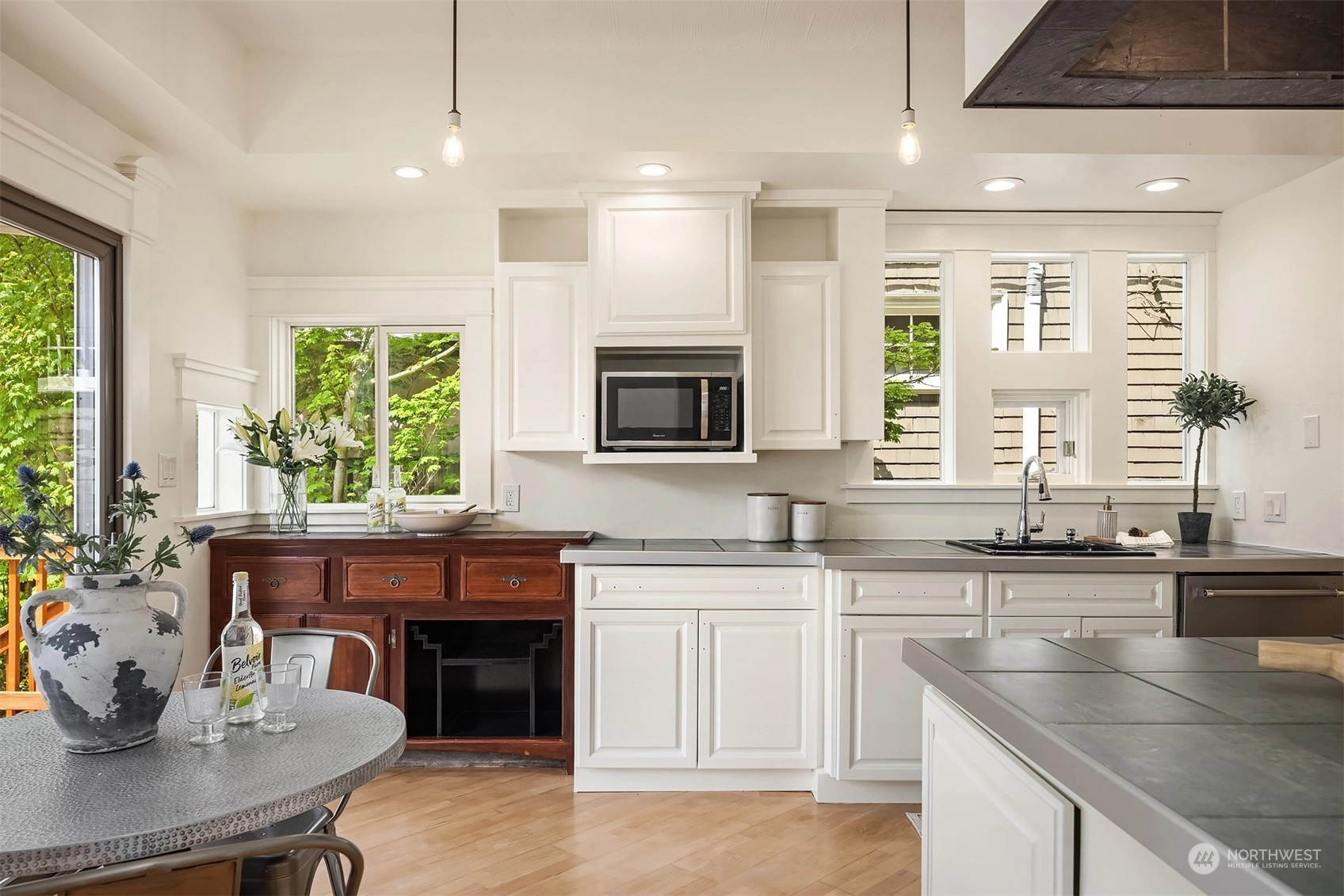 Welcome to this Capitol Hill charmer, where traditional elegance meets Art Deco-inspired details. The fully fenced property offers privacy while the lush greenery highlights the inviting entrance. Enjoy an oversized light filled living room with gas fireplace, spacious formal dining room, and a kitchen that opens to a west facing deck perfect for al fresco dining. The top floor has 3 bedrooms including the primary with en-suite bath, view of the space needle, and laundry. The lower level has a chic ADU suite, ideal for guests or an income generating opportunity. Parking is plentiful with two private gated parking spots and a garage with build-out potential. The home brings timeless sophistication to an already vibrant urban lifestyle.