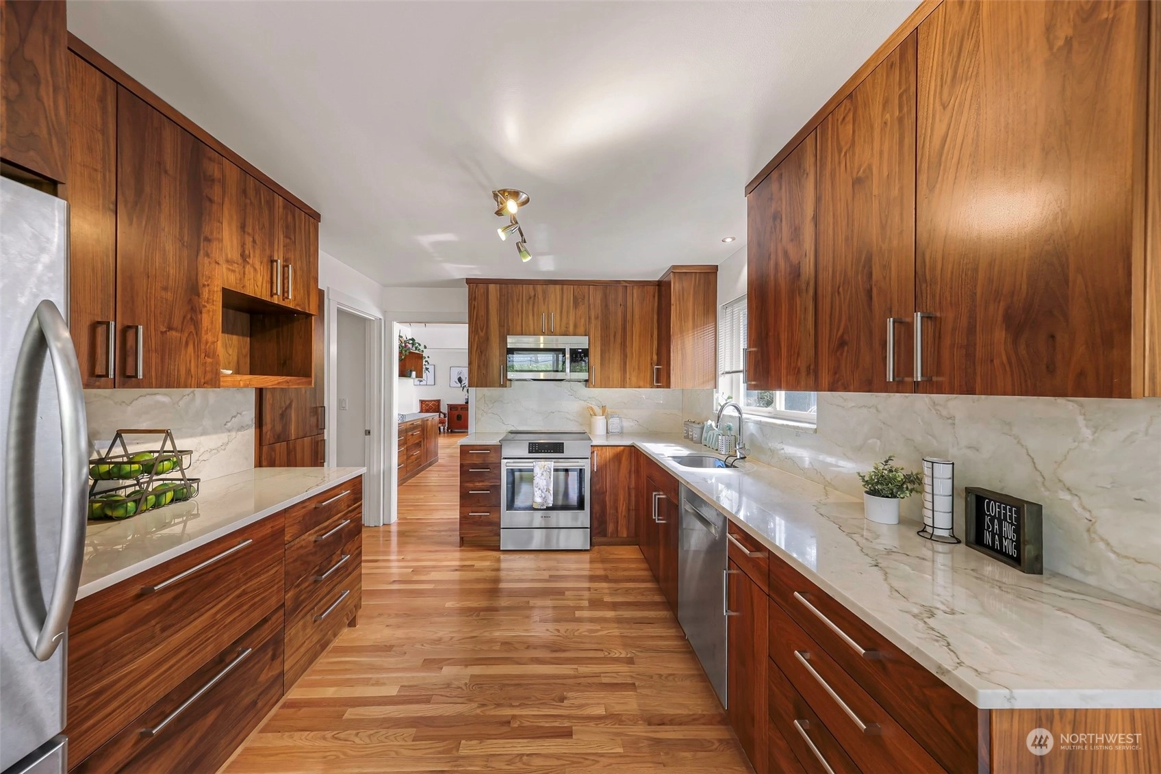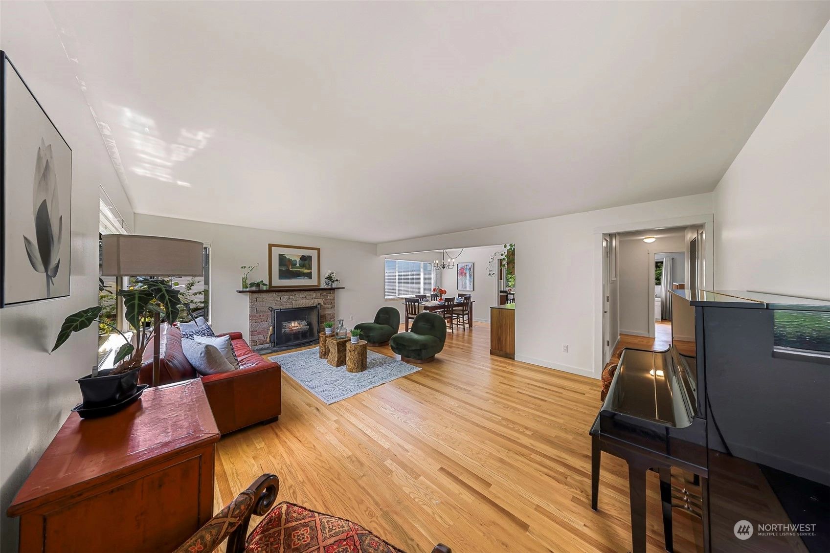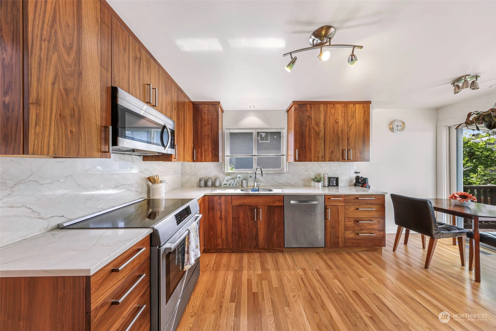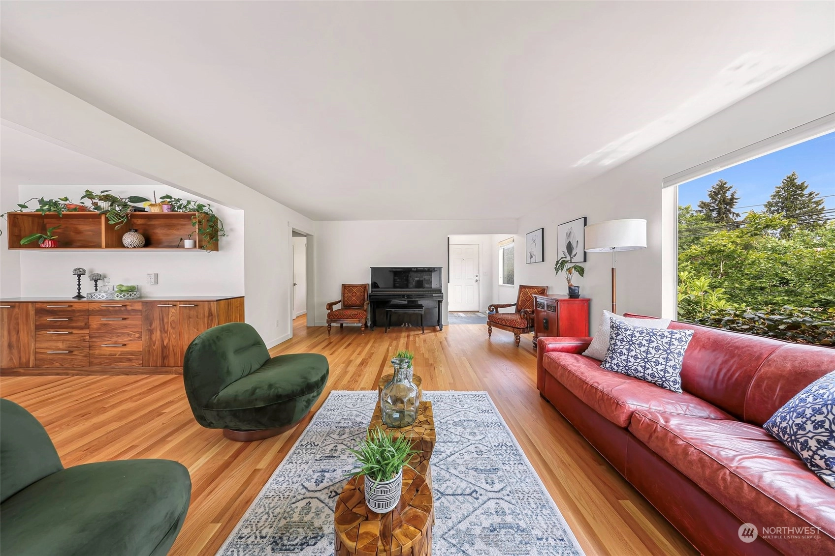 Welcome to this spacious, updated mid-century modern home. Gleaming refinished hardwoods on the main & high quality LVP flooring in lower levels. Chef's kitchen w/top-quality Quartzite countertops, premium black walnut cabinets & stainless-steel appliances. Big sliding doors lead to the large back patio, perfect for entertaining. Rare 3 bedrooms on the main floor. A separate entry lower level w/a bedroom, rec room/office, kitchenette & a full bath, perfect for guests or extended living. A level yard w/mature fruit trees & hedges & a long driveway w/ample parking space. Just steps away from Matthews Beach & the Burke Gilman trail, a walking distance to eateries, coffee shops & grocery stores. Top ranked schools. Easy access to freeway.