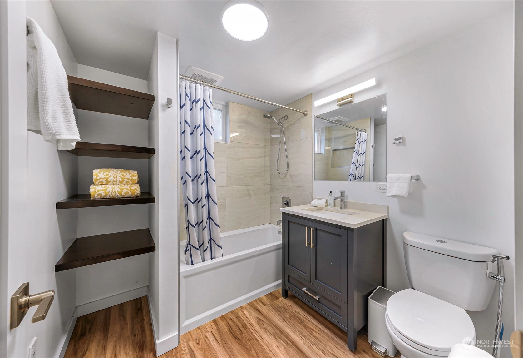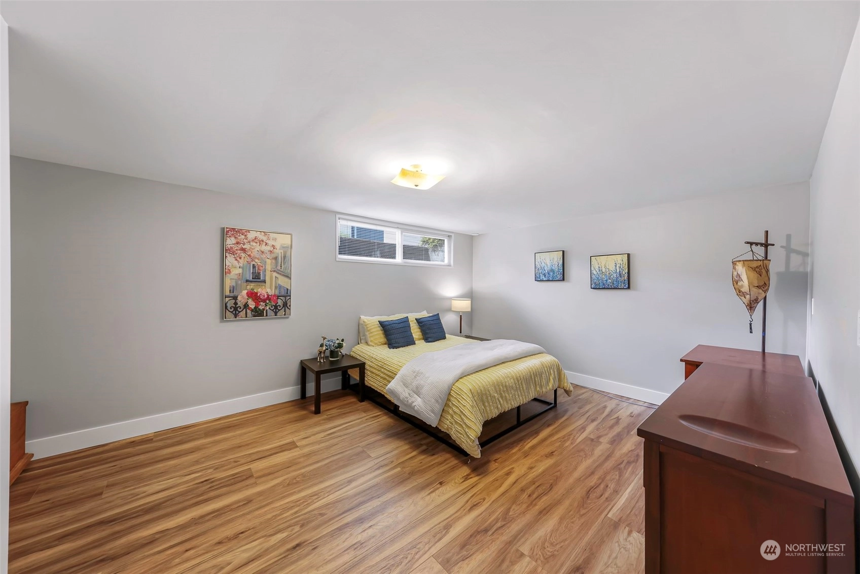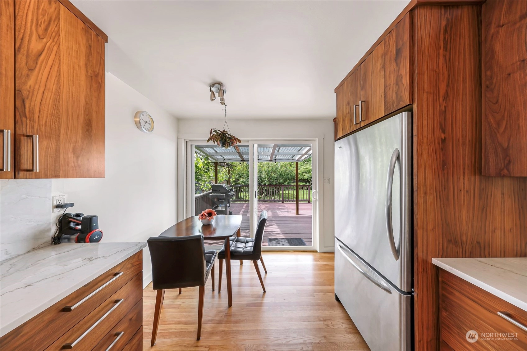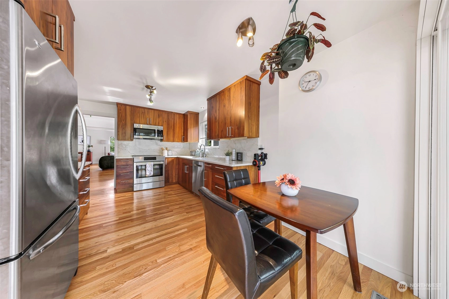 Welcome to this spacious, updated mid-century modern home. Gleaming refinished hardwoods on the main & high quality LVP flooring in lower levels. Chef's kitchen w/top-quality Quartzite countertops, premium black walnut cabinets & stainless-steel appliances. Big sliding doors lead to the large back patio, perfect for entertaining. Rare 3 bedrooms on the main floor. A separate entry lower level w/a bedroom, rec room/office, kitchenette & a full bath, perfect for guests or extended living. A level yard w/mature fruit trees & hedges & a long driveway w/ample parking space. Just steps away from Matthews Beach & the Burke Gilman trail, a walking distance to eateries, coffee shops & grocery stores. Top ranked schools. Easy access to freeway.