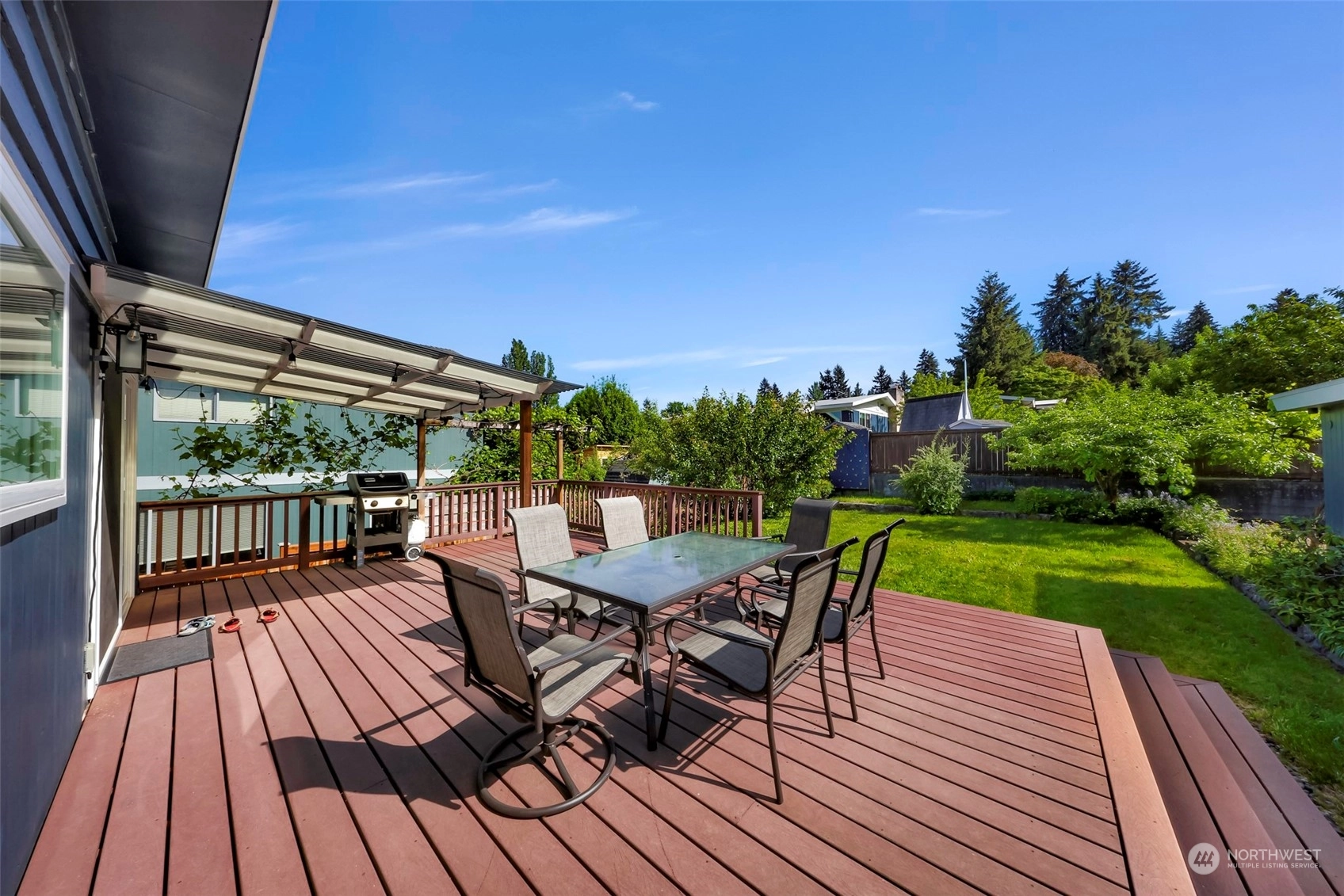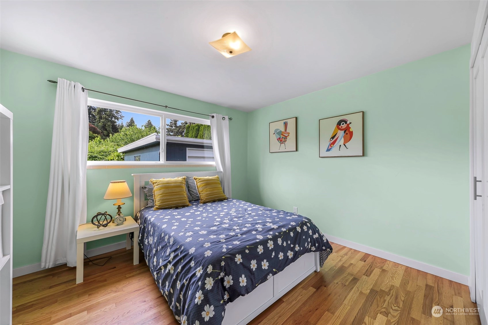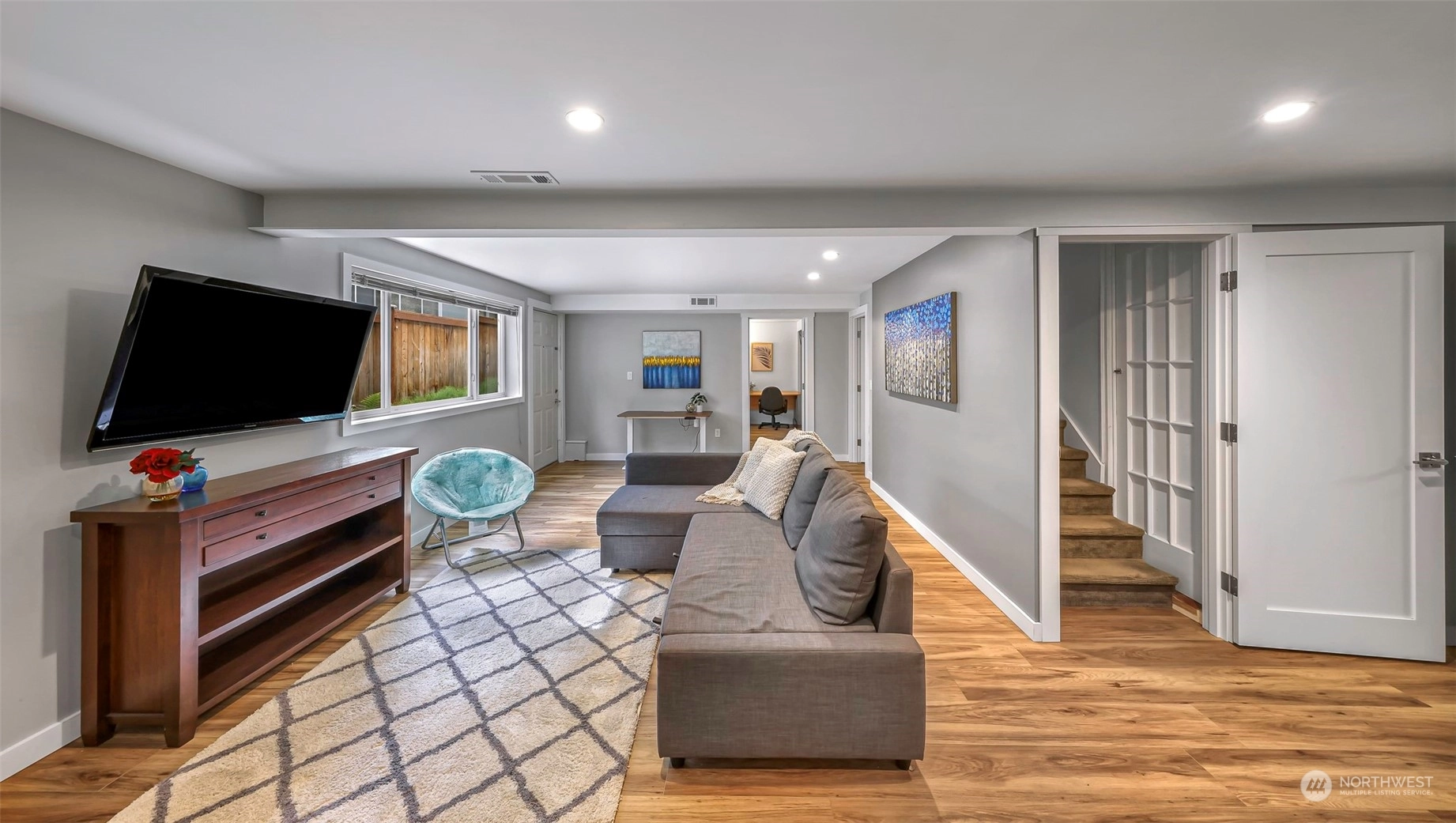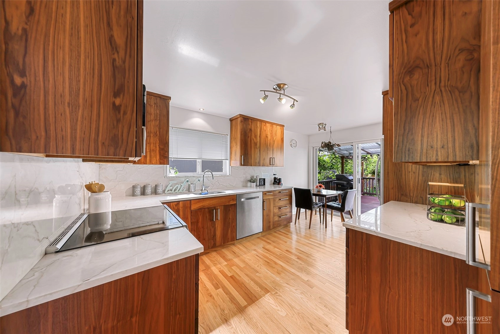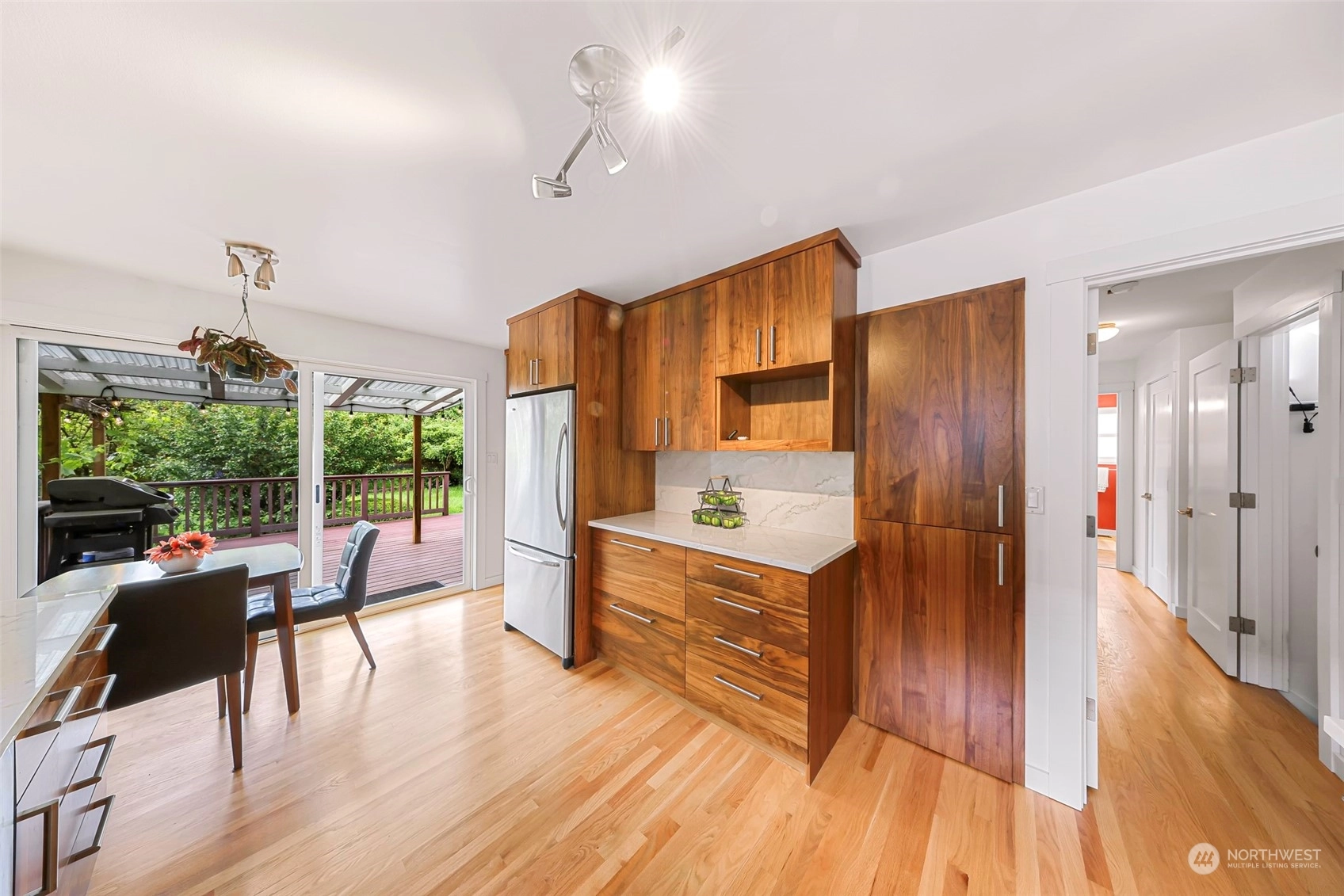 Welcome to this spacious, updated mid-century modern home. Gleaming refinished hardwoods on the main & high quality LVP flooring in lower levels. Chef's kitchen w/top-quality Quartzite countertops, premium black walnut cabinets & stainless-steel appliances. Big sliding doors lead to the large back patio, perfect for entertaining. Rare 3 bedrooms on the main floor. A separate entry lower level w/a bedroom, rec room/office, kitchenette & a full bath, perfect for guests or extended living. A level yard w/mature fruit trees & hedges & a long driveway w/ample parking space. Just steps away from Matthews Beach & the Burke Gilman trail, a walking distance to eateries, coffee shops & grocery stores. Top ranked schools. Easy access to freeway.