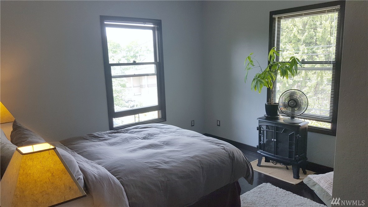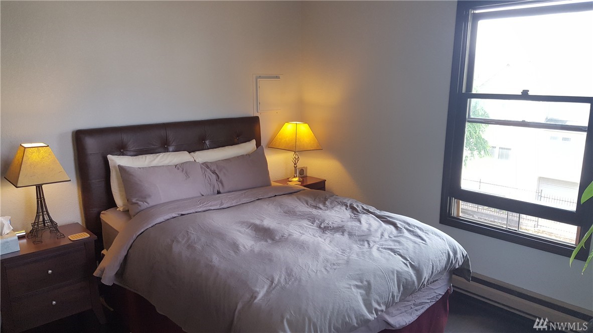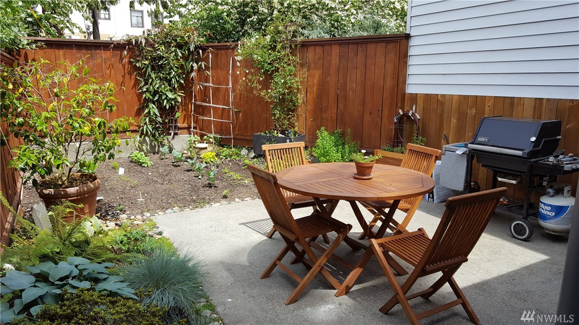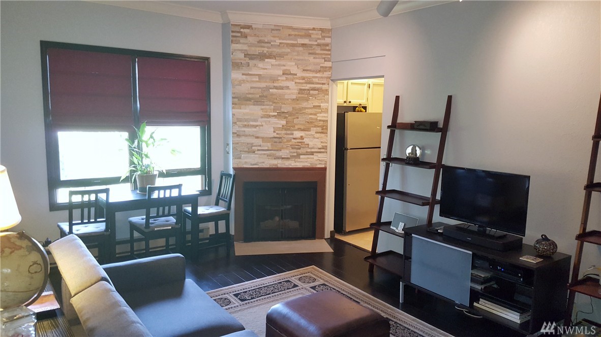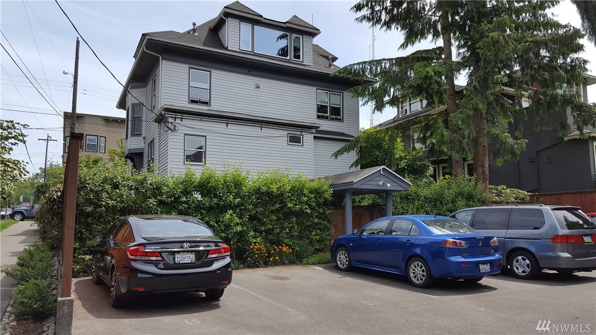 Charming corner unit in historic 116 year old building. View of Space Needle, mntns & Bay. Beautifully maintained craftsman with fenced patio & BBQ area with gorgeous dogwoods. Stainless Steel appliances & granite countertop. Living/dining area with cozy gas FP. Laundry & storage. Convenient location & unbeatable walkability, near multiple bus lines, light rail, dining, shops, food co-op, parks & more. 1 Pet ok. Secure intercom entry. Assigned parking. Low HOA dues! No assessments!