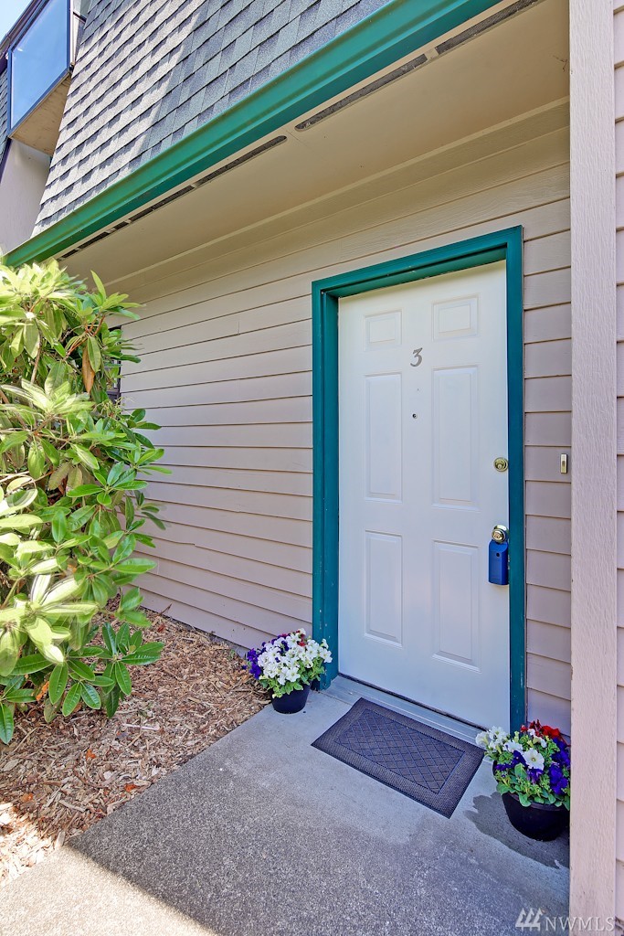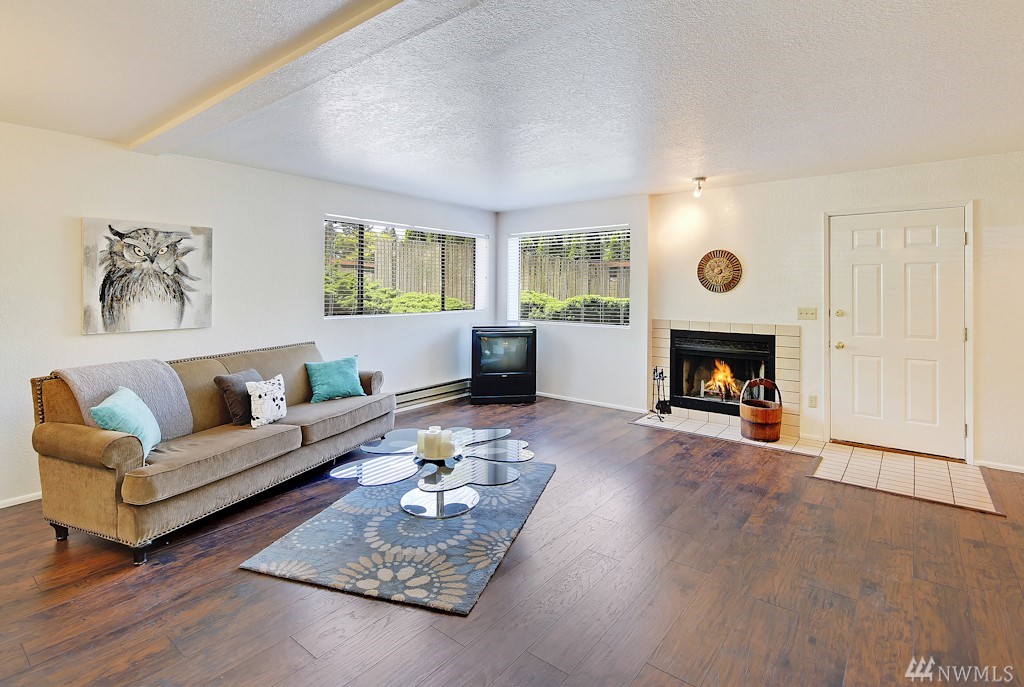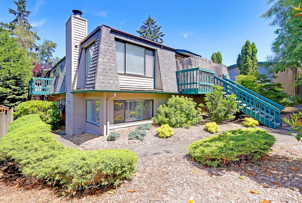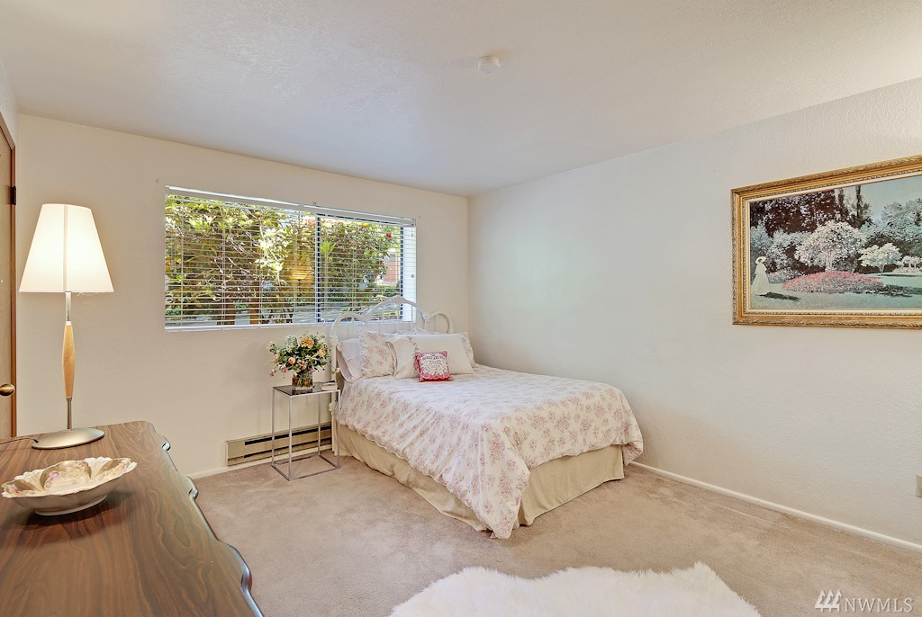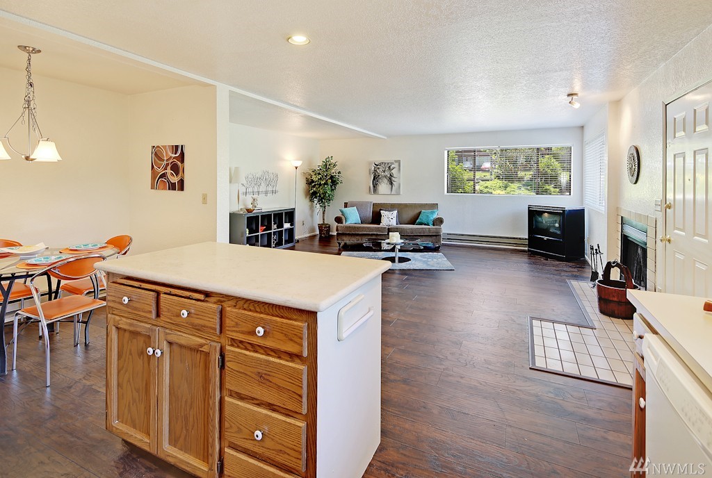 Location! Location! Beautiful close in, ground floor, light filled, corner Shoreline condo! Large Master bedroom with walk-in closet and en suite bathroom. New wide-plank laminate flooring, updated paint, light fixtures, blinds, master and kitchen island granite tops. Great room concept with Kitchen, Dining, Living room, Entry. Rare- Private garage for storage and entrance! Wood burning fireplace and amazing Shoreline Schools/parks. Easy commute. This one won't last!!