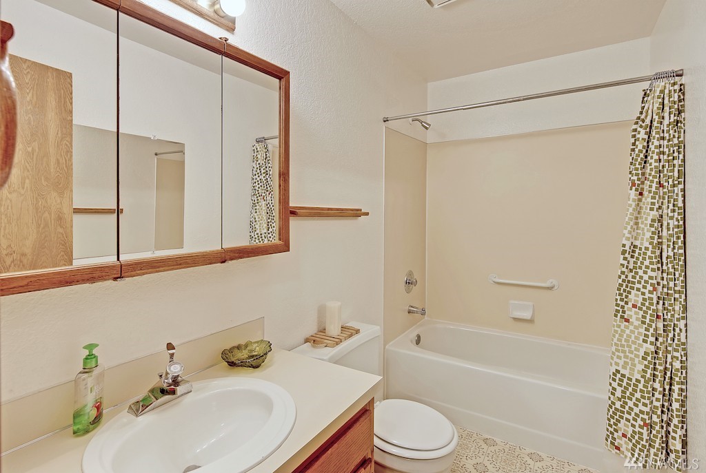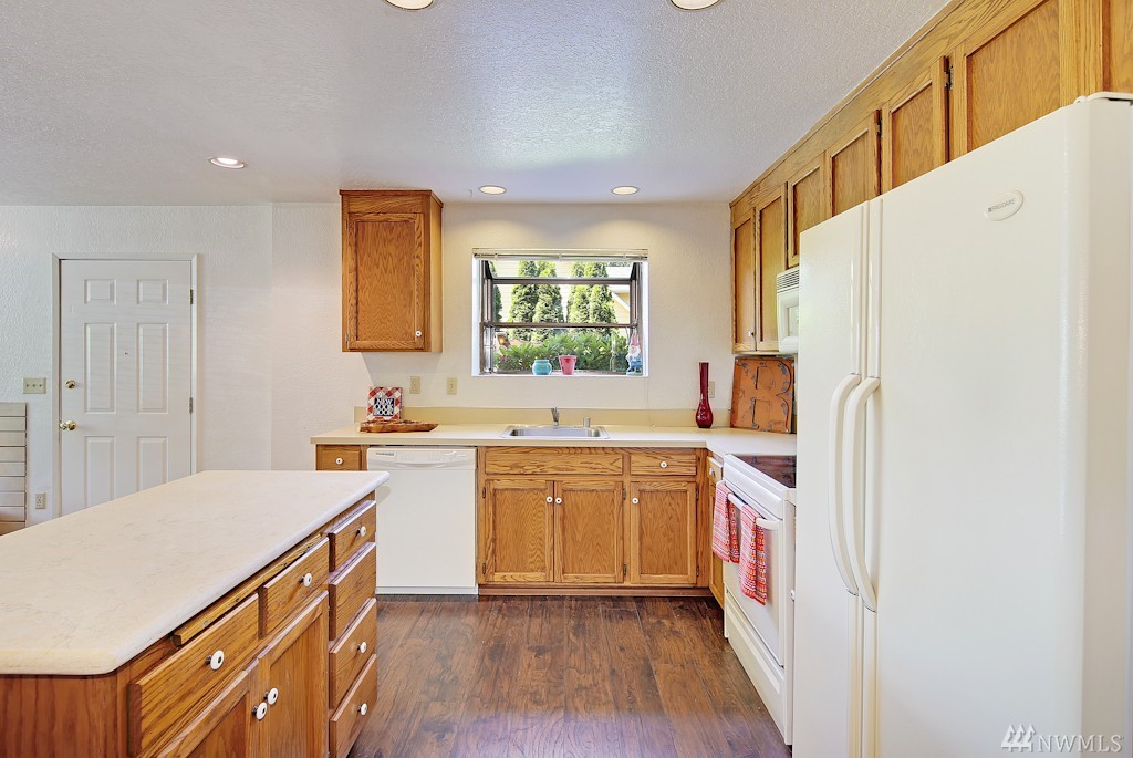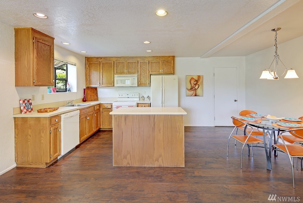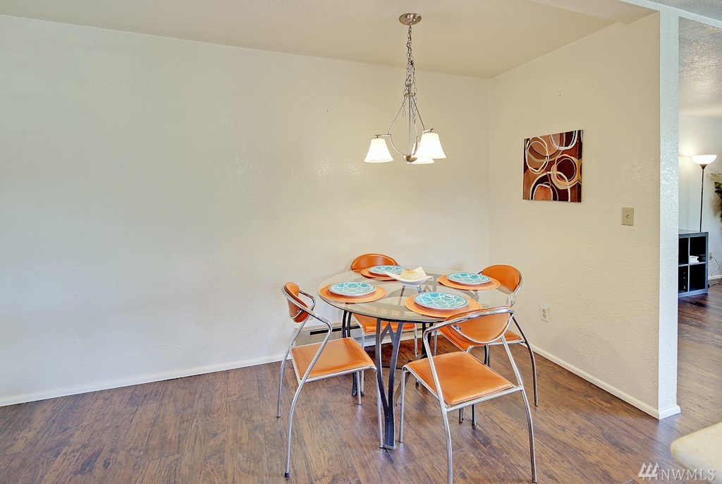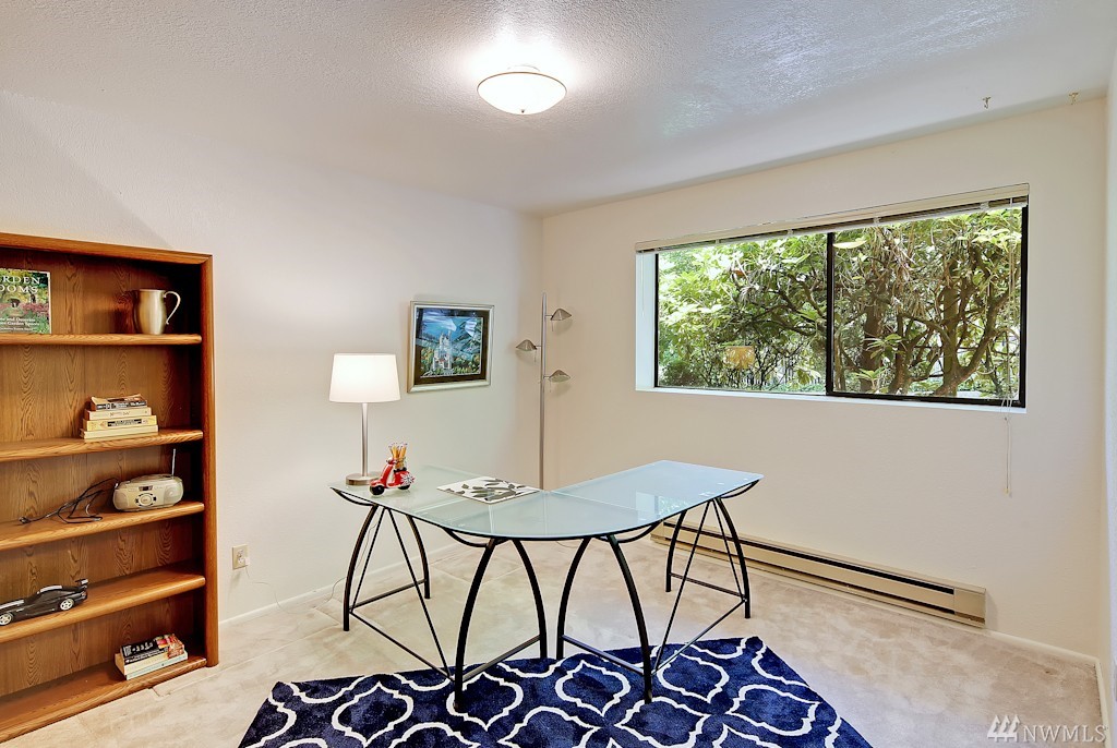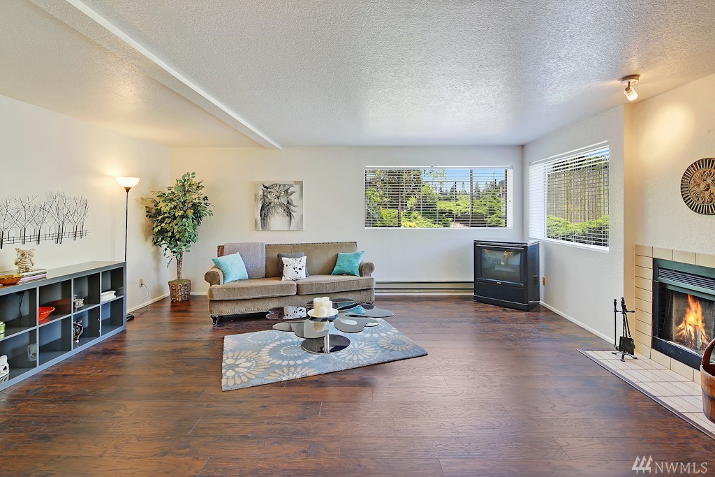 Location! Location! Beautiful close in, ground floor, light filled, corner Shoreline condo! Large Master bedroom with walk-in closet and en suite bathroom. New wide-plank laminate flooring, updated paint, light fixtures, blinds, master and kitchen island granite tops. Great room concept with Kitchen, Dining, Living room, Entry. Rare- Private garage for storage and entrance! Wood burning fireplace and amazing Shoreline Schools/parks. Easy commute. This one won't last!!