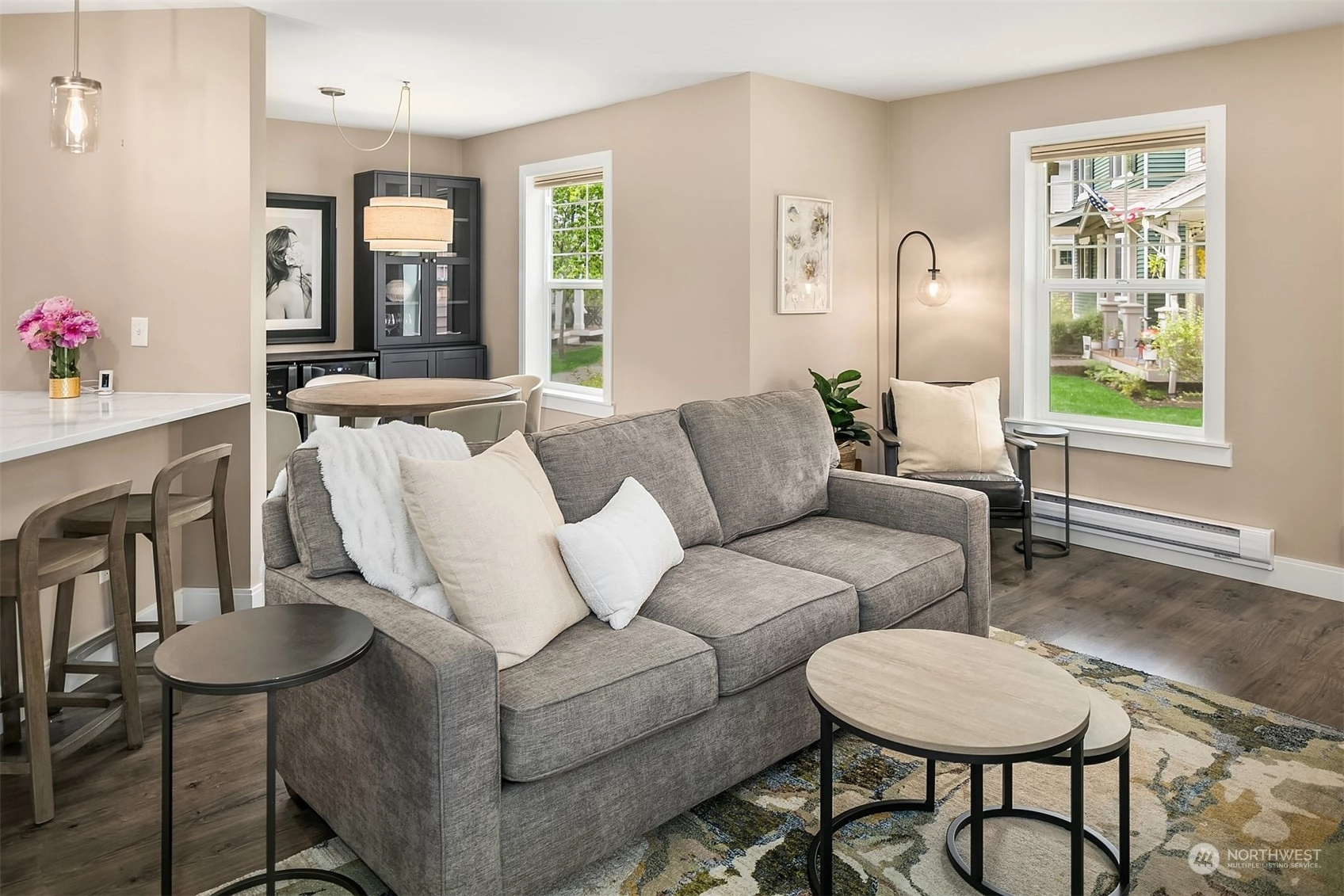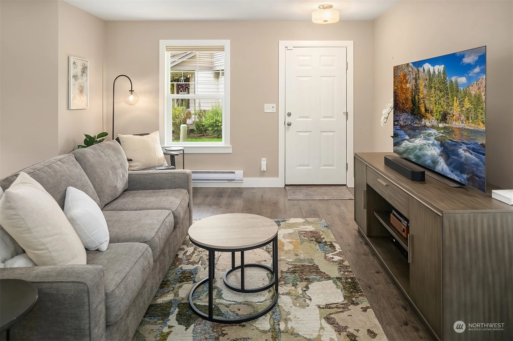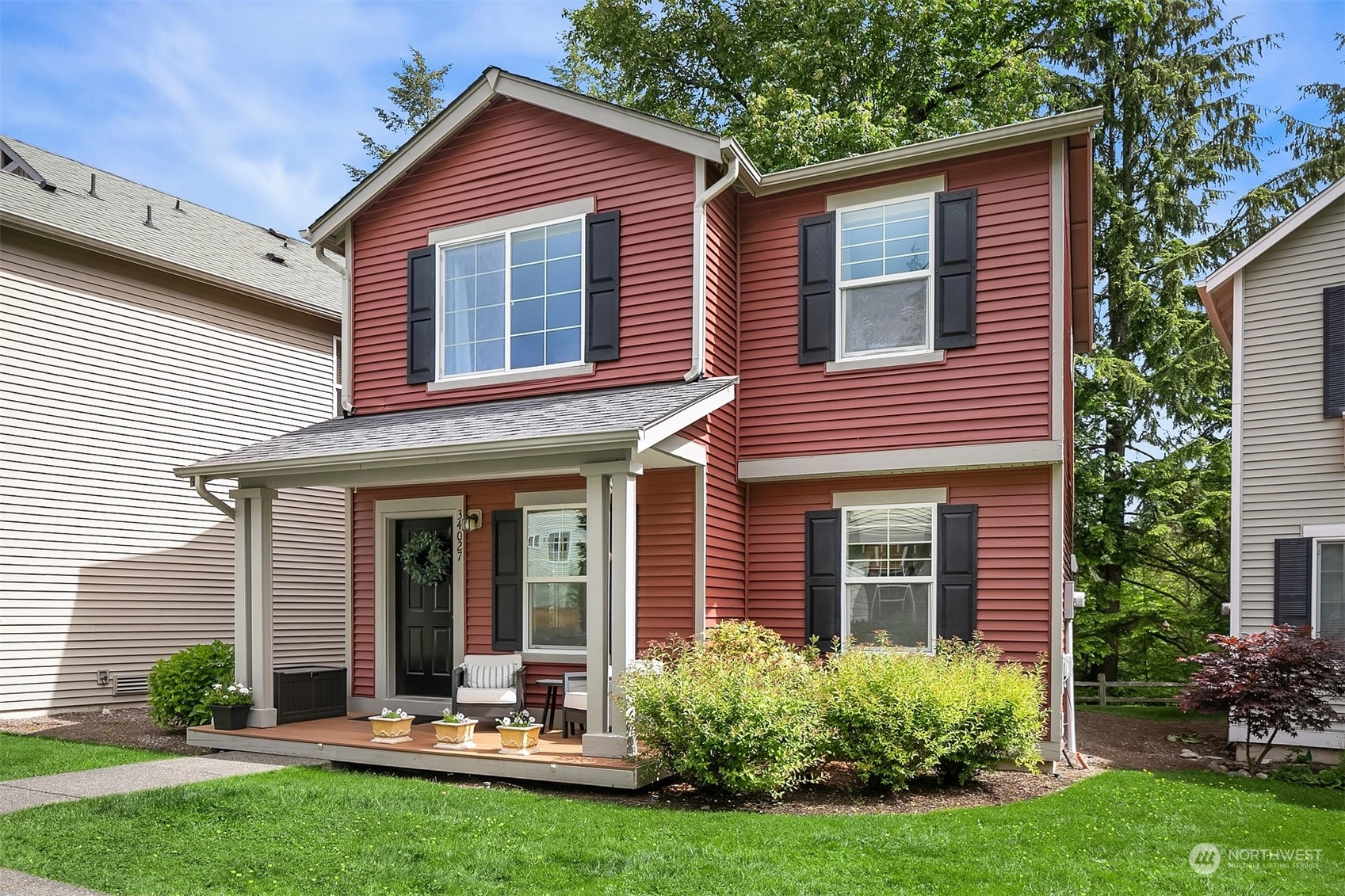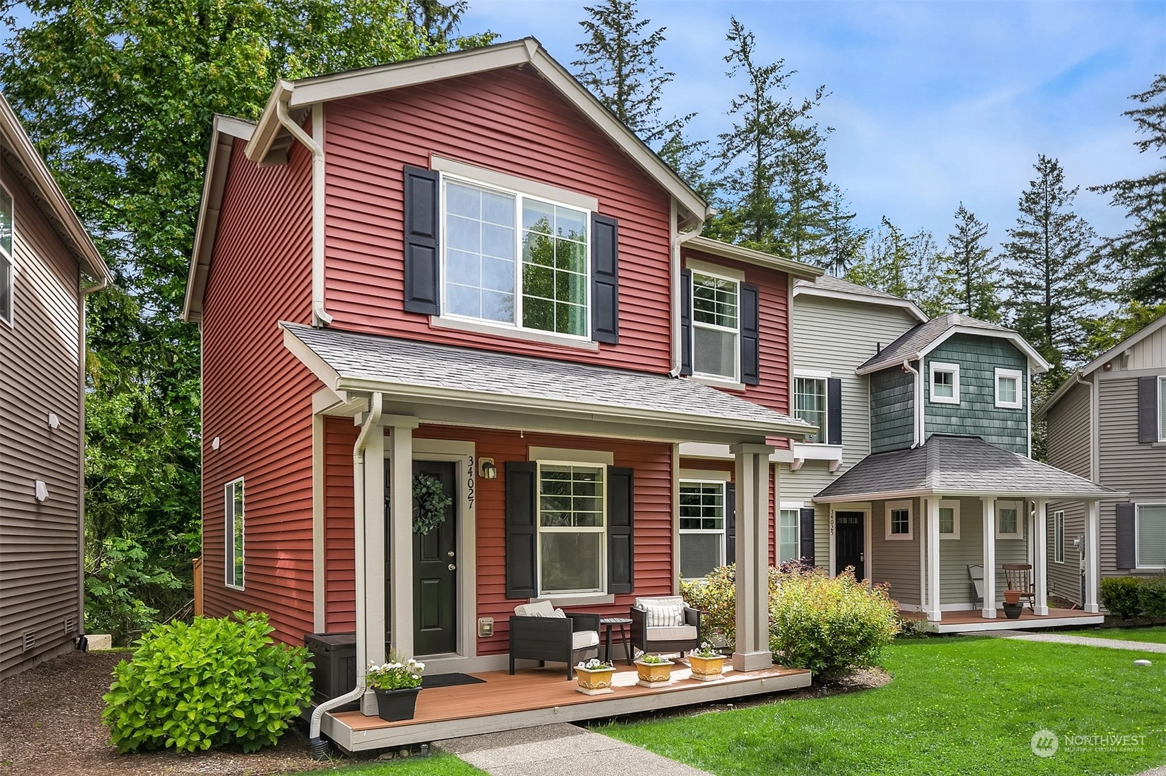 Nestled against a lush greenbelt, this Snoqualmie Ridge cottage offers unparalleled privacy and tranquility. Step inside to a fully updated interior with engineered flooring and high-end finishes throughout. The spacious light-filled living area features an open floor plan seamlessly connecting the kitchen, living and dining spaces. The gourmet kitchen boasts quartz countertops, a matching slab backsplash, and an updated induction range. Custom closet organization in the pantry and primary closets maximize storage and function. Elegant millwork adds a touch of sophistication and craftsmanship to this cohesive design. Enjoy access to top-rated schools, parks, and trails in this highly sought-after community. TWO parking spots!