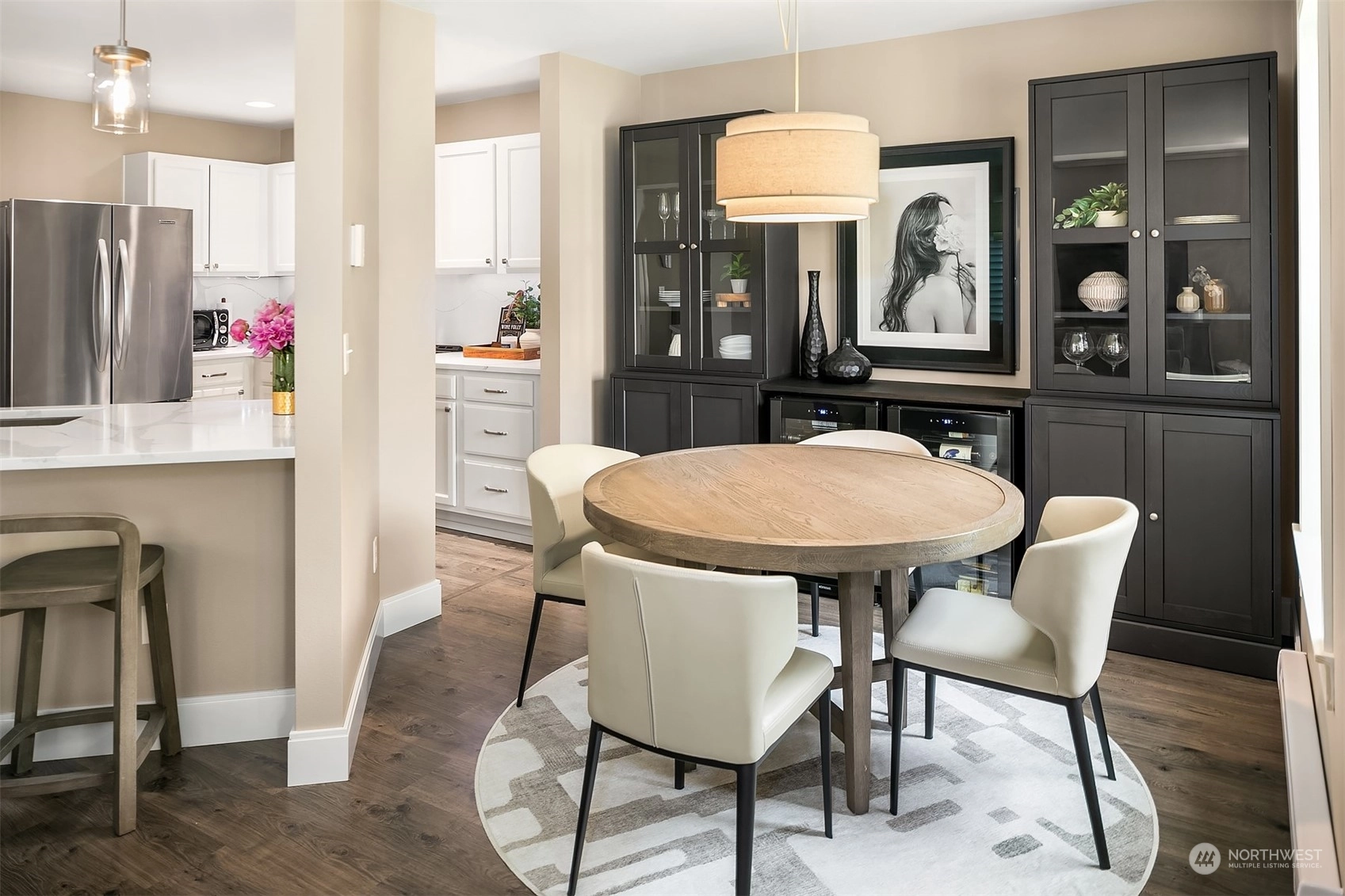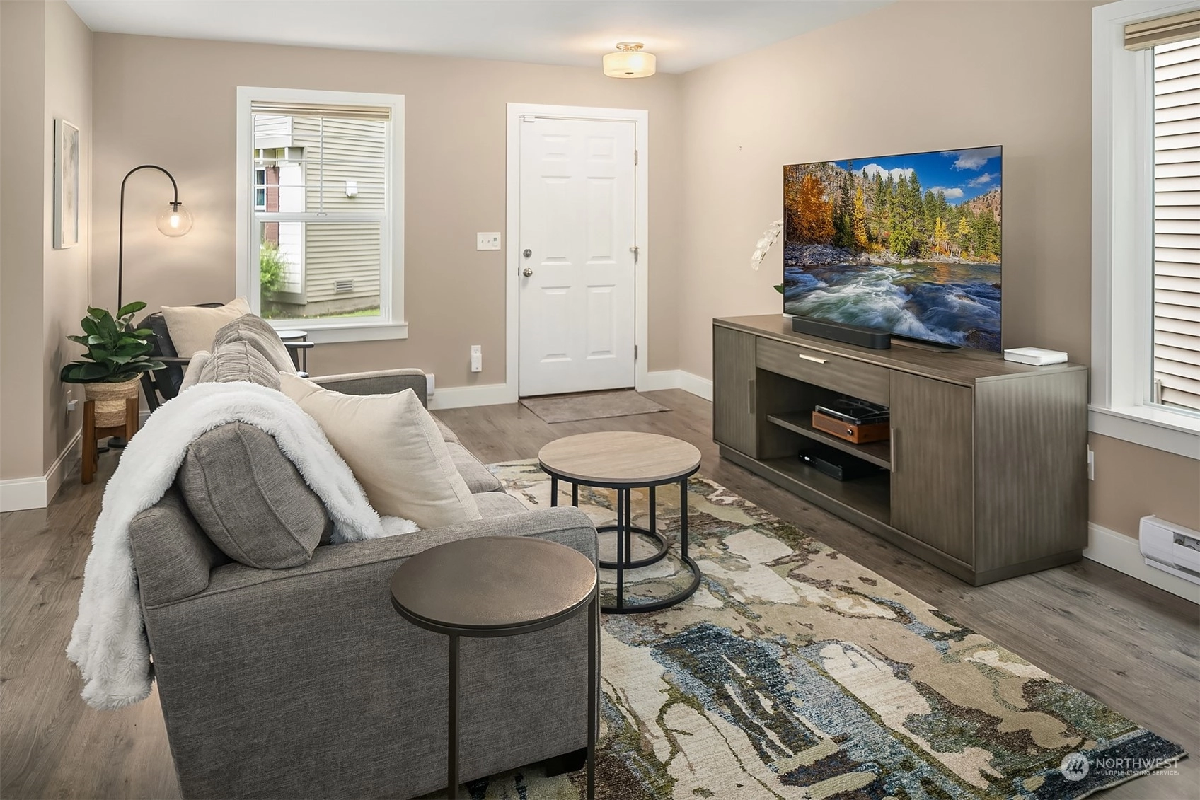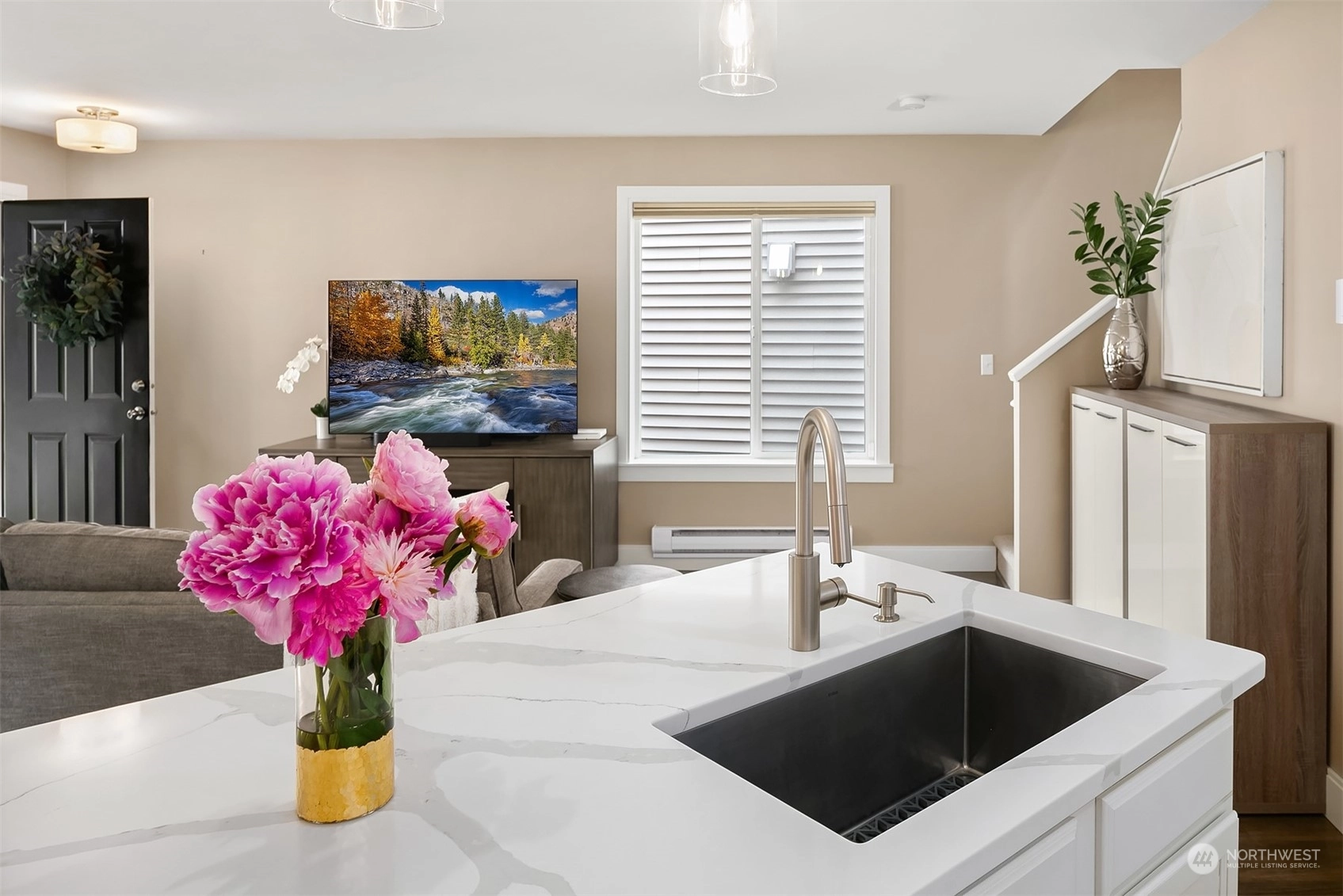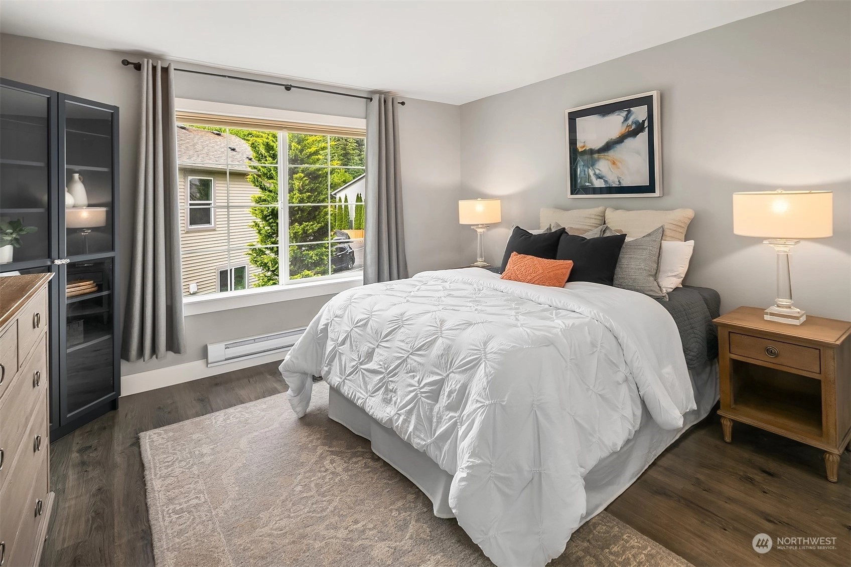 Nestled against a lush greenbelt, this Snoqualmie Ridge cottage offers unparalleled privacy and tranquility. Step inside to a fully updated interior with engineered flooring and high-end finishes throughout. The spacious light-filled living area features an open floor plan seamlessly connecting the kitchen, living and dining spaces. The gourmet kitchen boasts quartz countertops, a matching slab backsplash, and an updated induction range. Custom closet organization in the pantry and primary closets maximize storage and function. Elegant millwork adds a touch of sophistication and craftsmanship to this cohesive design. Enjoy access to top-rated schools, parks, and trails in this highly sought-after community. TWO parking spots!
