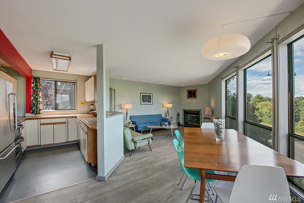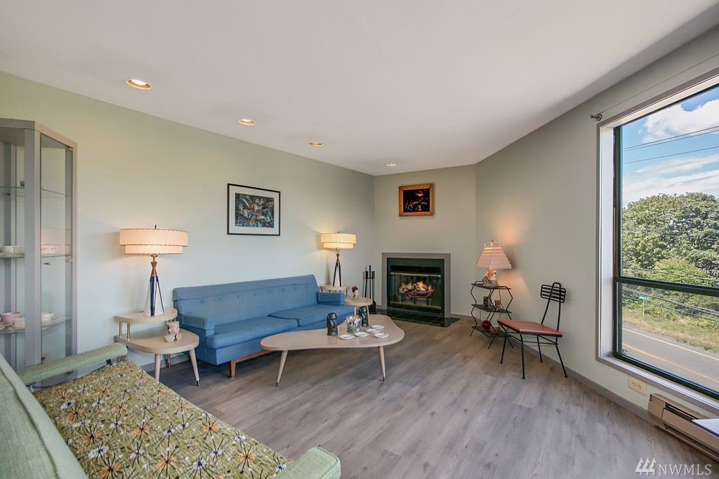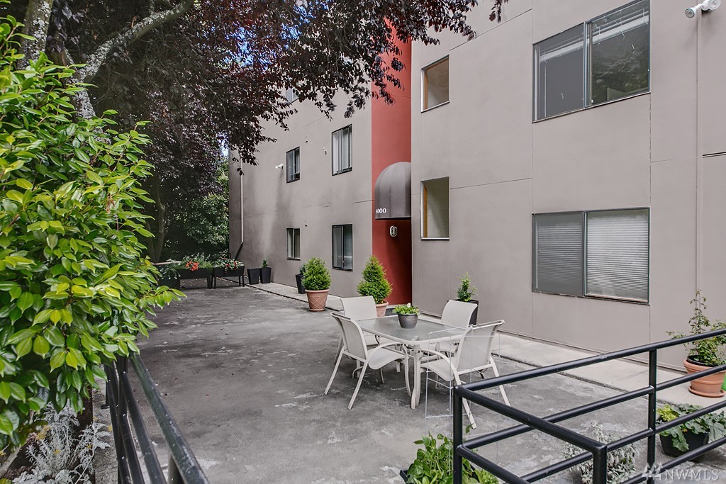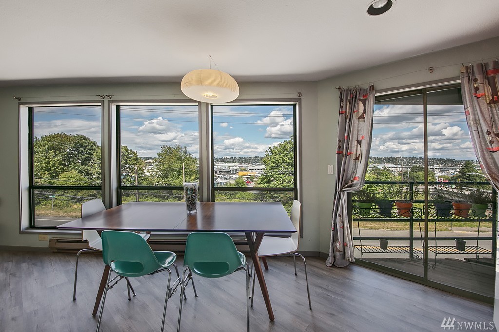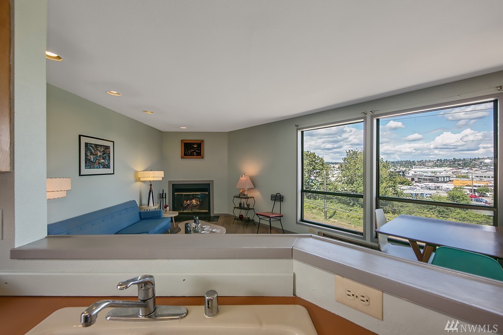 Enjoy the lovely, above it all views from quiet, top floor, spacious 2 bedroom unit in self-managed, smaller building. Spacious, light, open condo that is immaculate inside & out. Cooks kitchen, large dining room, wood burning fireplace, even a Juliet balcony. Secure, Covered parking in garage & an over-sized storage unit. There is a large, courtyard patio for all units to enjoy. Near Discovery Park, Ballard Locks, Fisherman's Terminal, Interbay golf, restaurants & coffee. Welcome home!