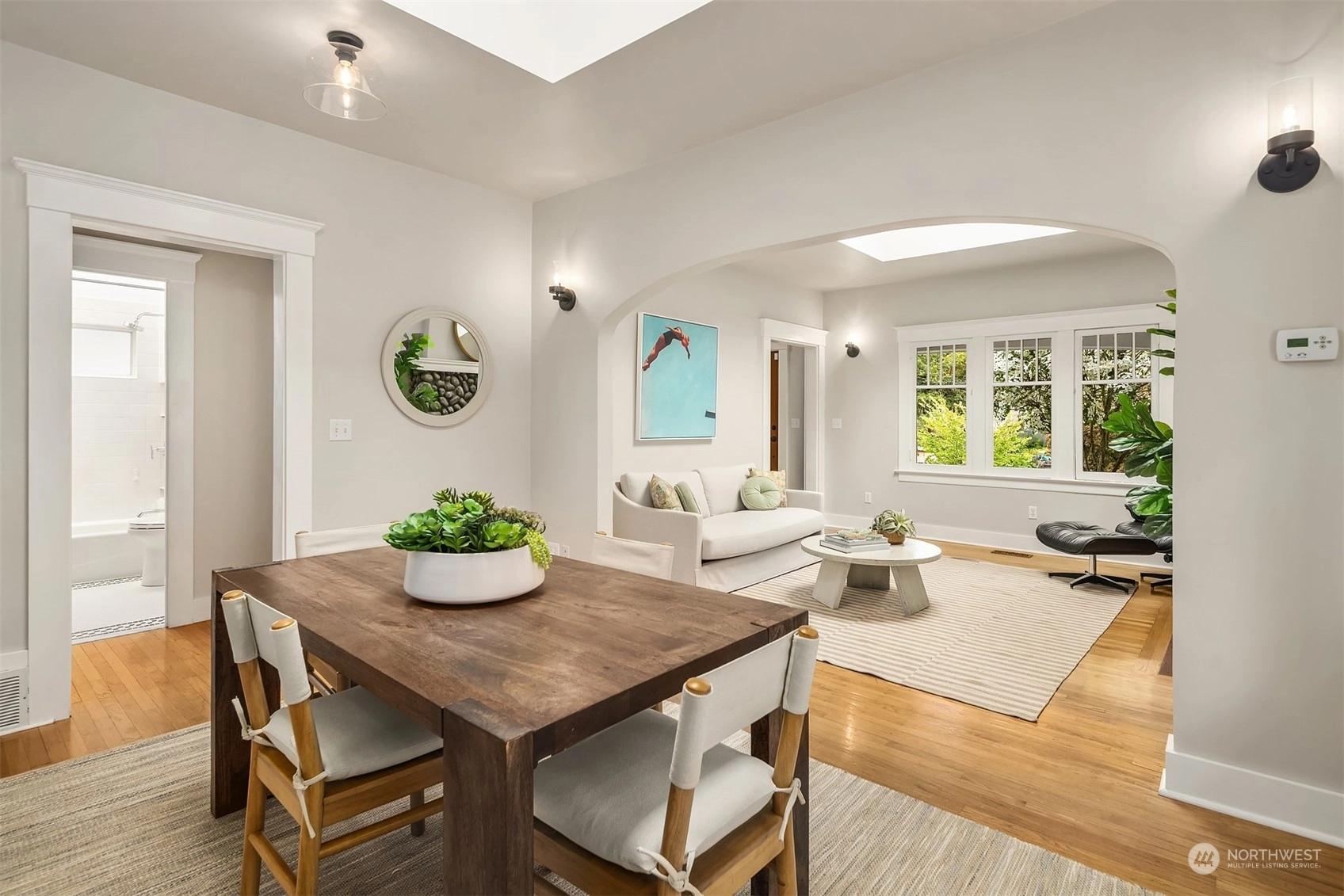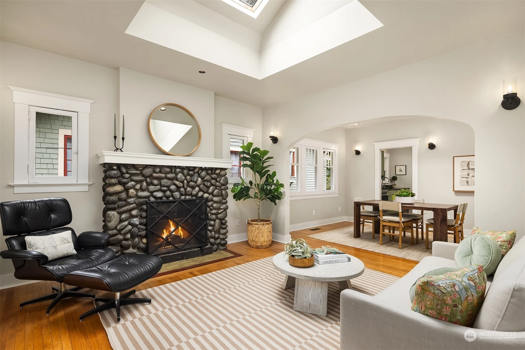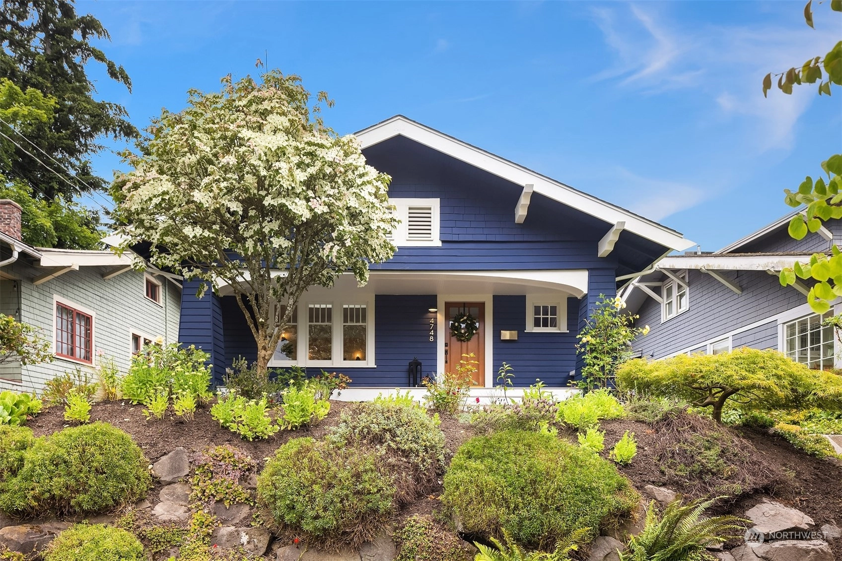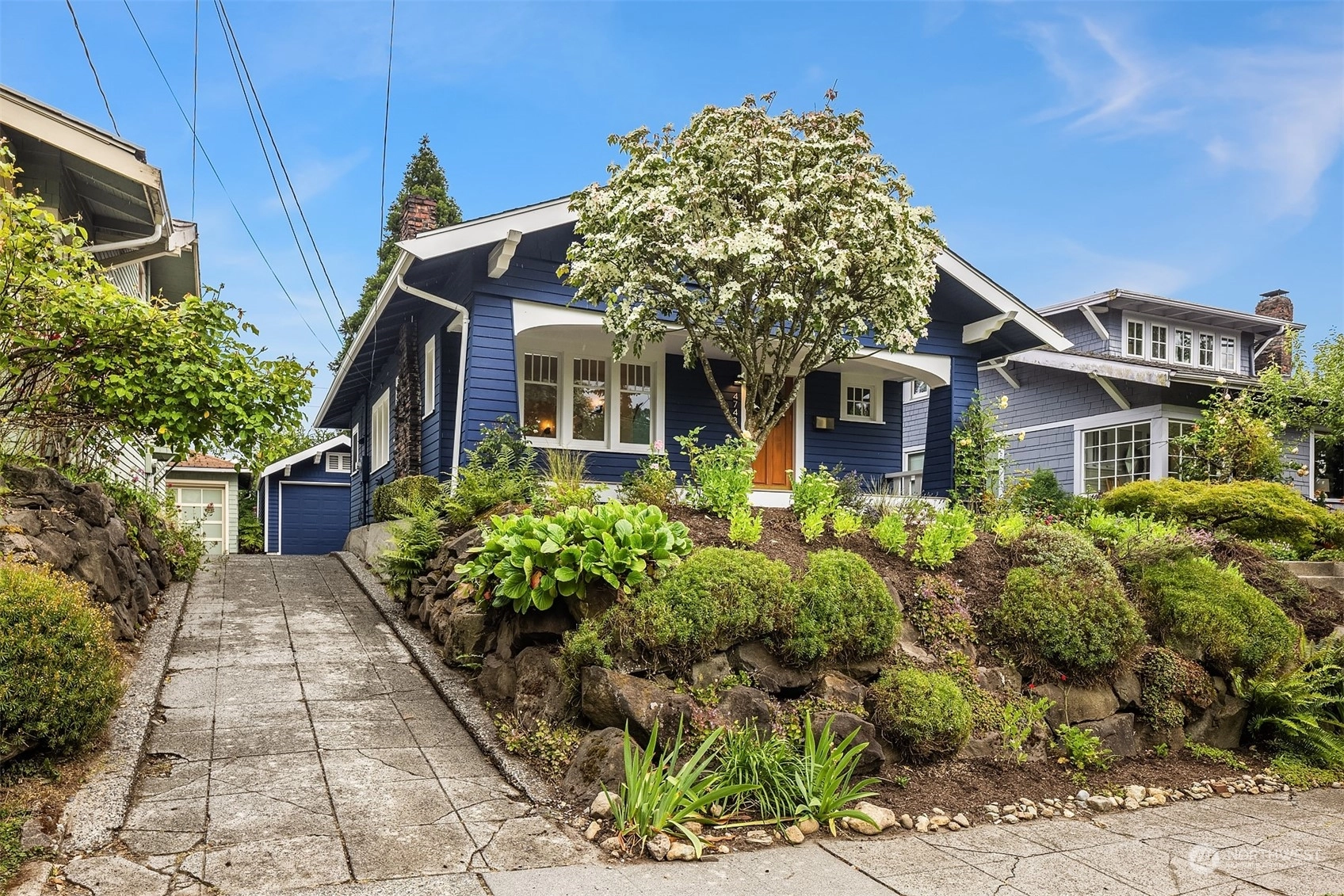Urban living meets historic charm in this beautifully maintained 1901 Craftsman. Filled with natural light, the main living areas feature original hardwood floors, a cozy stone fireplace, and modern updates with captivating style throughout. The galley kitchen is equipped with a gas range & granite countertops. Two comfortable bedrooms on the main floor, including one with a walk-in closet and skylight. Downstairs, you’ll find a third bedroom, ¾ bath with travertine tile, and versatile bonus room for guests or entertainment. Covered front porch; level lawn; lush greenery; detached 1-car garage. All this, located in a vibrant community within walking distance of Tangle-town, Green Lake, John Stanford International School & 520/I-5.