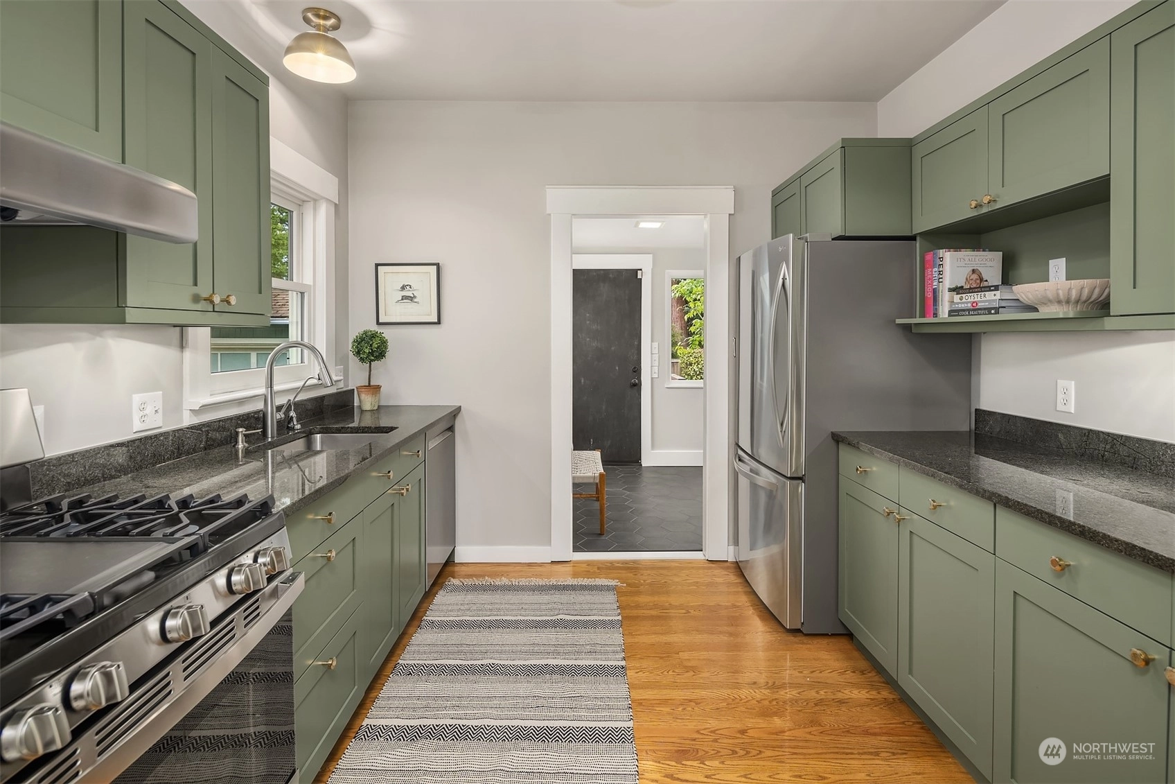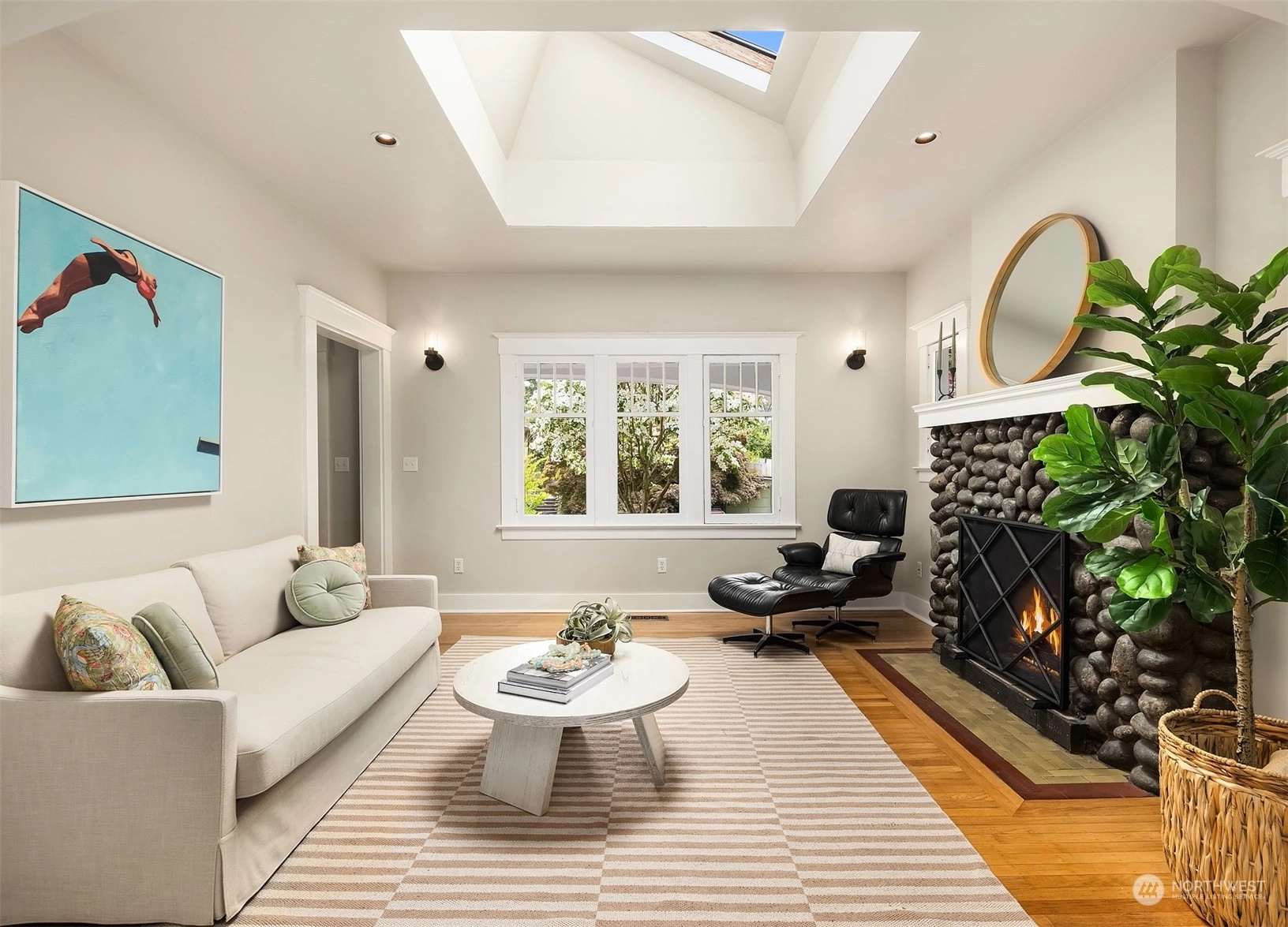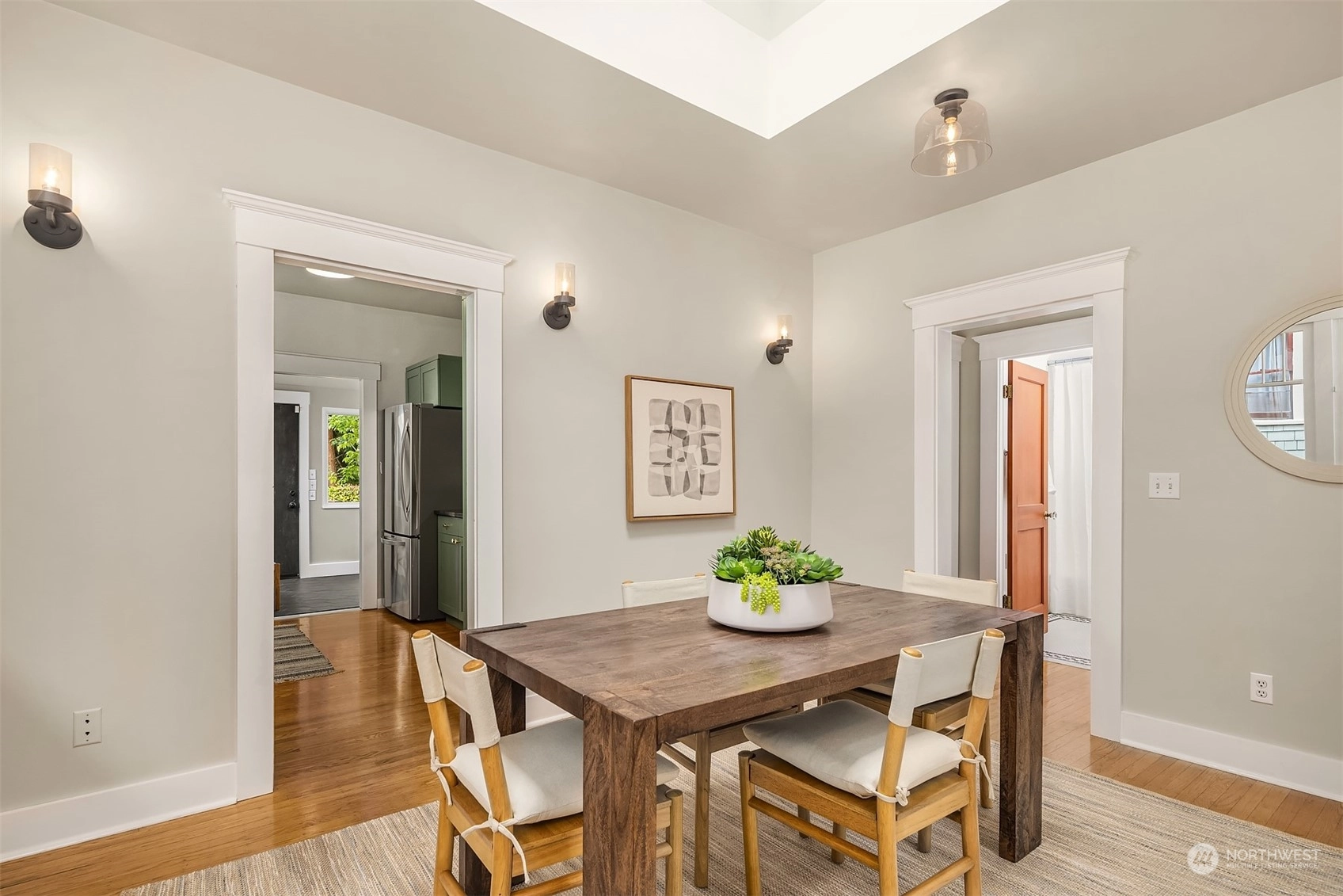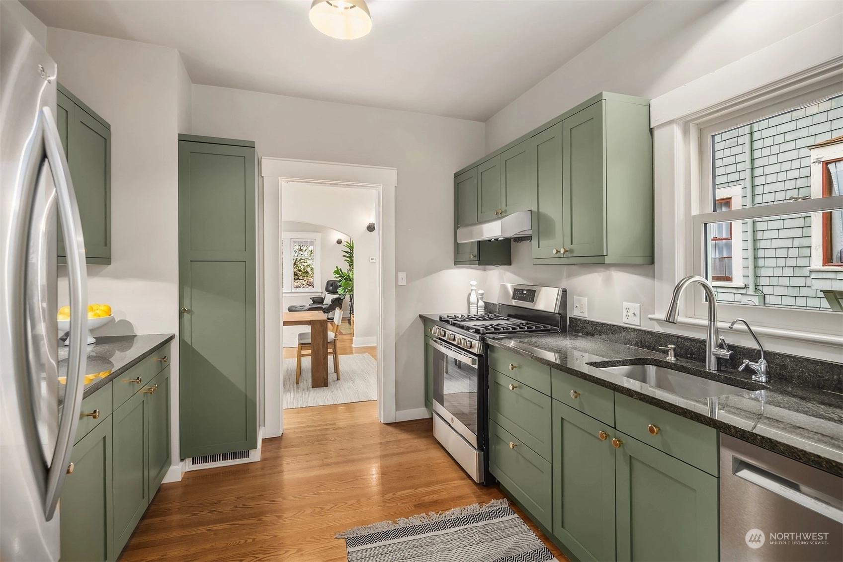 Urban living meets historic charm in this beautifully maintained 1901 Craftsman. Filled with natural light, the main living areas feature original hardwood floors, a cozy stone fireplace, and modern updates with captivating style throughout. The galley kitchen is equipped with a gas range & granite countertops. Two comfortable bedrooms on the main floor, including one with a walk-in closet and skylight. Downstairs, you’ll find a third bedroom, ¾ bath with travertine tile, and versatile bonus room for guests or entertainment. Covered front porch; level lawn; lush greenery; detached 1-car garage. All this, located in a vibrant community within walking distance of Tangle-town, Green Lake, John Stanford International School & 520/I-5.