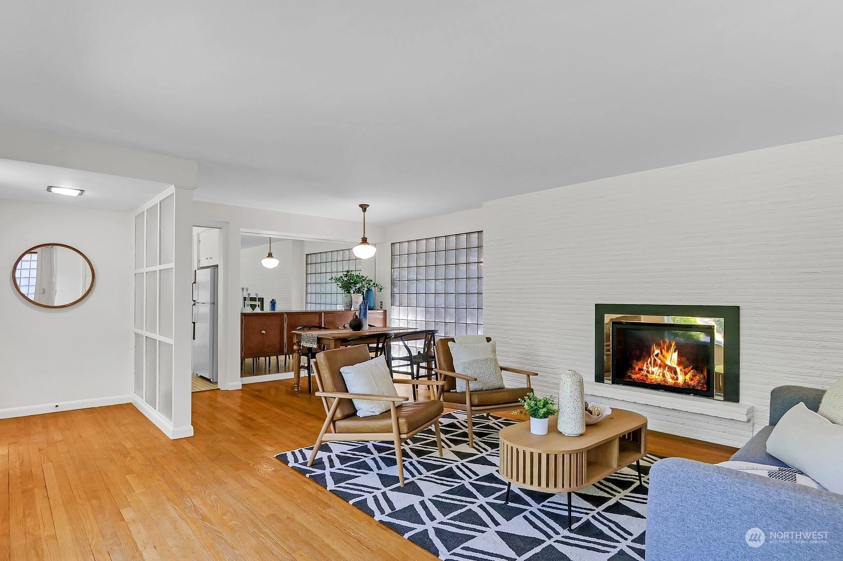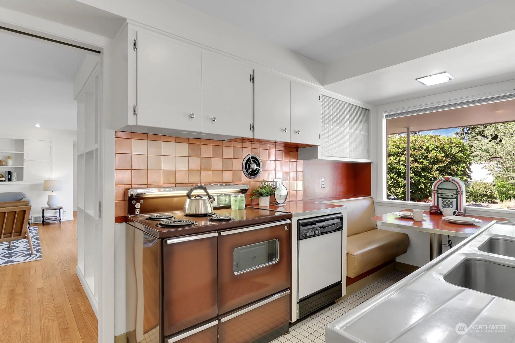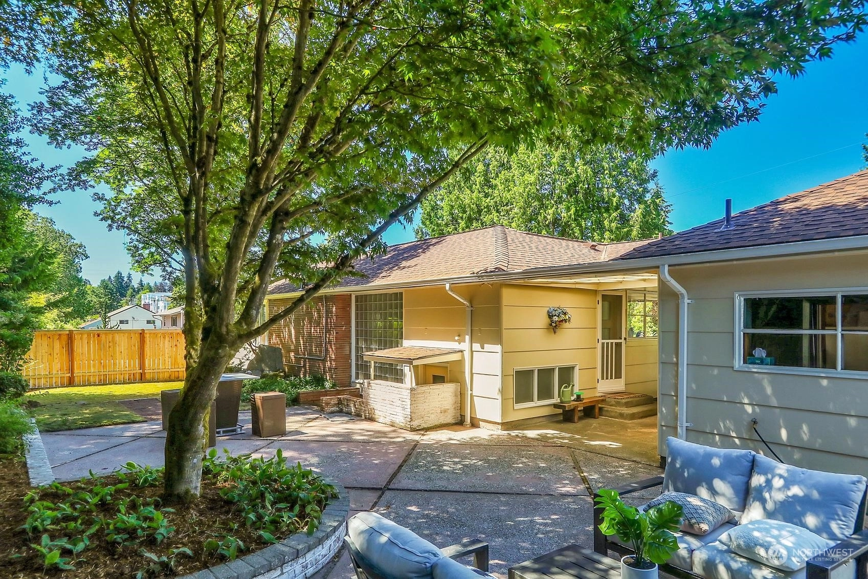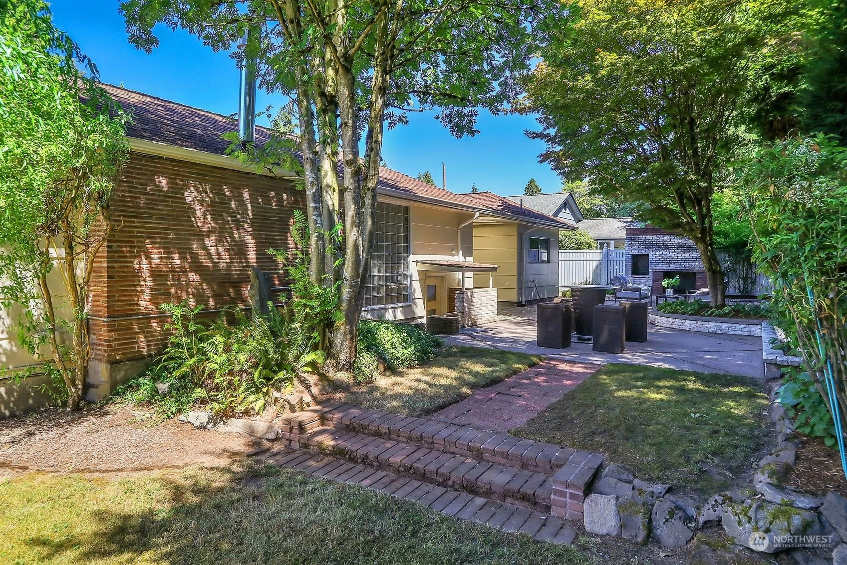 Enjoy a marvelous Mid-century property wrapped in era charm and situated on a fabulous street near the very heart of Wedgwood. This wonderful home begins with a delightful front patio entry that evokes a courtyard feel. Once inside, you'll find a gracious living room and dining room full with hardwood floors, a gas fireplace, picture windows and a full brick wall accented with glass block windows. The kitchen is a treasure with a perfect sense of preservation, right down to the 50's-diner booth eating space. The home also offers 3 bedrooms, 2 bathrooms, a fantastic family room with the best tiki bar, an office space, a utility room, access to the excellent back patio and yard, and a breezeway that connects the home to the one-car garage.