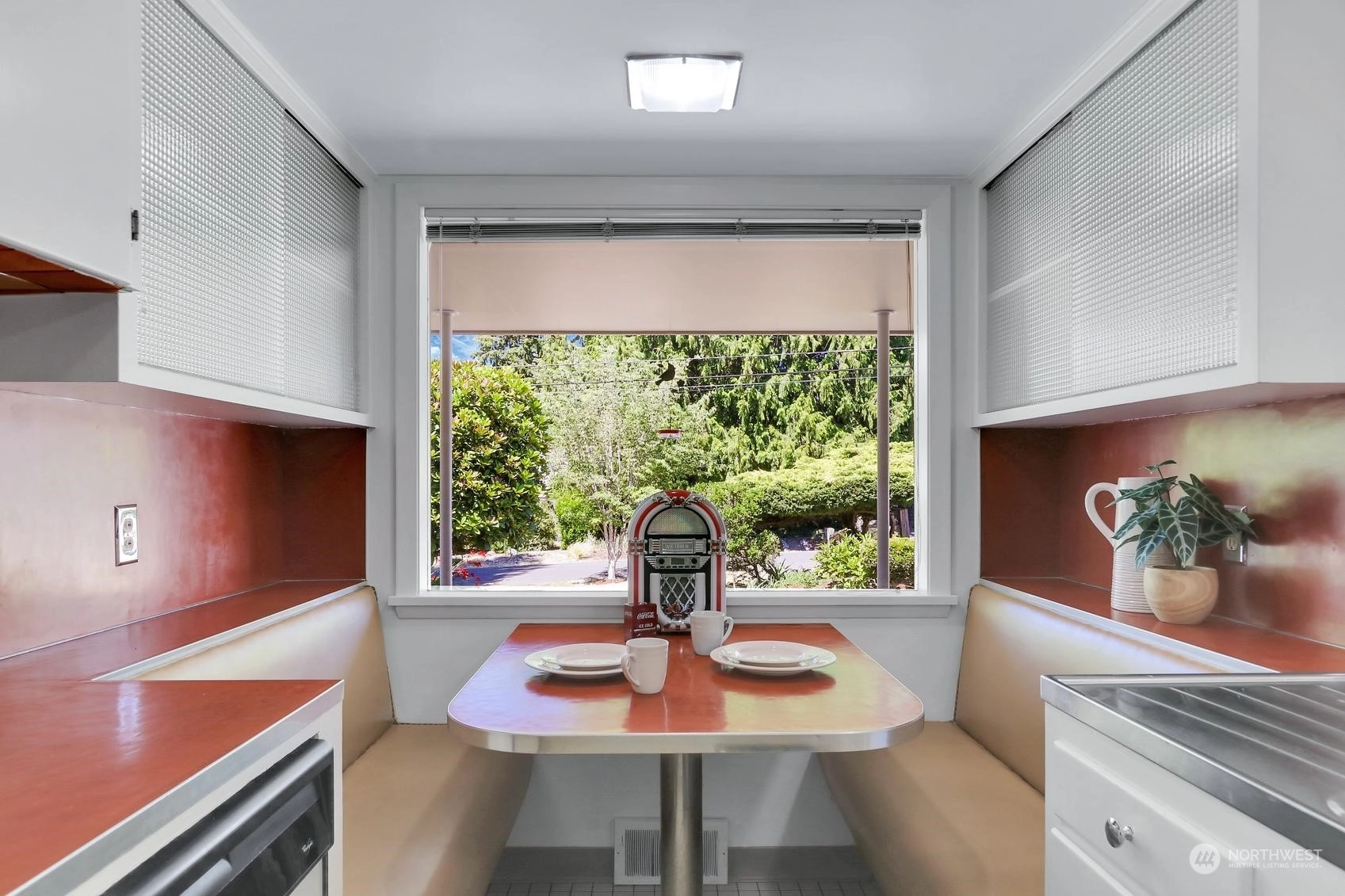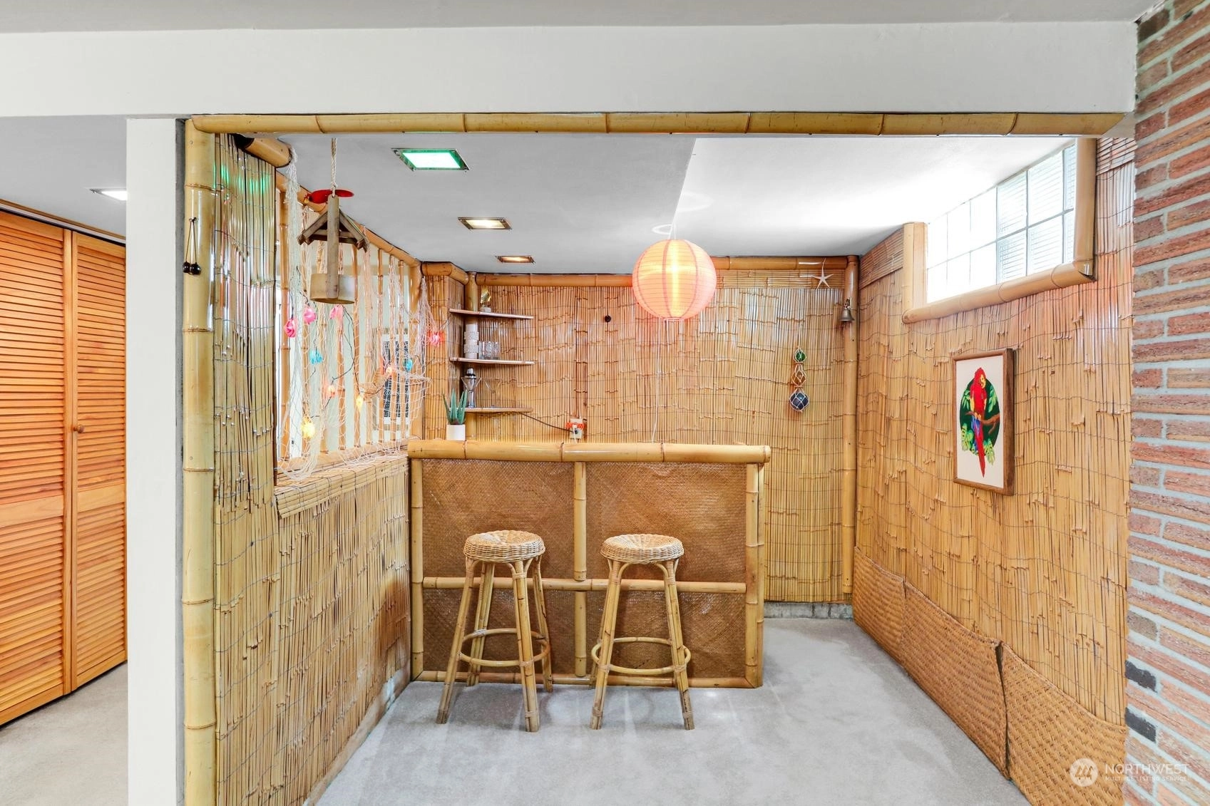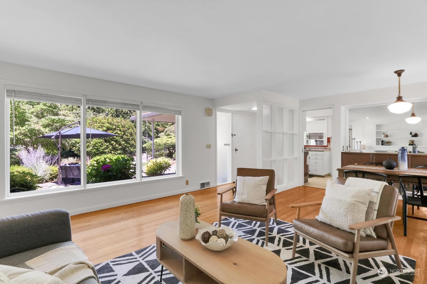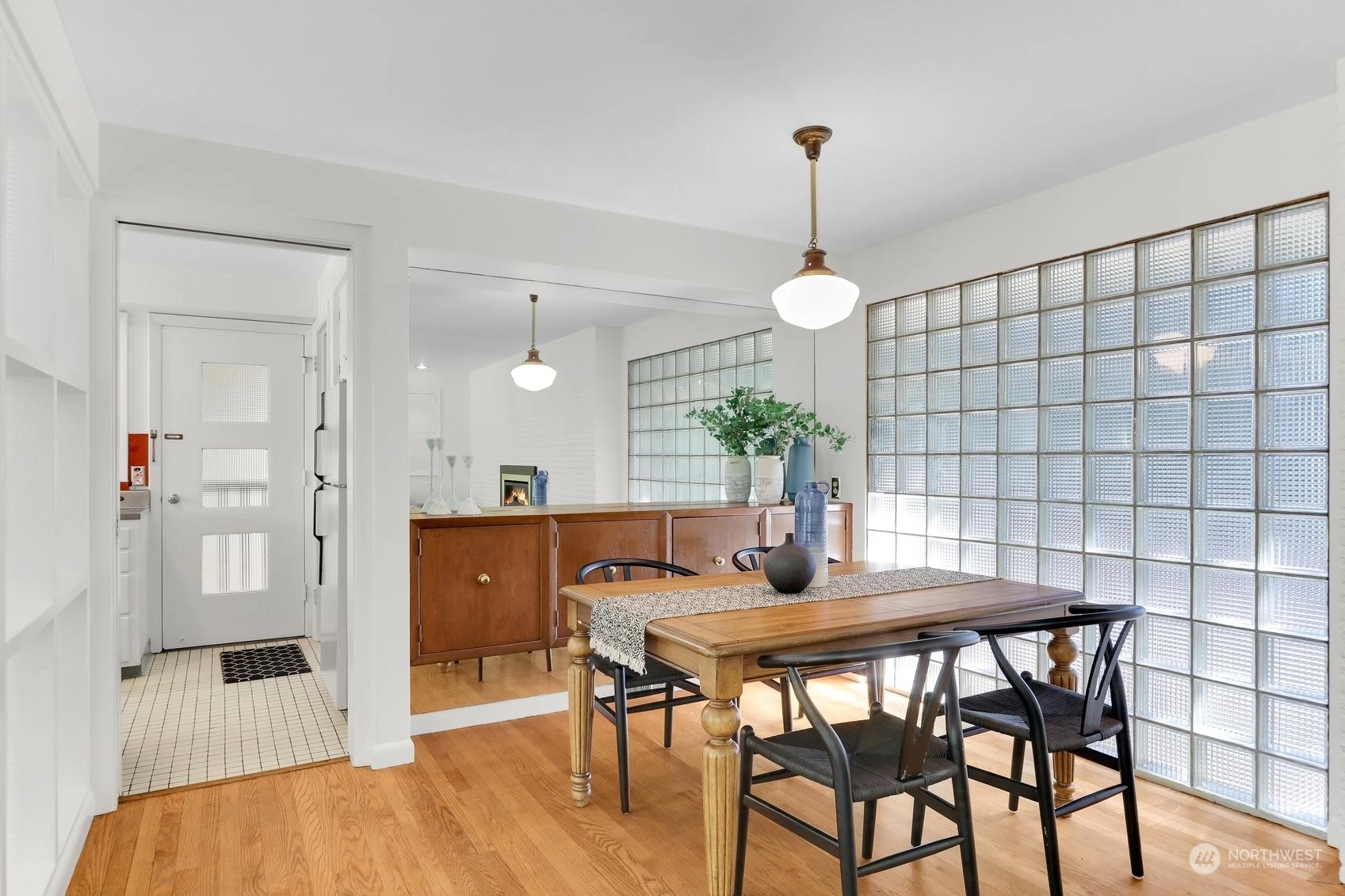 Enjoy a marvelous Mid-century property wrapped in era charm and situated on a fabulous street near the very heart of Wedgwood. This wonderful home begins with a delightful front patio entry that evokes a courtyard feel. Once inside, you'll find a gracious living room and dining room full with hardwood floors, a gas fireplace, picture windows and a full brick wall accented with glass block windows. The kitchen is a treasure with a perfect sense of preservation, right down to the 50's-diner booth eating space. The home also offers 3 bedrooms, 2 bathrooms, a fantastic family room with the best tiki bar, an office space, a utility room, access to the excellent back patio and yard, and a breezeway that connects the home to the one-car garage.