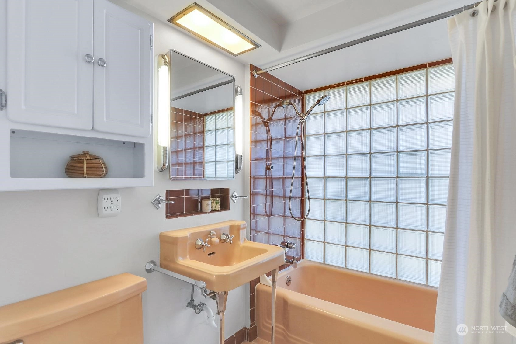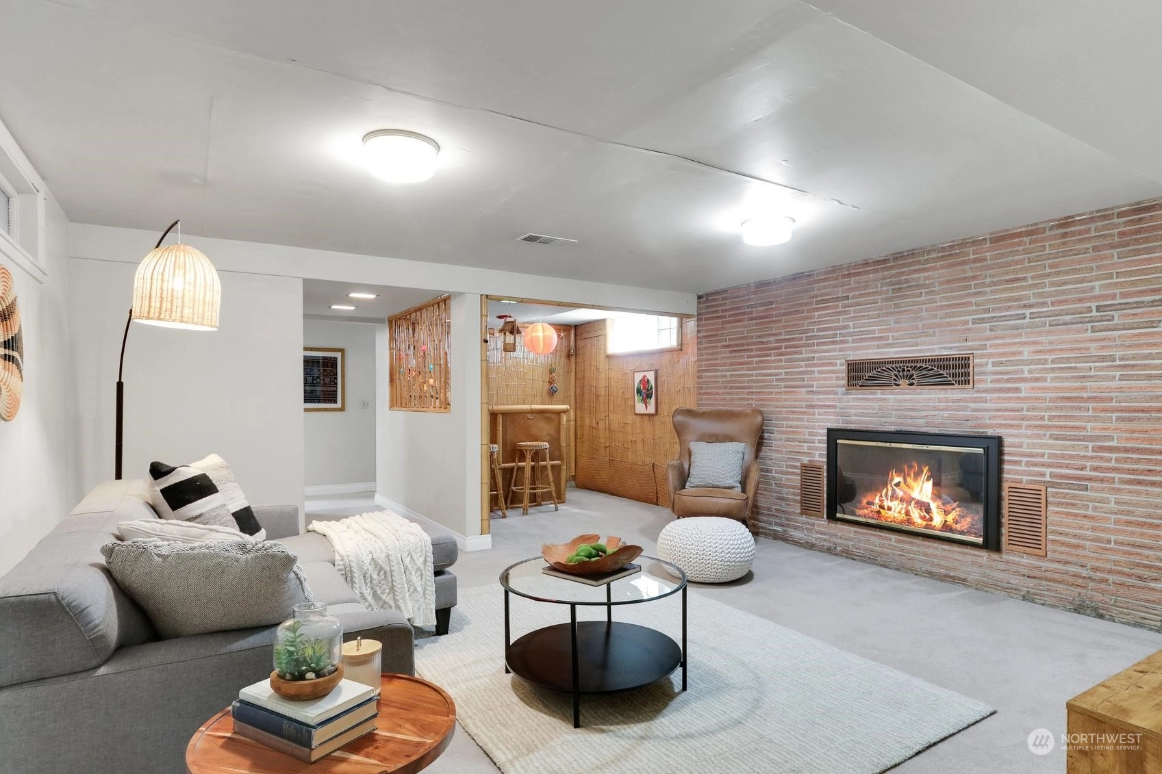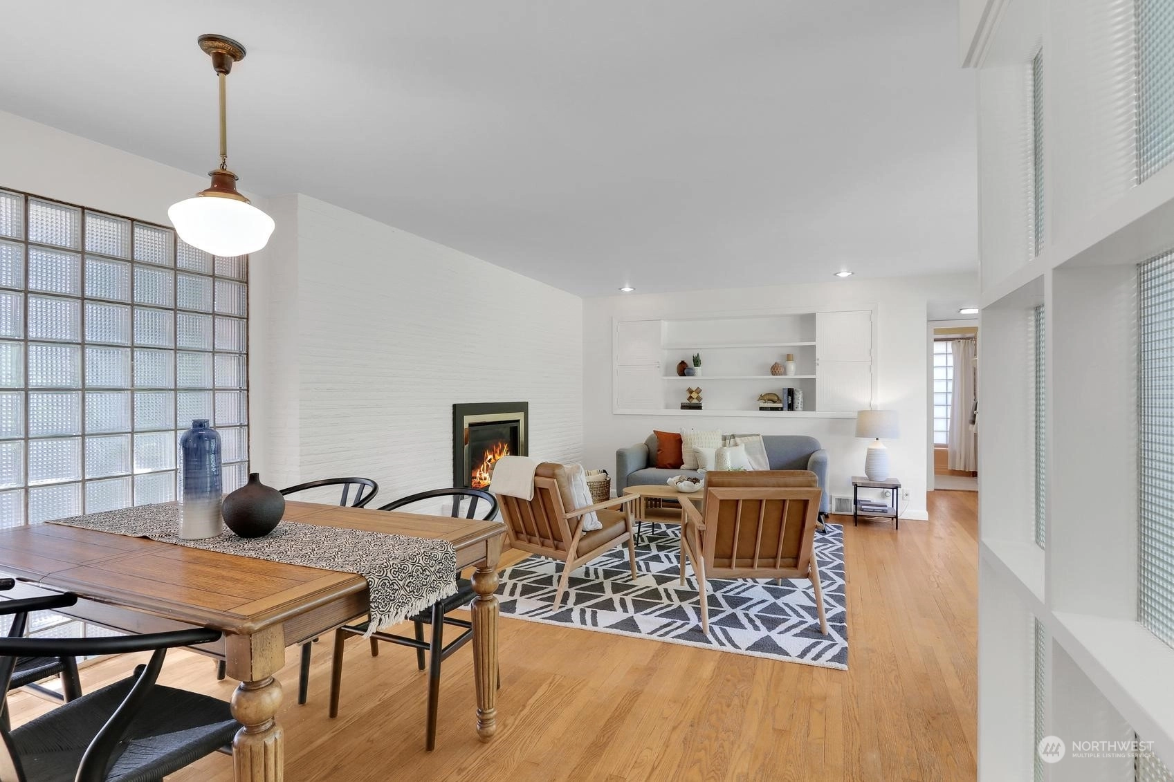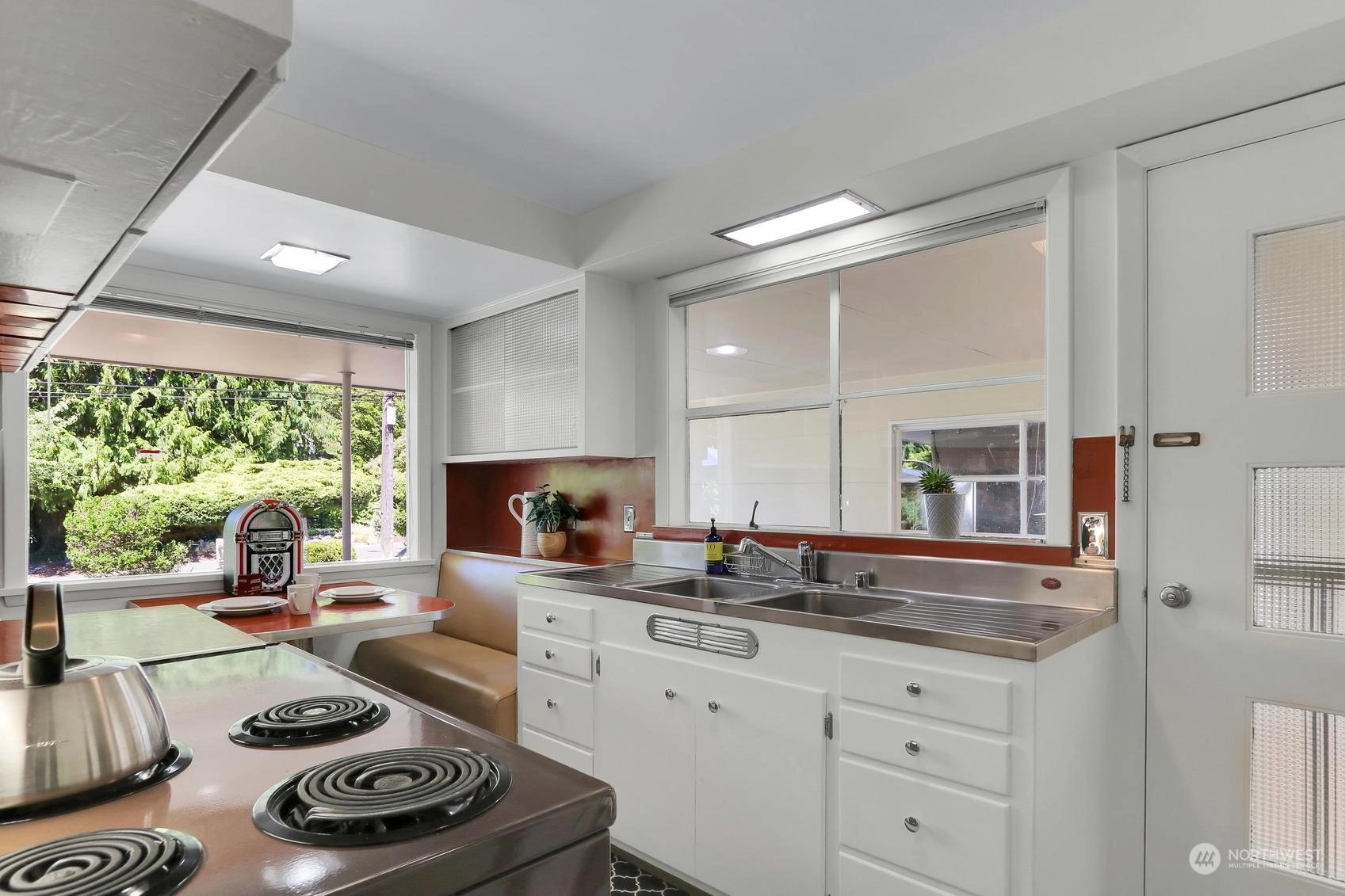 Enjoy a marvelous Mid-century property wrapped in era charm and situated on a fabulous street near the very heart of Wedgwood. This wonderful home begins with a delightful front patio entry that evokes a courtyard feel. Once inside, you'll find a gracious living room and dining room full with hardwood floors, a gas fireplace, picture windows and a full brick wall accented with glass block windows. The kitchen is a treasure with a perfect sense of preservation, right down to the 50's-diner booth eating space. The home also offers 3 bedrooms, 2 bathrooms, a fantastic family room with the best tiki bar, an office space, a utility room, access to the excellent back patio and yard, and a breezeway that connects the home to the one-car garage.