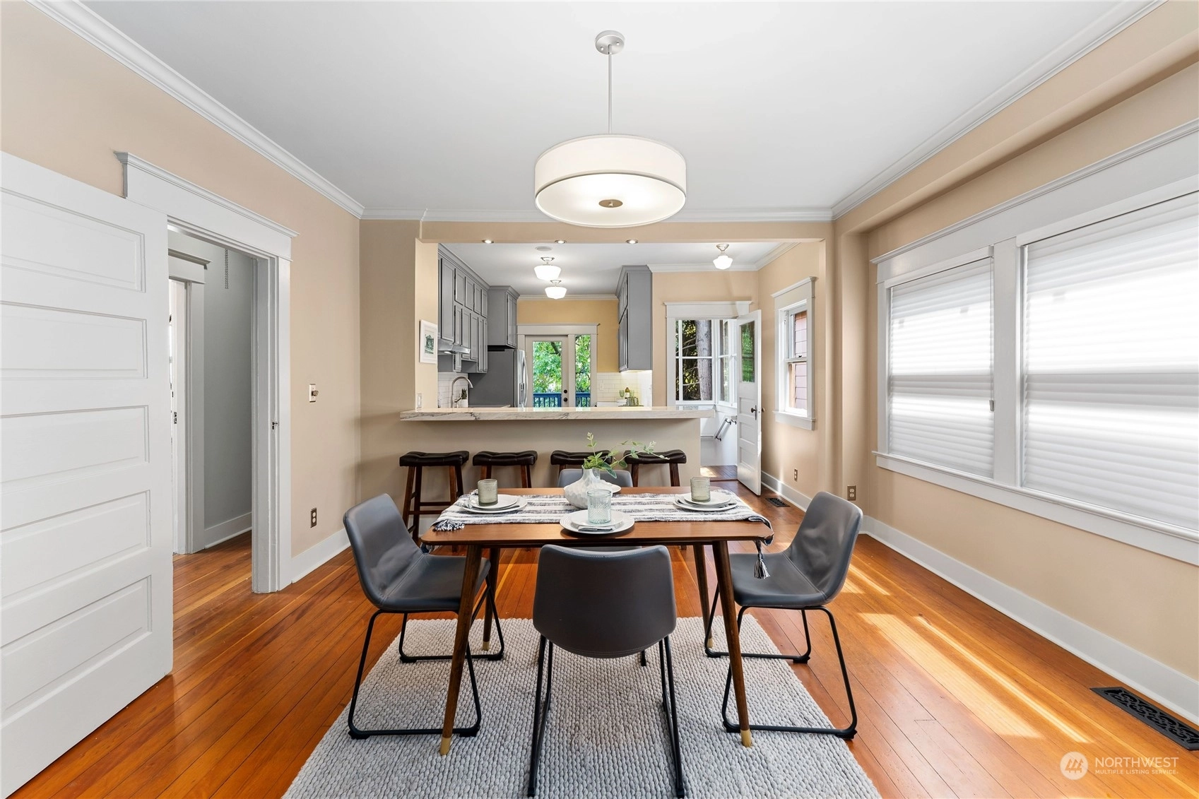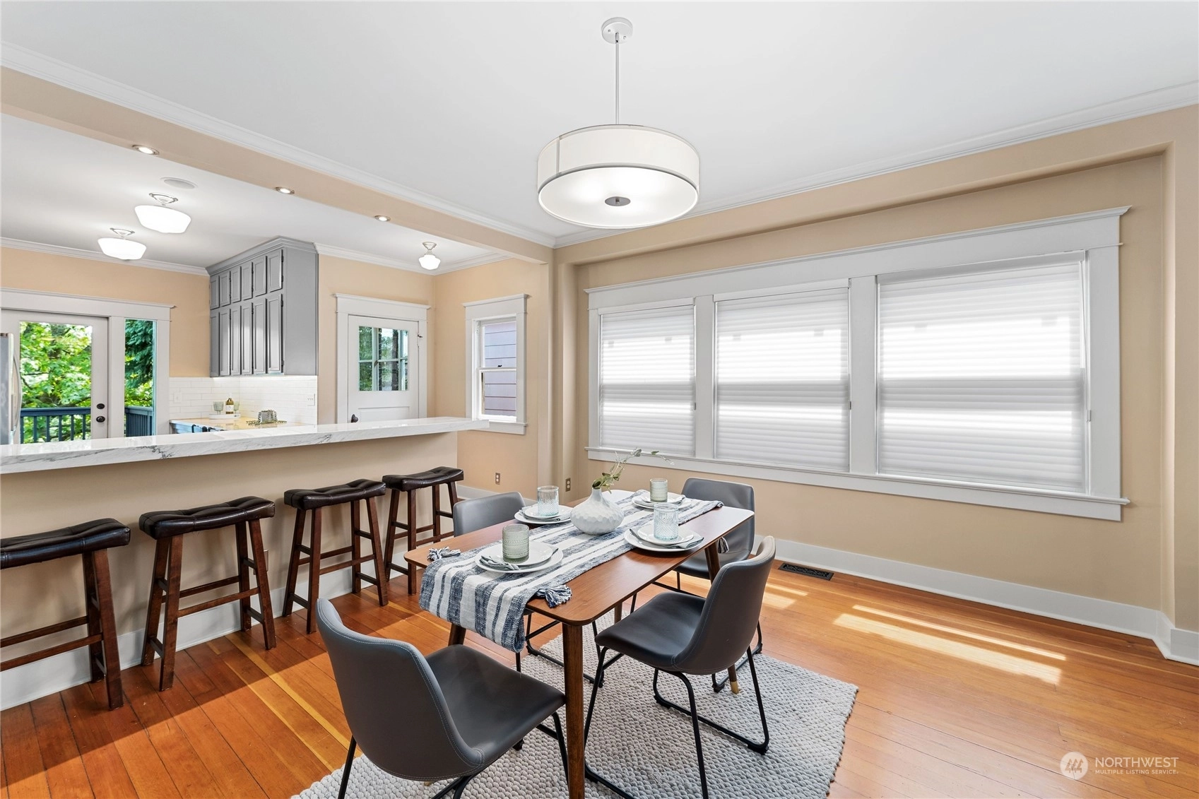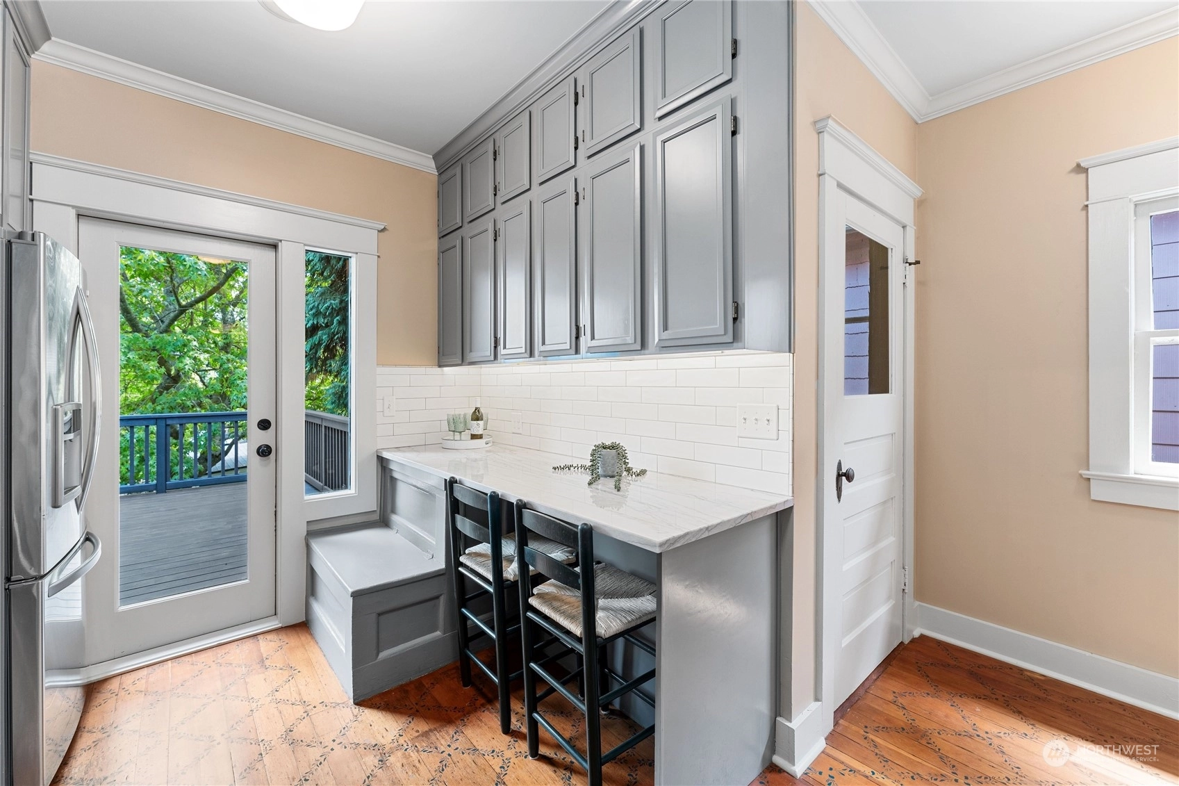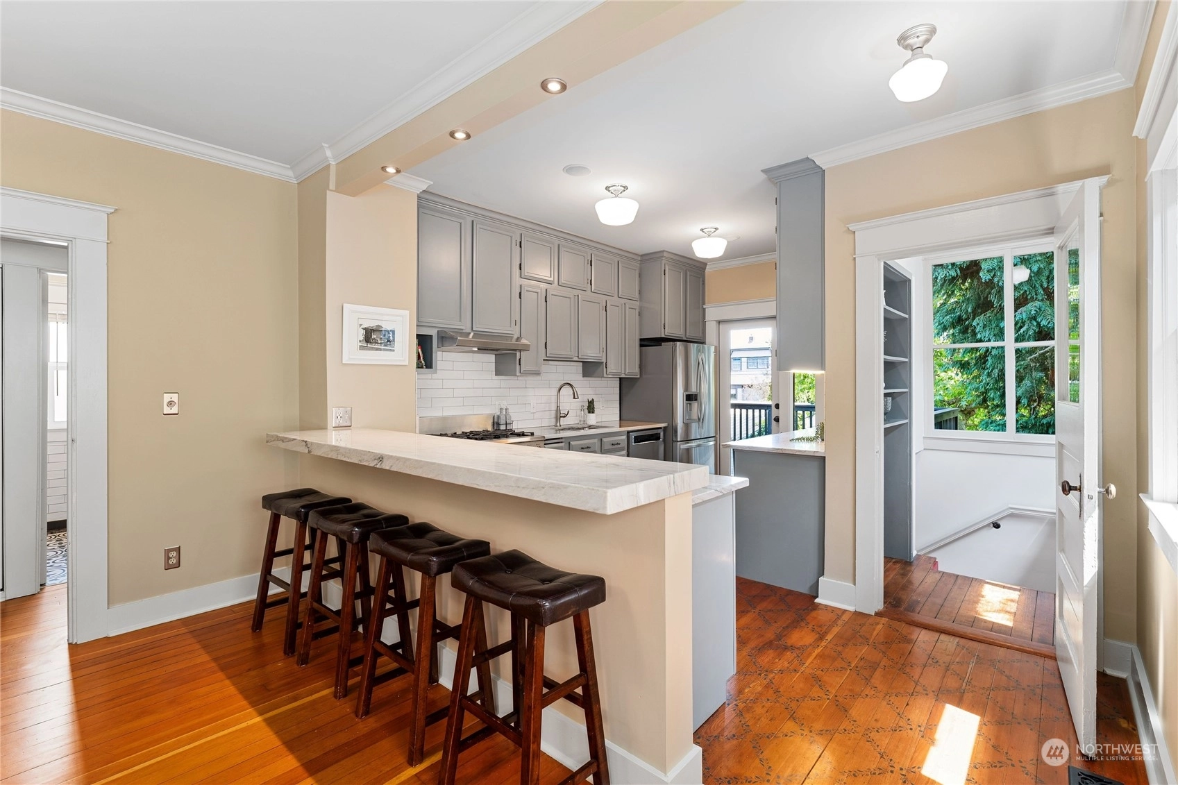 A Queen Anne retreat nestled on a tree-lined street w/ a cheerful entry framed by a bright red door, verdant greenery & a white picket fence. Enjoy 3 levels of flexible living space w/ thoughtful features. The main floor boasts an open, airy design w/high ceilings, original fir floors& ample daylight. The gourmet kitchen features a gas range, Quartzite counters, eat-up bar &stenciled flooring. An entertaining deck extends fun w/space to grill, dine, or relax, overlooking the fully fenced yard. 2 beds on main, 2 beds + bonus on middle level, all baths + laundry w/ heated floors. Lower floor w/wet bar & added living space/movie room/flex. Each level w/outdoor access—potential for 2 ADUs/mother-in-law suites. Shopping & eateries within blocks!