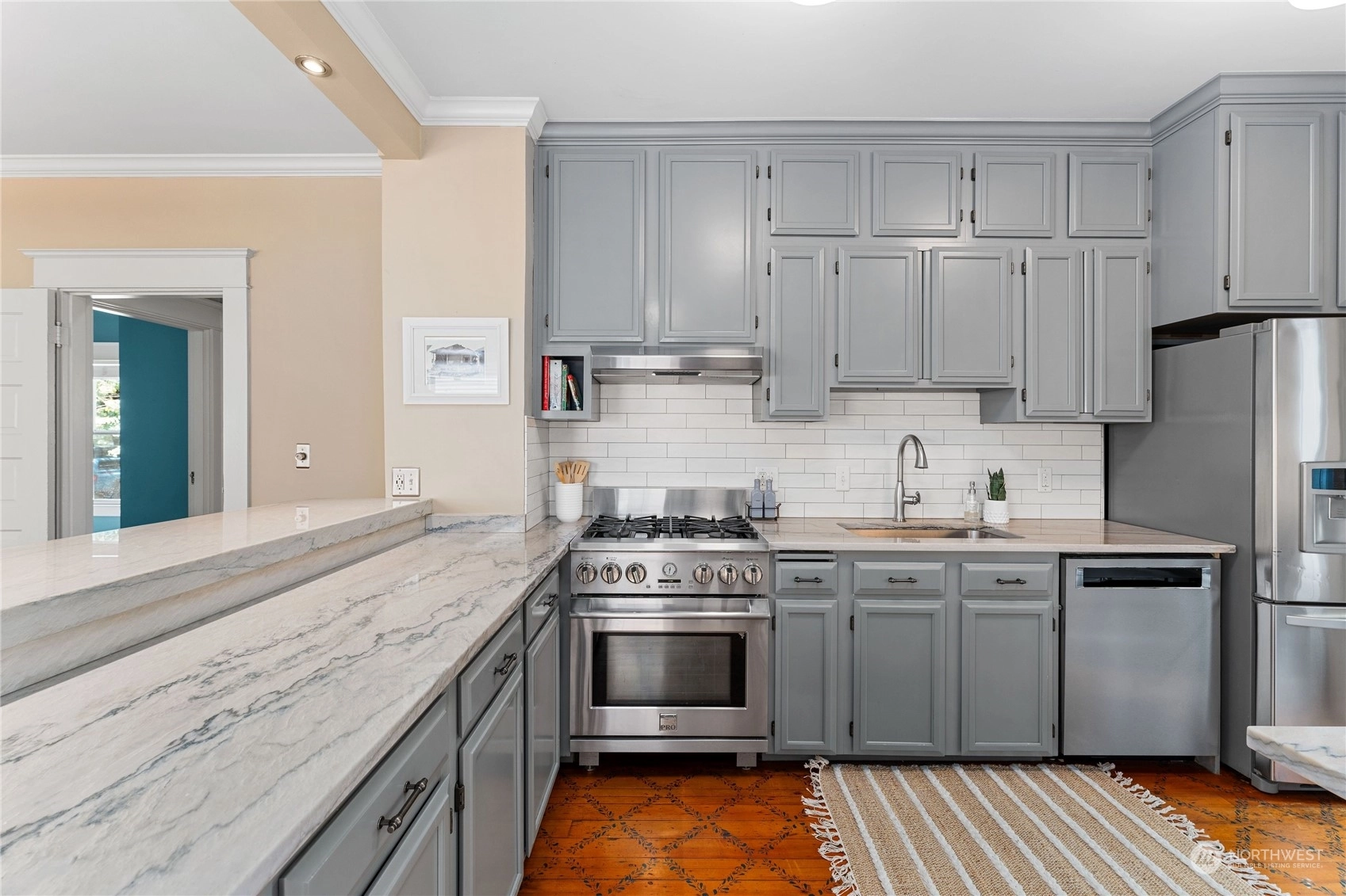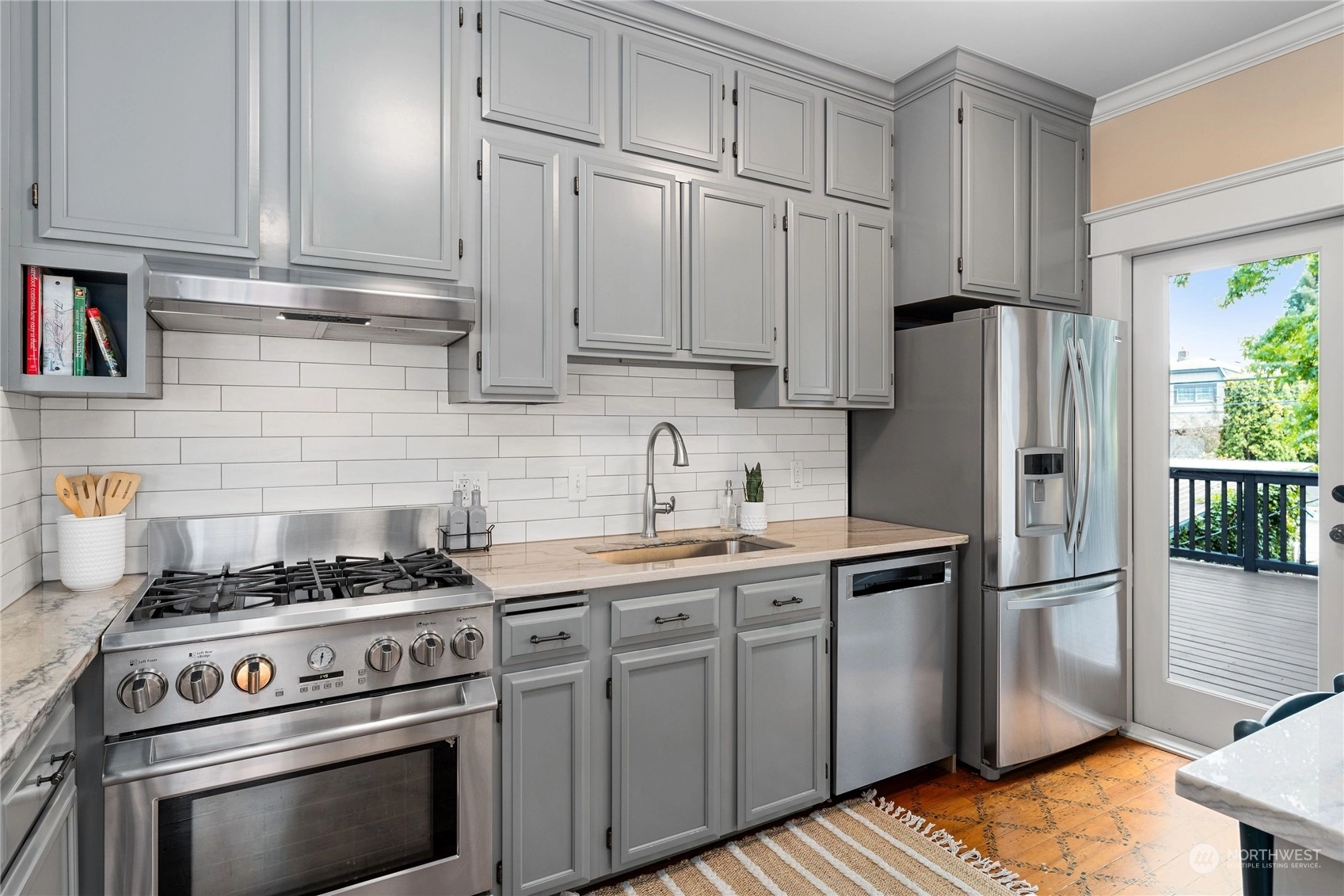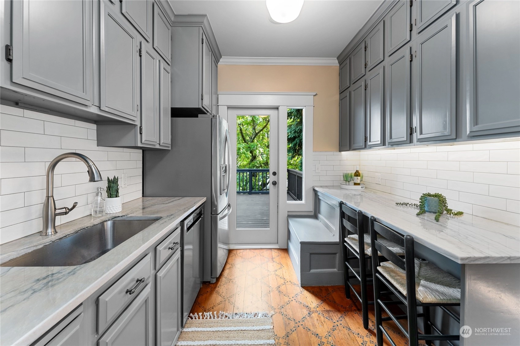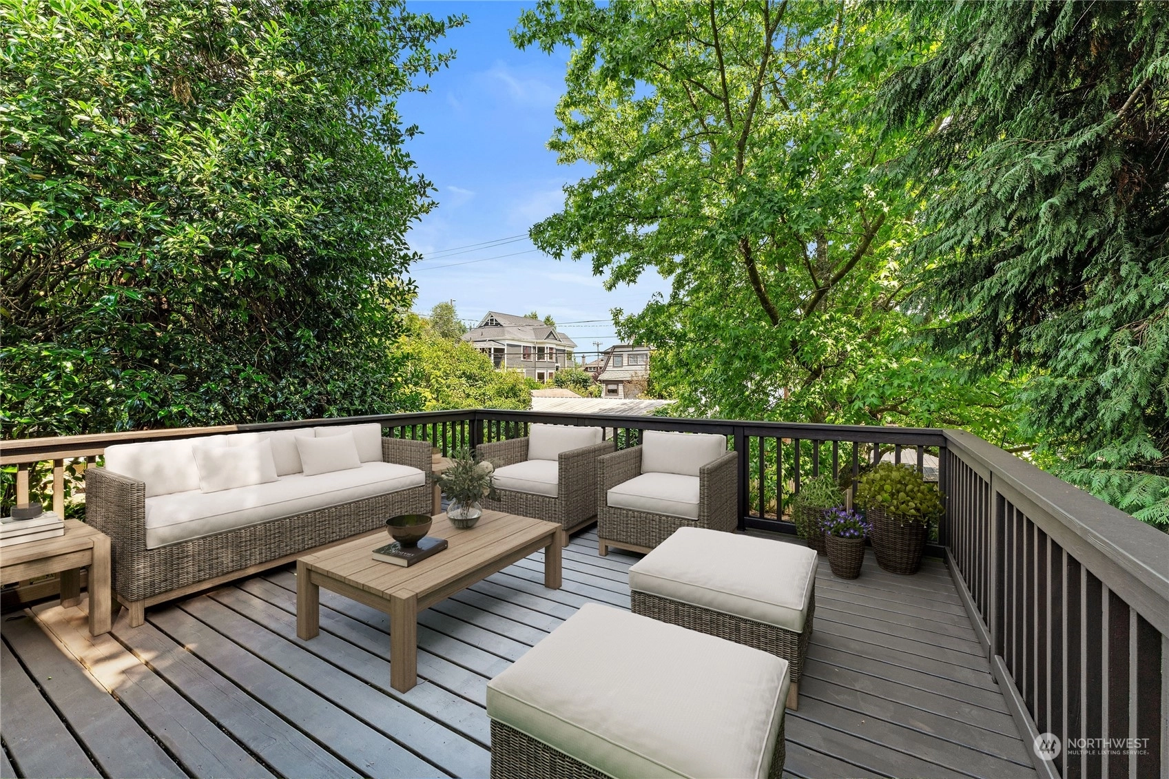 A Queen Anne retreat nestled on a tree-lined street w/ a cheerful entry framed by a bright red door, verdant greenery & a white picket fence. Enjoy 3 levels of flexible living space w/ thoughtful features. The main floor boasts an open, airy design w/high ceilings, original fir floors& ample daylight. The gourmet kitchen features a gas range, Quartzite counters, eat-up bar &stenciled flooring. An entertaining deck extends fun w/space to grill, dine, or relax, overlooking the fully fenced yard. 2 beds on main, 2 beds + bonus on middle level, all baths + laundry w/ heated floors. Lower floor w/wet bar & added living space/movie room/flex. Each level w/outdoor access—potential for 2 ADUs/mother-in-law suites. Shopping & eateries within blocks!