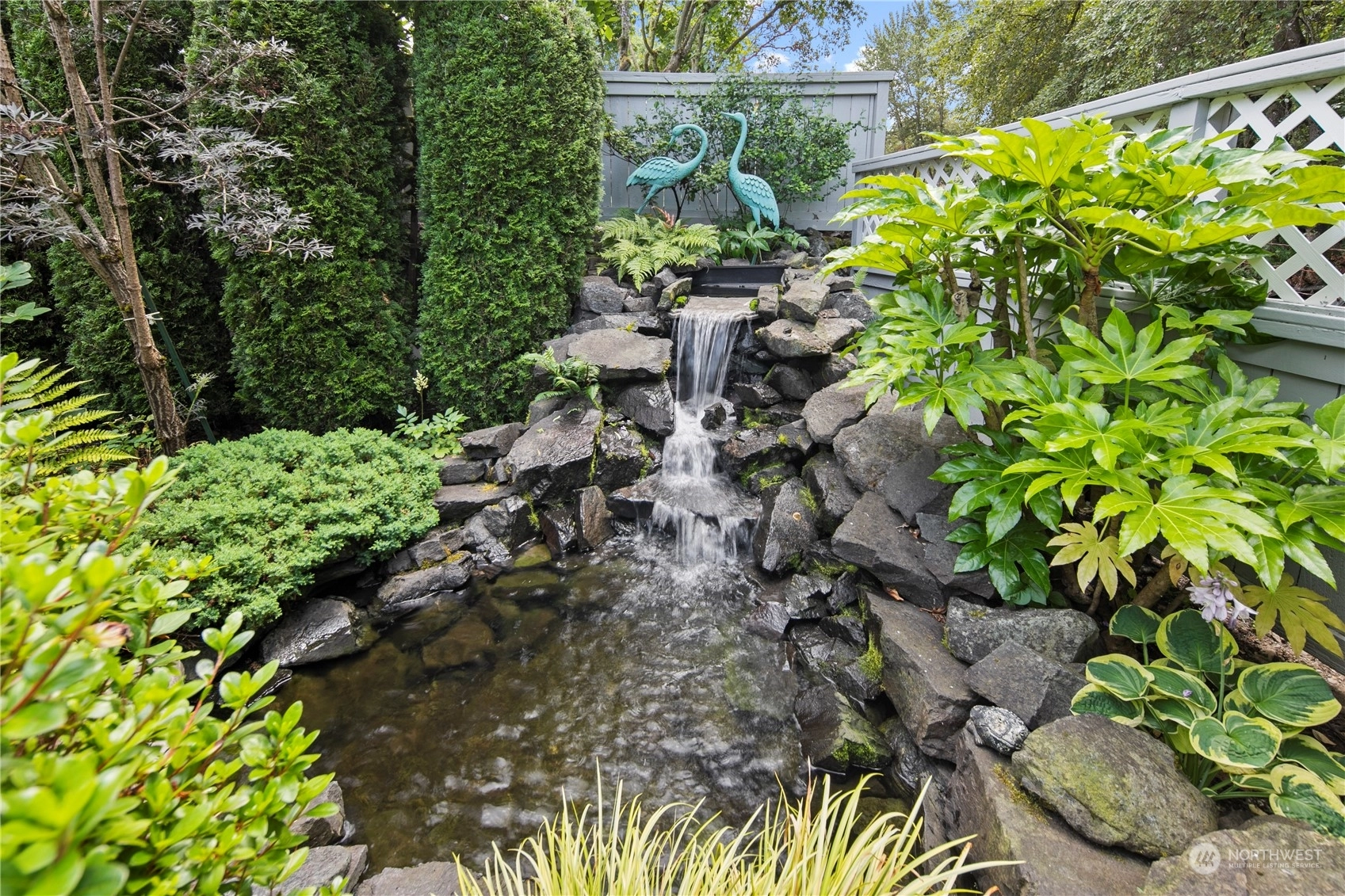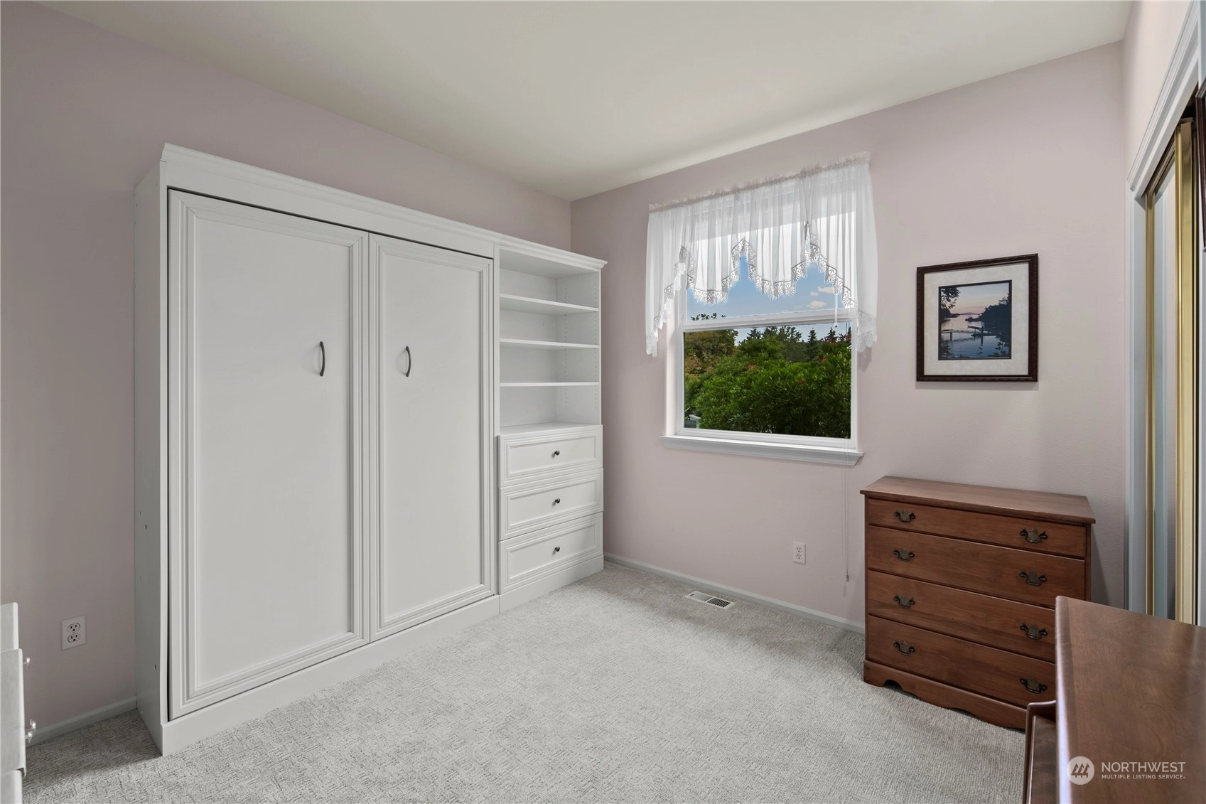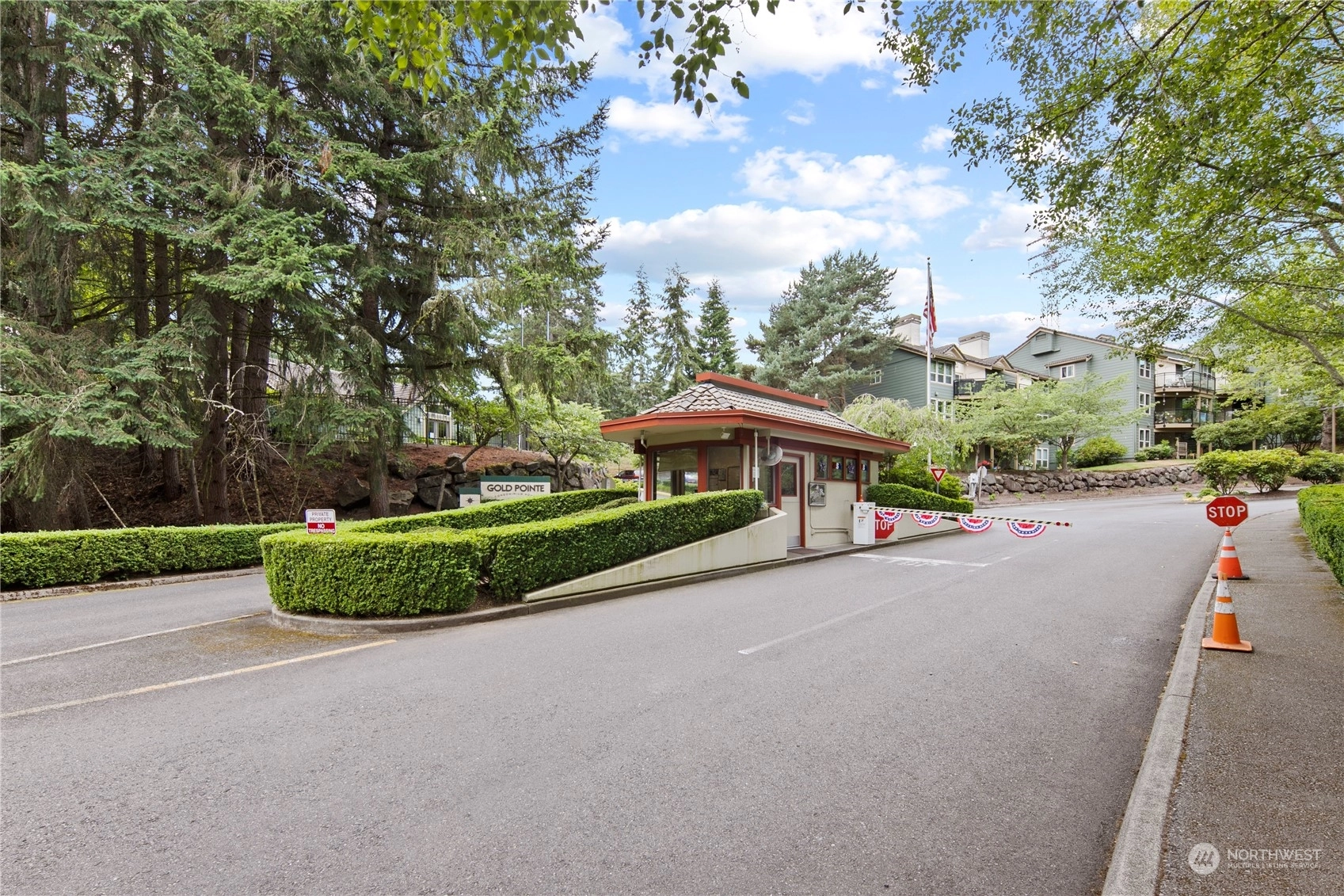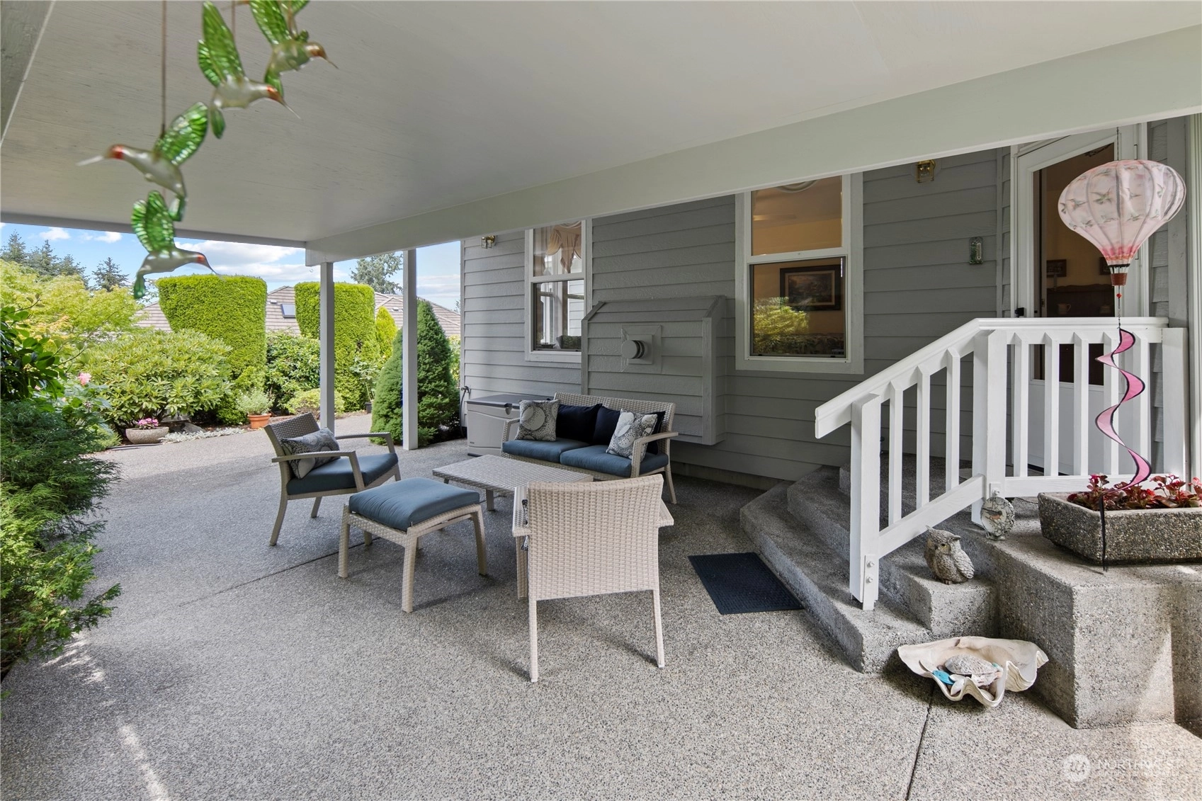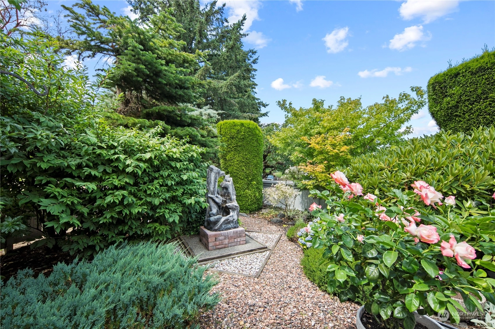 Welcome to this stunning 3-bed, 2-bath home in the desirable community of Goldmont. As you enter, you are greeted by a spacious living area that seamlessly flows into the dining room and kitchen, all bathed in natural light. The kitchen features sleek countertops, and ample storage space. Enjoy the tranquility and security of the Goldmont community, complete w/a 24-hour security gate. Step out to your own private oasis in the backyard, adorned w/ mature landscaping and two serene water features. The covered aggregate patio offers a secluded retreat, perfect for enjoying morning coffee or evening gatherings.Inside, the spare bedroom includes a convenient Murphy bed wall unit, maximizing space.