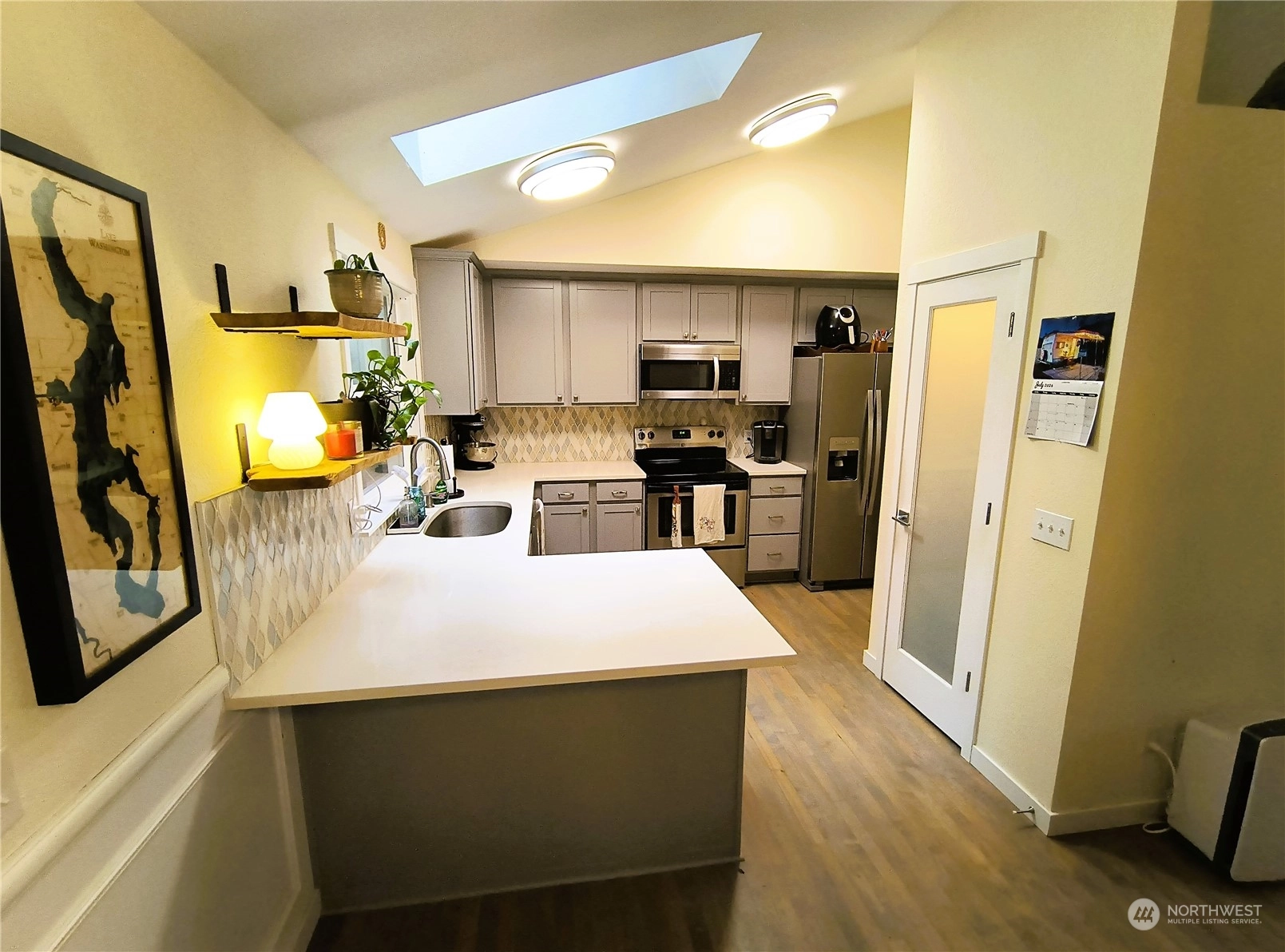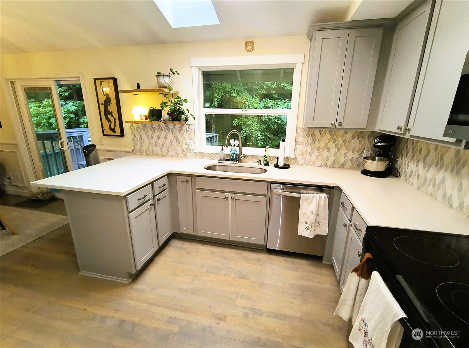 Lovely remodeled home in Covington Park! Tri-level home includes 3 bedrooms, 3 bathrooms, large 2 car garage and it has all been recently upgraded. Some features are newer hardwood floors, skylights, cathedral ceilings efficient convection heaters, new blinds, newer 30 year roof and more. Inside is immaculate and ready to move in. The Chefs kitchen includes updated cabinetry, quartz counter tops, and designer back splash. Walk upstairs to a Huge Primary Suite that includes walk-in closet plus a spa shower. Walk outside to private 9,000+ square foot lot w/ 2 story deck overlooking private yard. Property behind is a green belt, so complete privacy. RV/boat parking & garden/dog run. Desirable location, close to schools/shopping. Come look now!