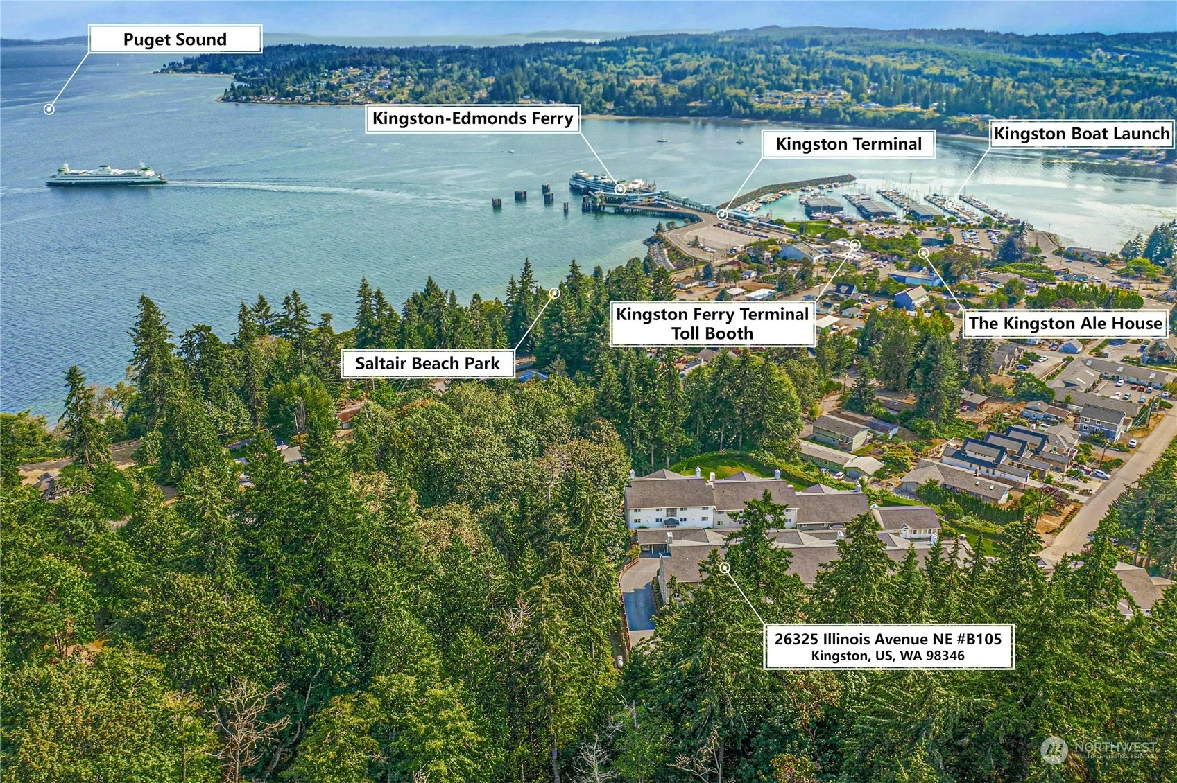 Charming 1 story 3-Bedroom corner condo in Coastal Kingston: Experience the charm of Kingston's coastal community by discovering urban living at its best in this freshly painted, bright one-story condo, just minutes from the Kingston/Edmonds ferry and the Seattle walk on ferry, shops, restaurants & parks. The spacious living room, centered around a cozy gas fireplace, opens to a back patio, perfect for enjoying your morning coffee or evening drink. The home has 3 bedrooms which include the primary suite with full bath. Nestled in a prime location, this home offers easy access to schools and amenities, making daily life a breeze. Enjoy the serene beauty of your surroundings in this peace filled coastal community just minutes to everything!