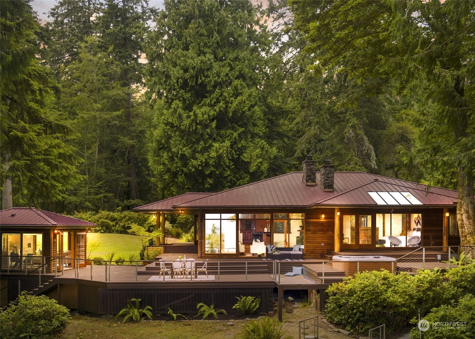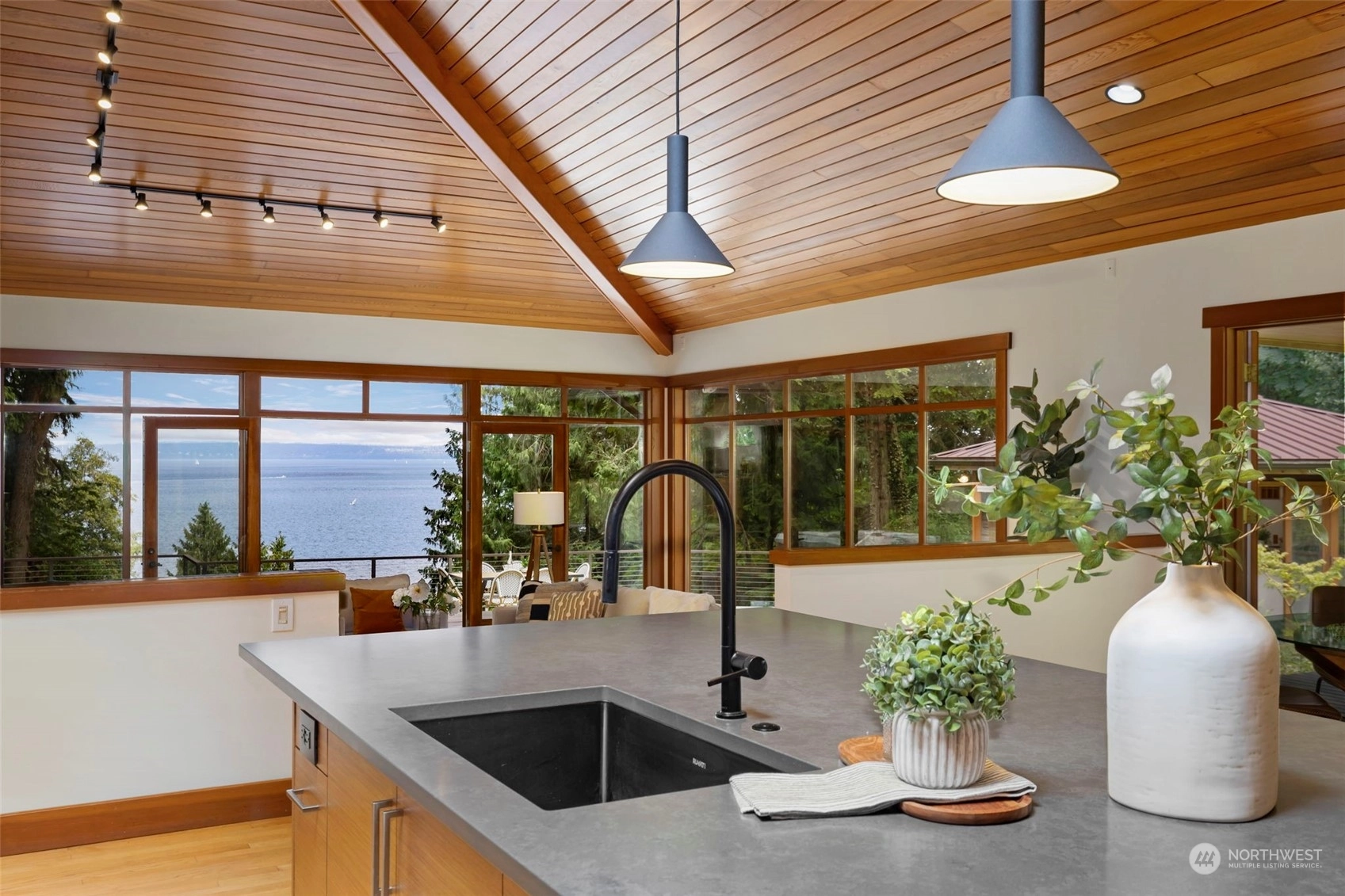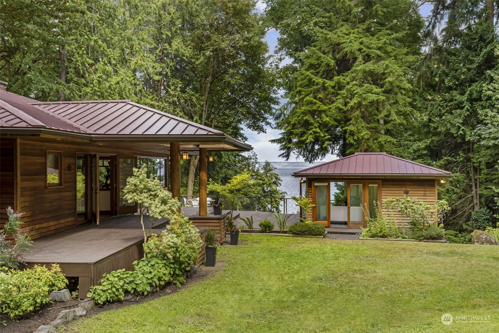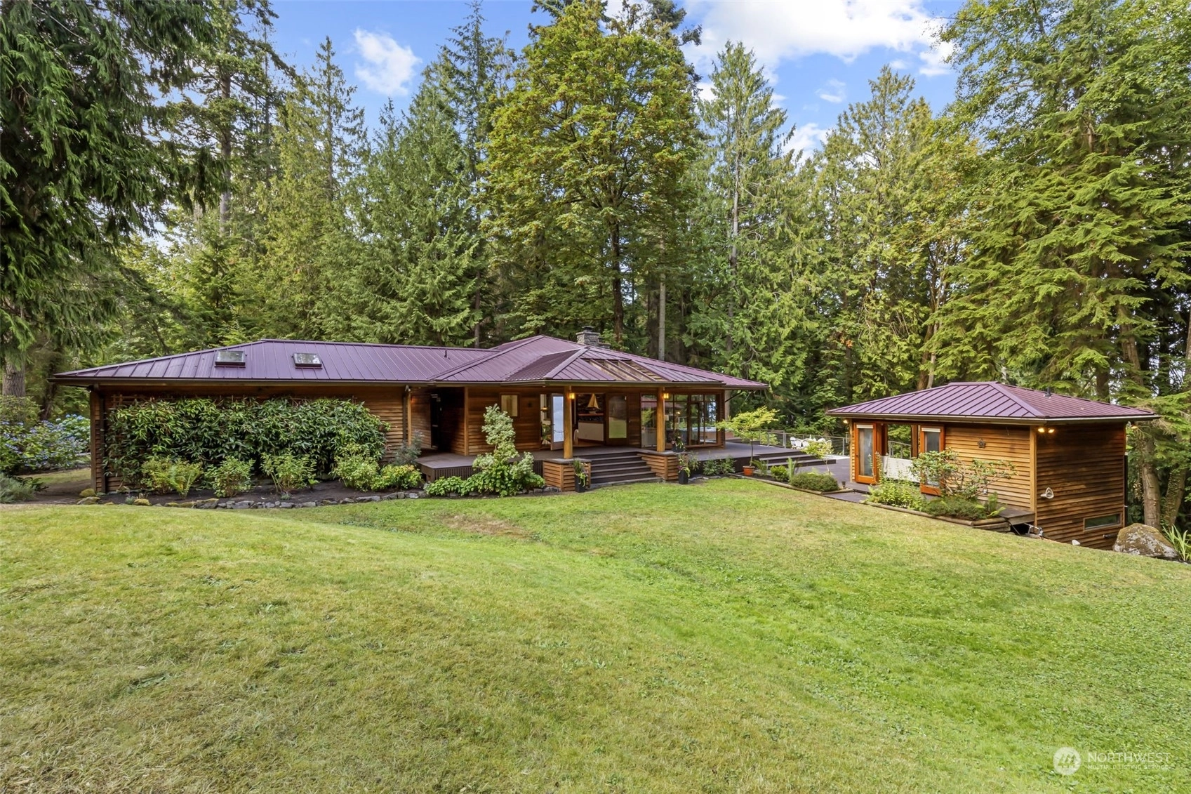 This is the one you've been waiting for—a modern island retreat with it all—privacy, views, multiple outbuildings and a beach! Single-level home boasts thoughtful design with dramatic vaulted ceilings, open floor plan, chef’s kitchen and expansive windows showcasing views of the Sound and Cascades. The home opens up beautifully to its stunning environment with wrap around deck and entertaining spaces. Pathways lead to the many amenities on this 1-acre private compound: guest cottage with water views, 796 SF studio, pond, hobby farm, dog run, and co-owned private bulkhead and beach with seeded oyster and clam farming. This rare opportunity offers all the benefits of coastal living without compromising space for guests, hobbies or privacy.