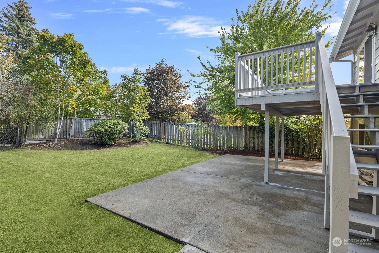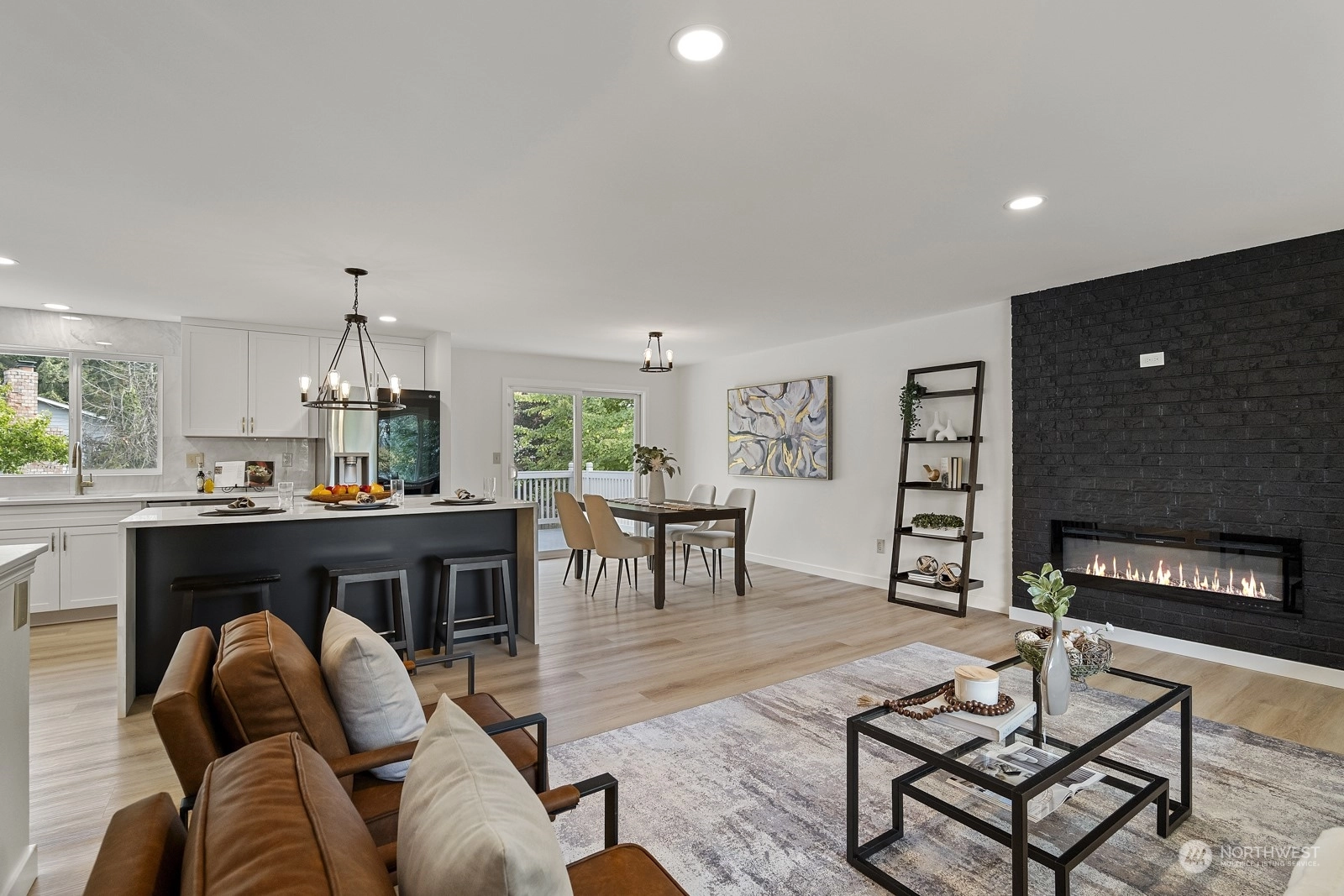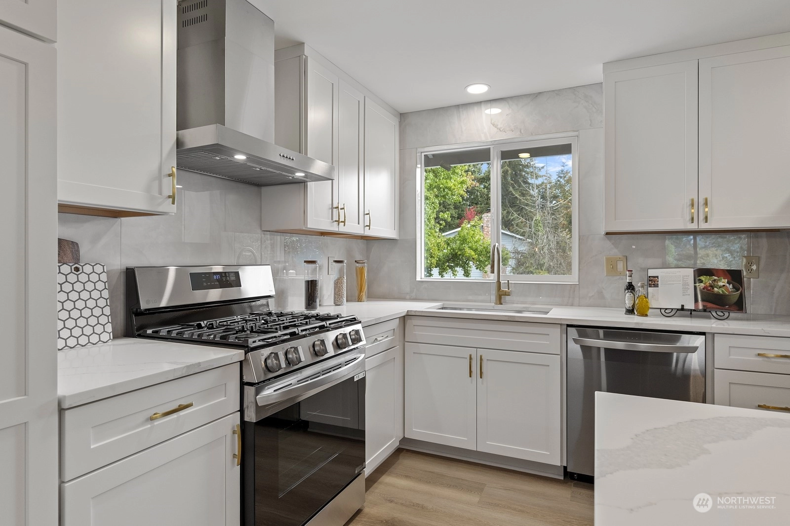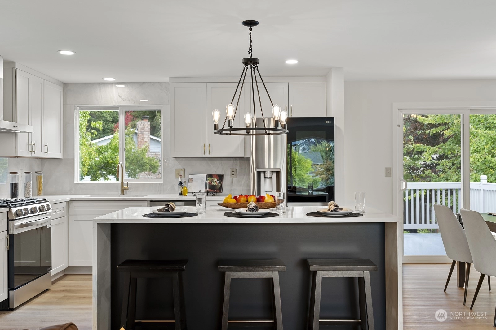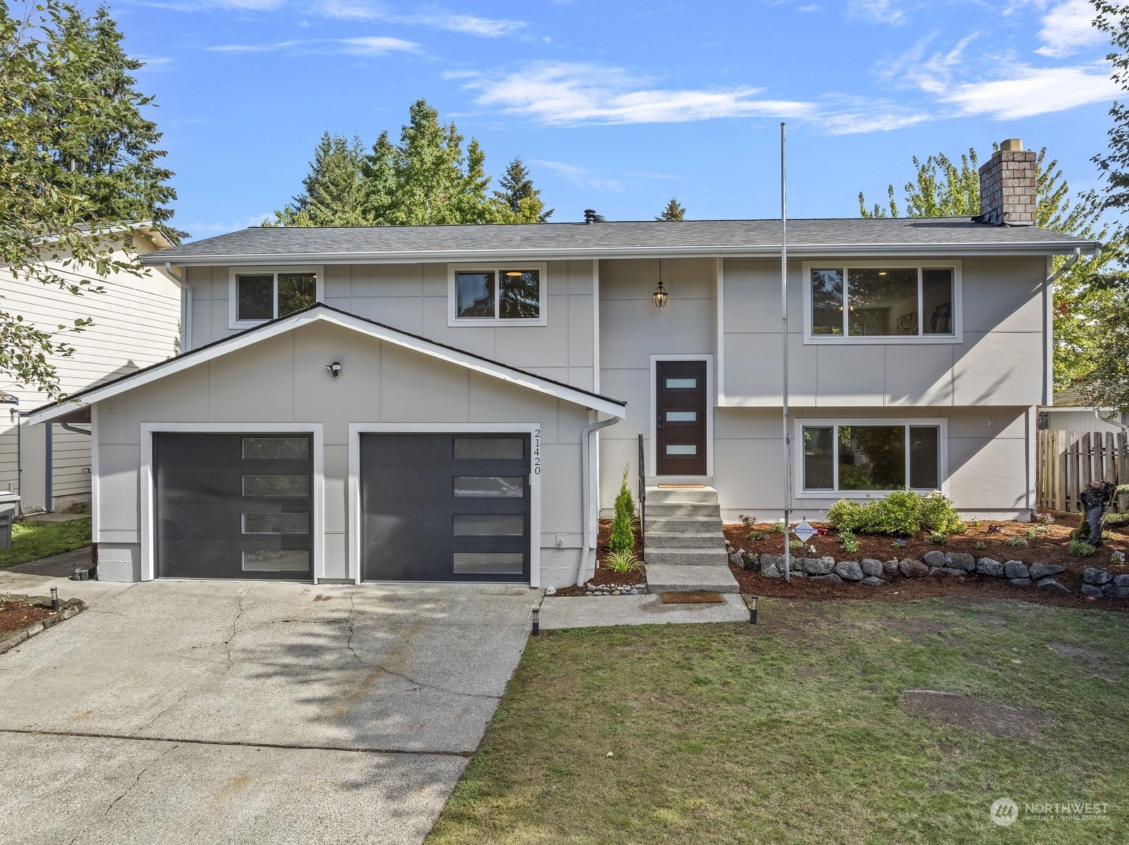 Move in ready and sure to delight! Beautifully updated inside and out. New floors throughout, new windows, new roof, doors & lighting, 2 new kitchens, 3 new bathrooms, each with rain head shower + hand held. 2 new fireplaces, new deck overlooking fully fenced back yard. Main kitchen features slab Island breakfast bar, all stainless steel appliances including gas cook top. Primary on upper level with adjacent bathroom. 2 more bedrooms up with full bath in hallway. Lower level with 4th bedroom, second kitchen and living space. Ideal for MIL or rental space. Plum + cherry trees plus Blueberry bush. Walking distance to schools and parks. Welcome home!