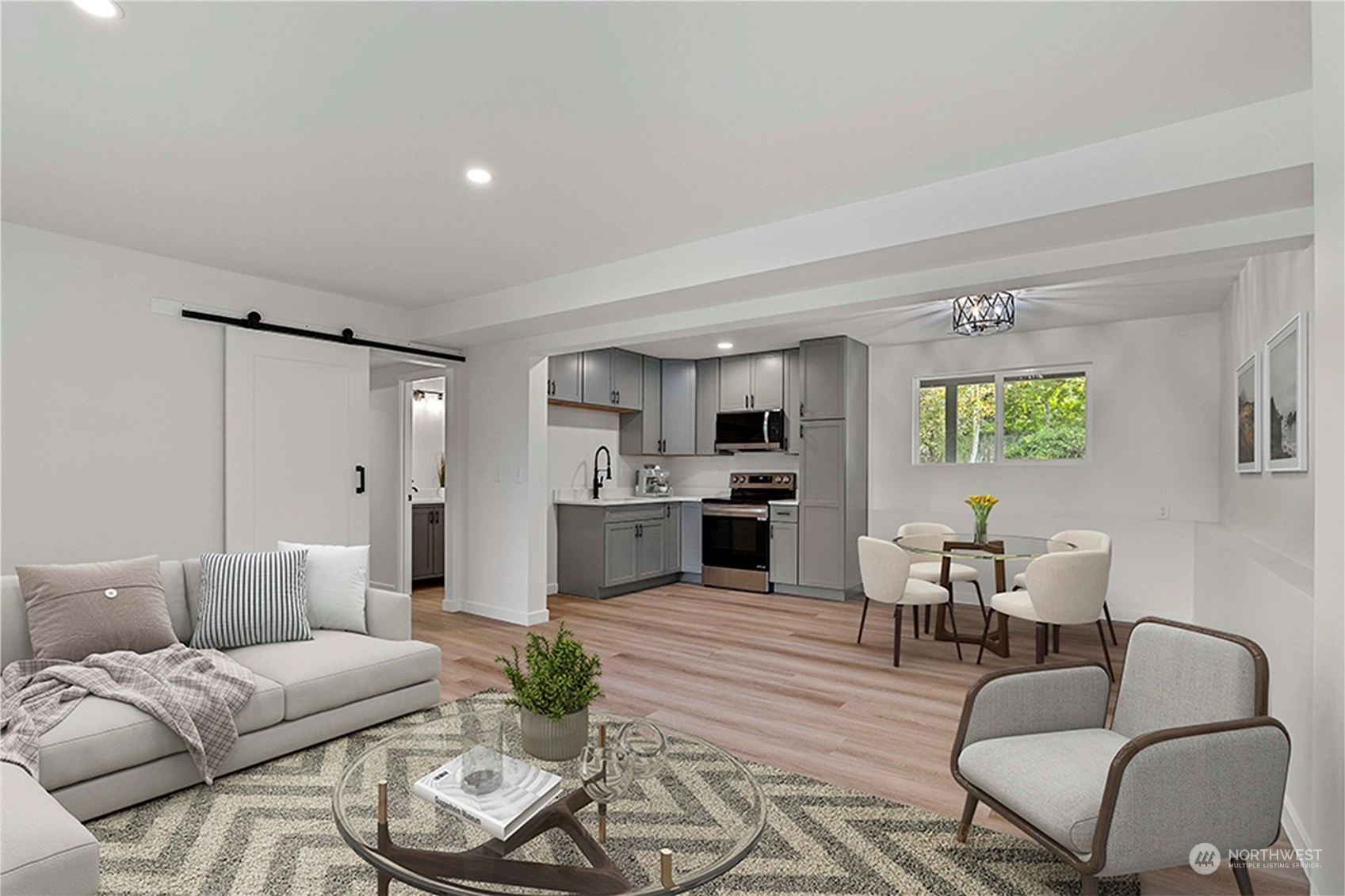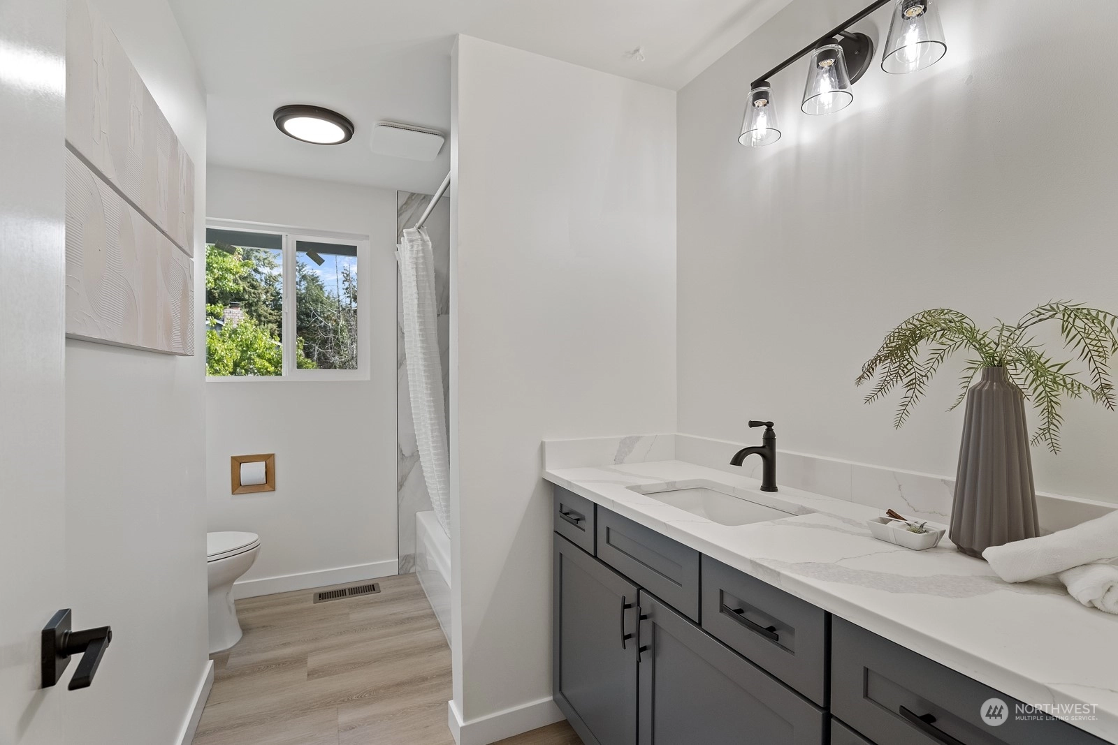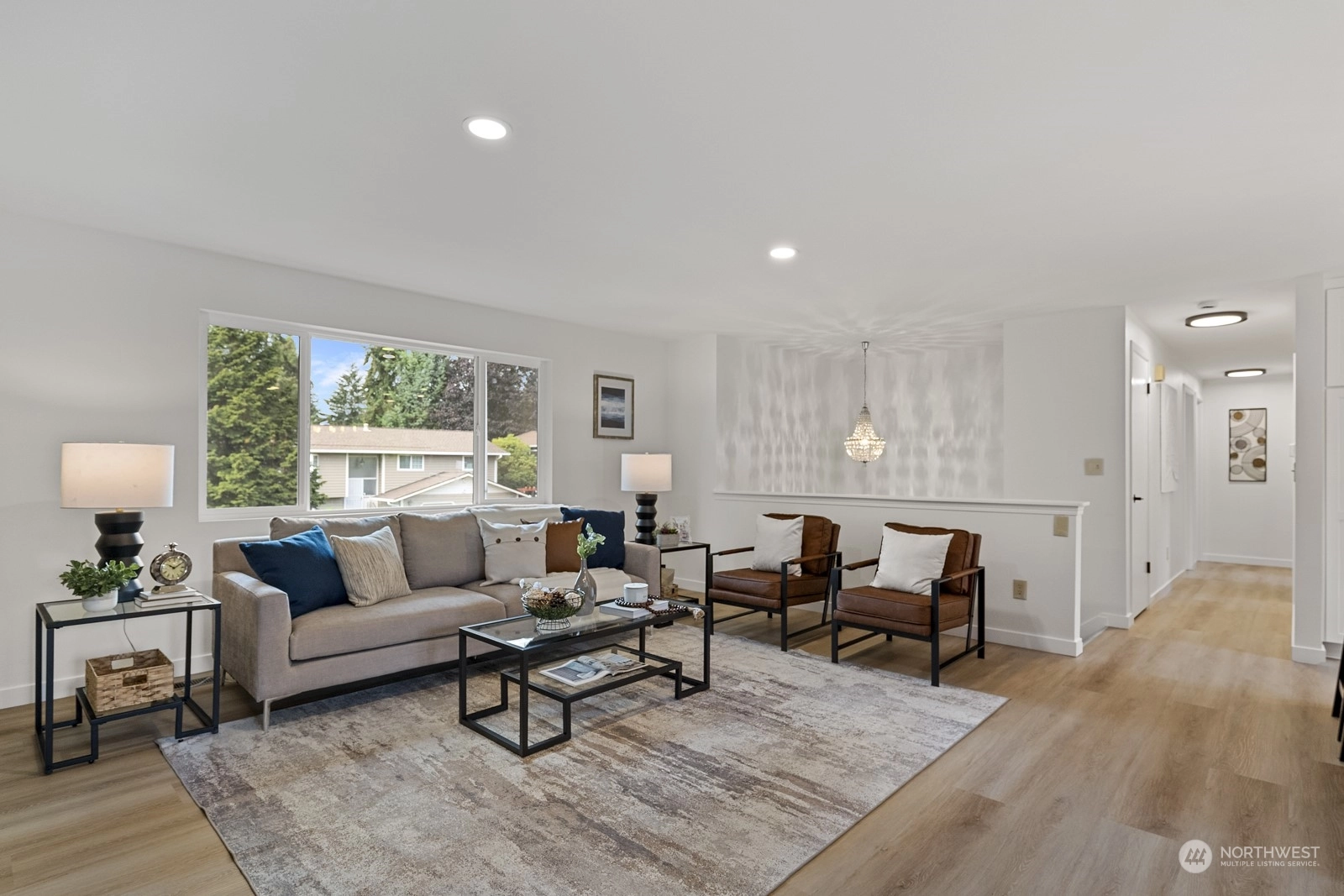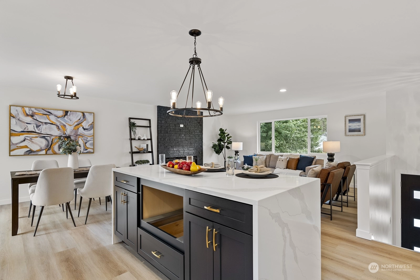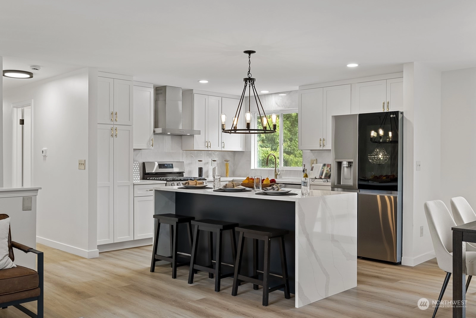 Move in ready and sure to delight! Beautifully updated inside and out. New floors throughout, new windows, new roof, doors & lighting, 2 new kitchens, 3 new bathrooms, each with rain head shower + hand held. 2 new fireplaces, new deck overlooking fully fenced back yard. Main kitchen features slab Island breakfast bar, all stainless steel appliances including gas cook top. Primary on upper level with adjacent bathroom. 2 more bedrooms up with full bath in hallway. Lower level with 4th bedroom, second kitchen and living space. Ideal for MIL or rental space. Plum + cherry trees plus Blueberry bush. Walking distance to schools and parks. Welcome home!