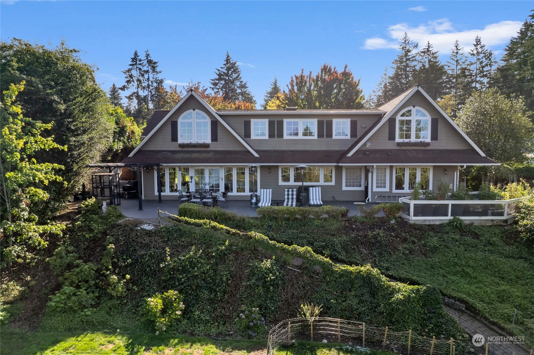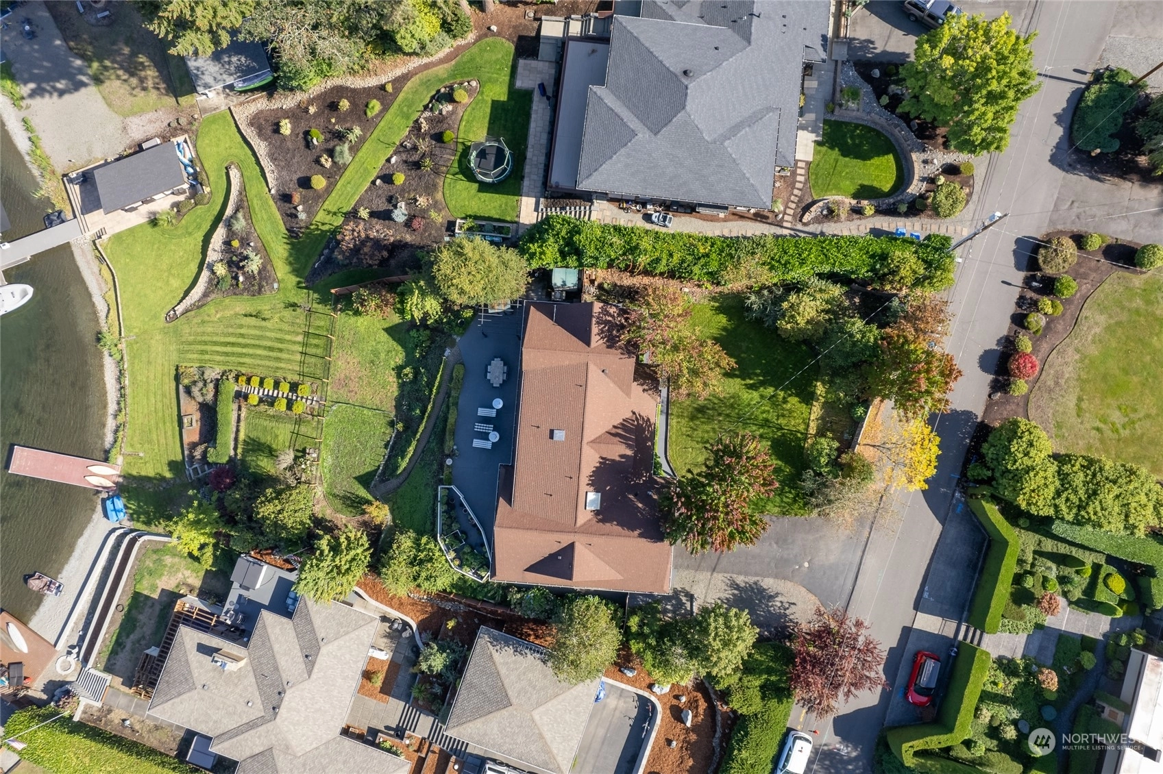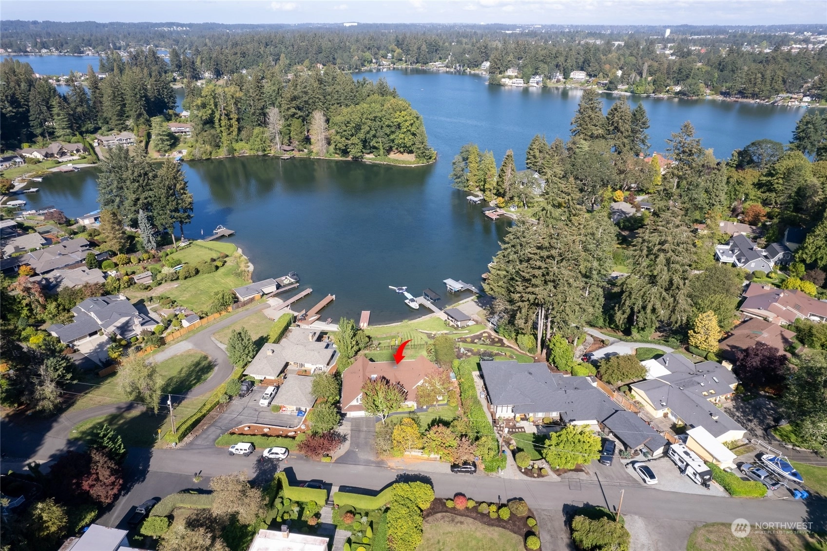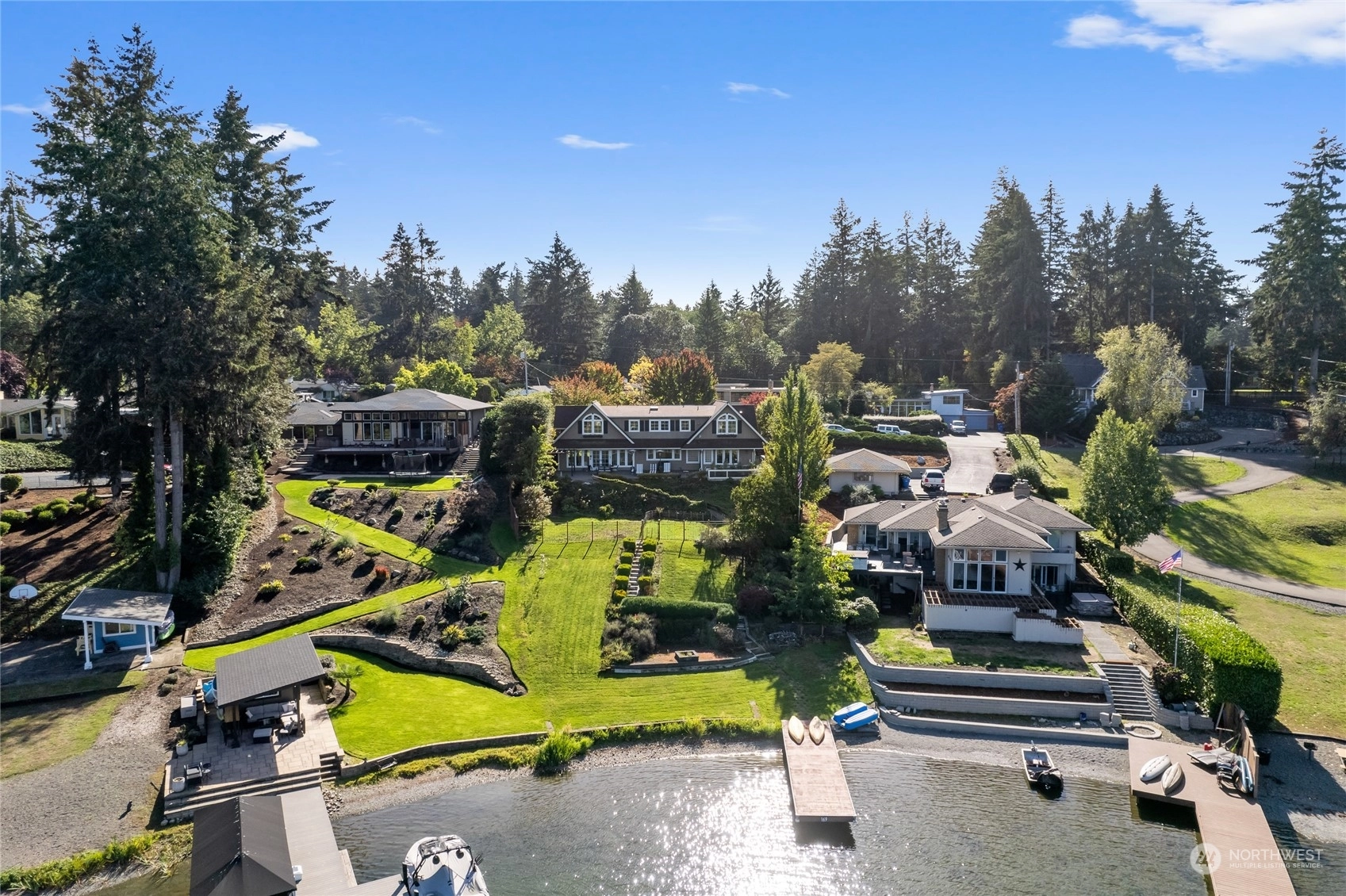 A rare opportunity in historic Evergreen Terrace, where life on Steilacoom Lake awaits! This custom-designed home features vaulted ceilings with exposed beams and 5 bedrooms, 4 bathrooms, spread across 3,096 sq ft of living space. Enjoy stunning lake views from almost every room. The main level offers hardwood floors, a cozy fireplace, a guest suite, and a convenient utility mudroom. Step out onto the terrace for your morning coffee, overlooking beautifully landscaped gardens and 60 feet of private lakefront with a dock. Central A/C for warm summers. Wired for generator, hot tub, and gas line for BBQ. Experience lakefront living at its finest!