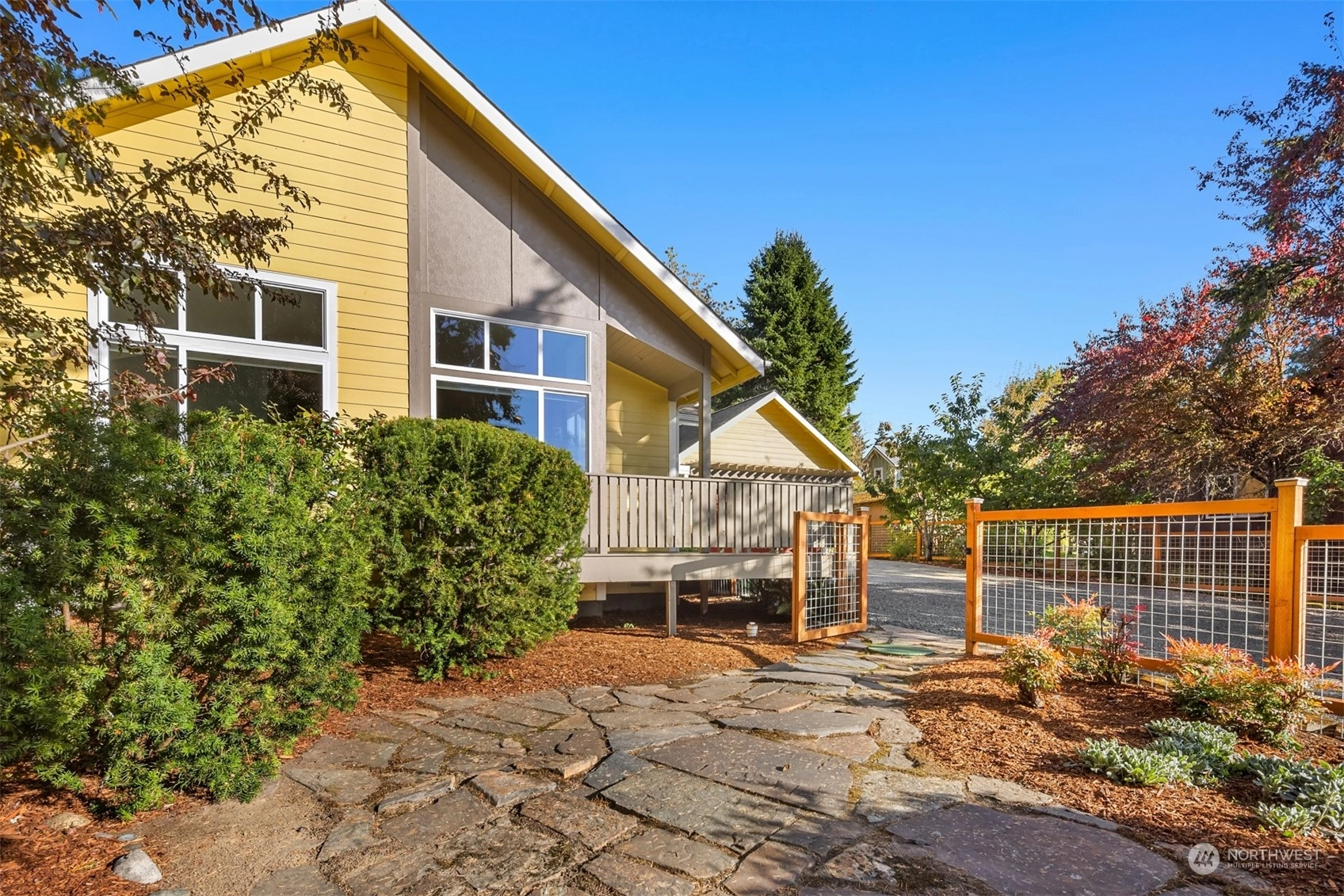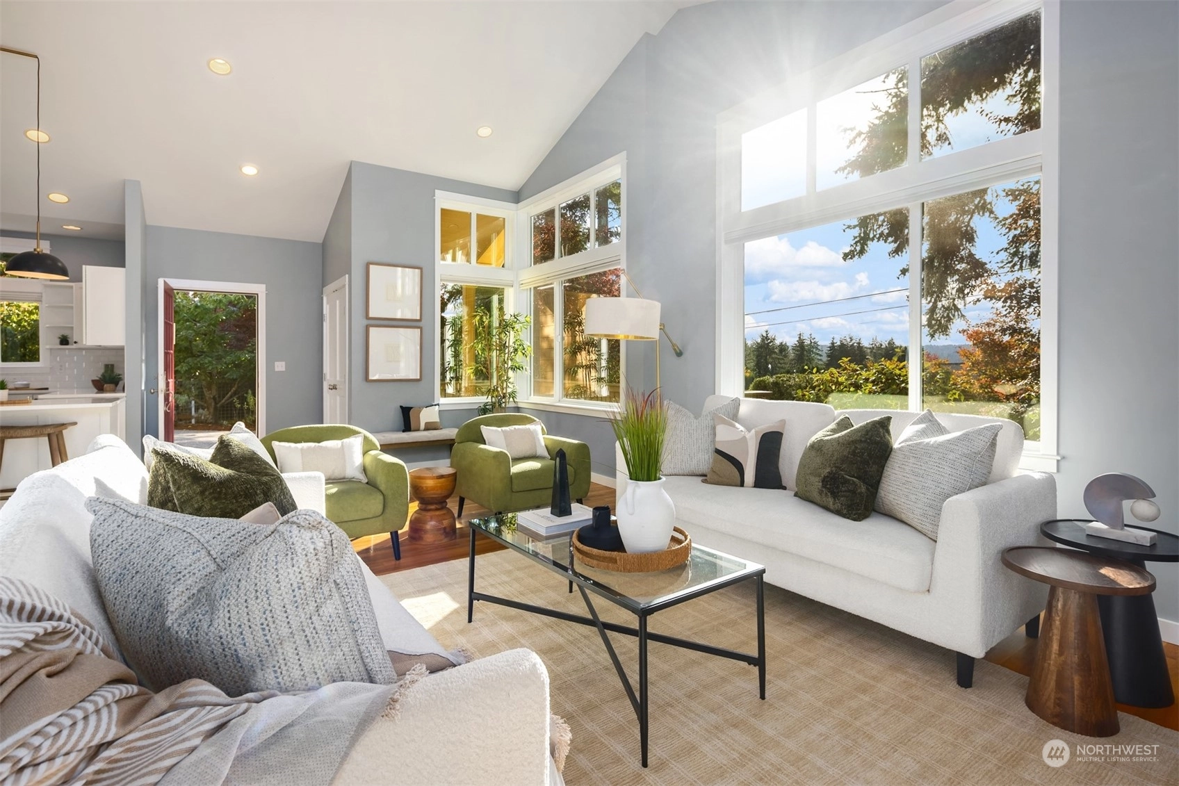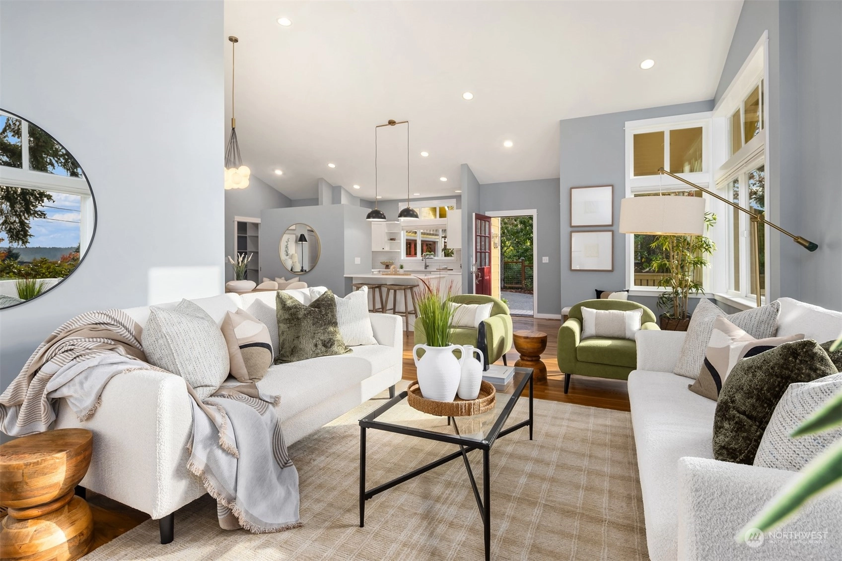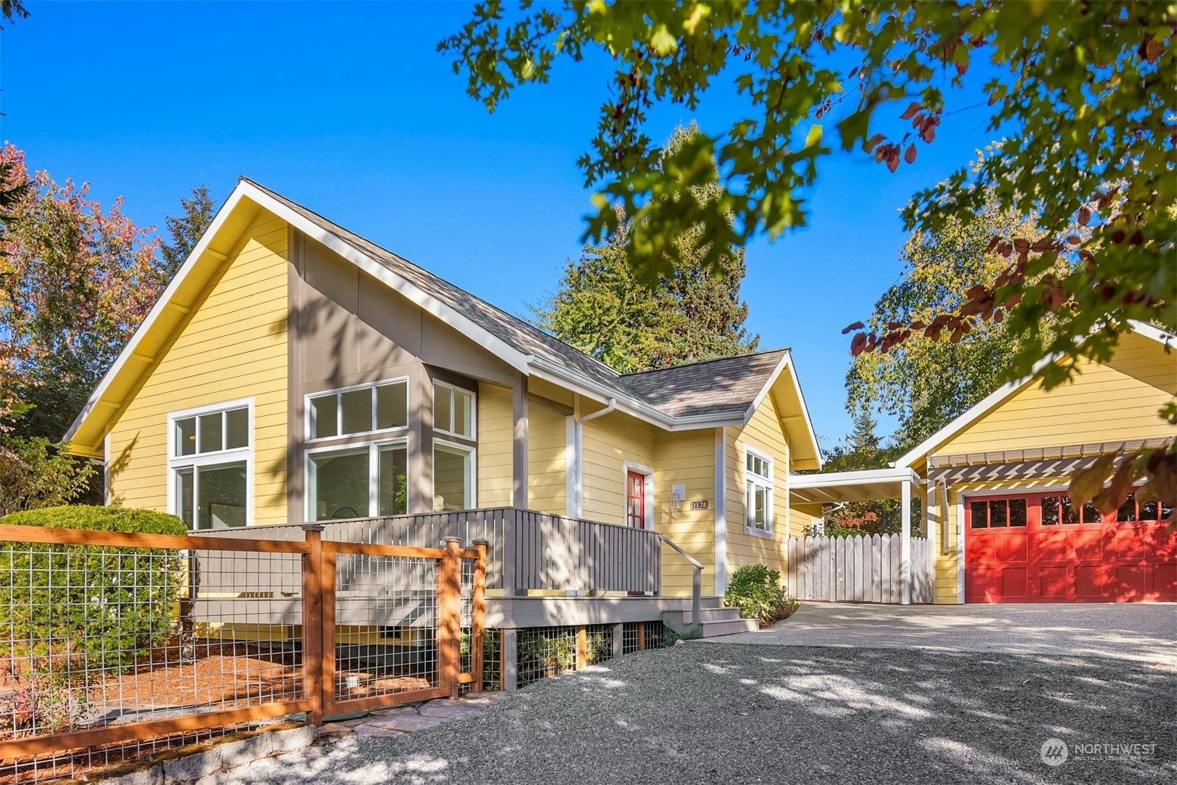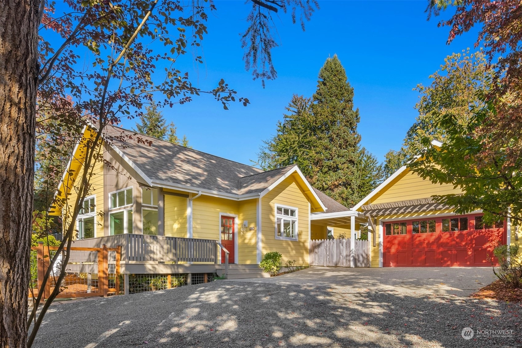 Discover this custom rambler, built in 2005—no steps or stairs! Move-in ready, immaculate home welcomes you w/ warmth. Open the door to a sunlit floor plan w/ soaring ceilings & oversized windows. West-facing big sky views & stunning sunsets + a little peek at the Olympics! The heart of the home is a remodeled kitchen w/ modern appl., bar seating & updated fixtures. Entertaining is easy across hardwoods in open dining & living areas. 3 beds offer flexible use as an office or studio. Outside, enjoy low-maintenance Hardiplank siding, private grounds, a front deck & back patio. An oversized detached garage connects via a covered breezeway. Located on Winslow’s western edge close to parks, trails, beaches & more. Don't miss this charming home!