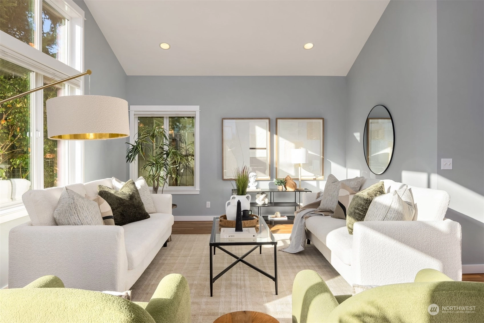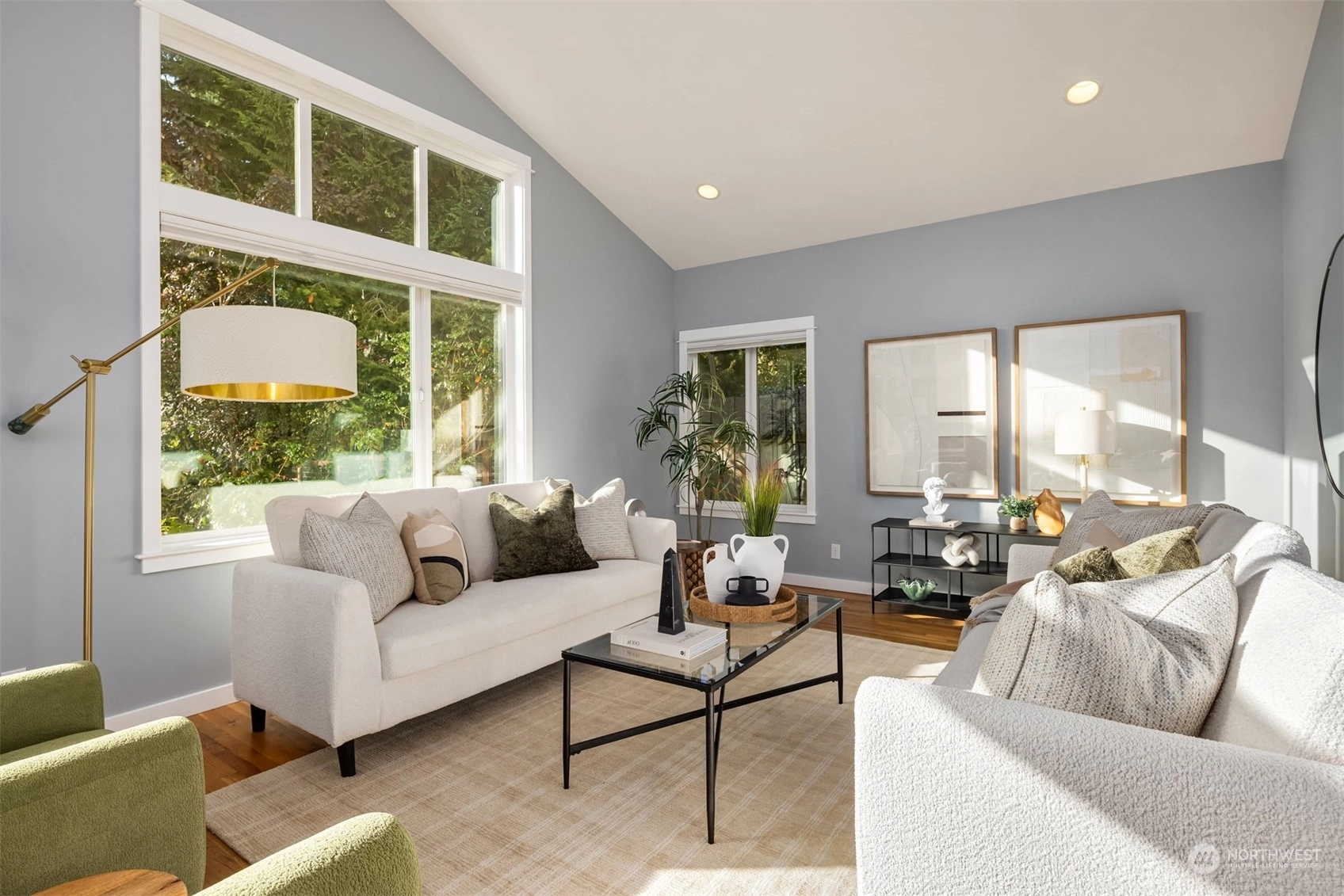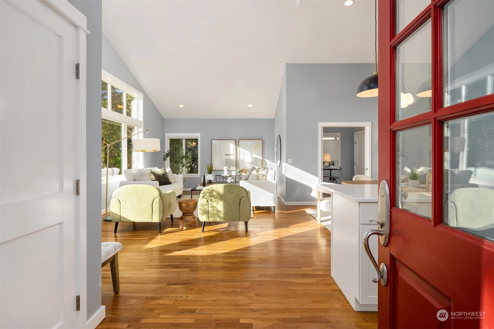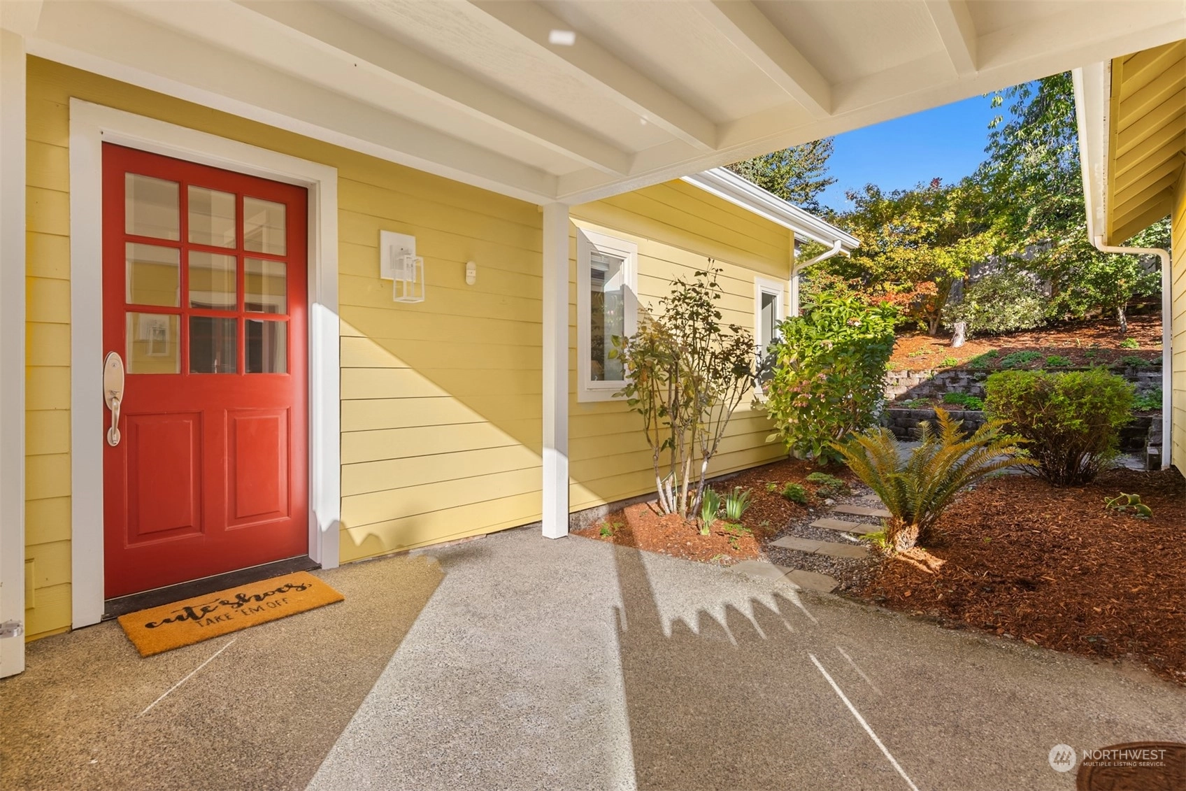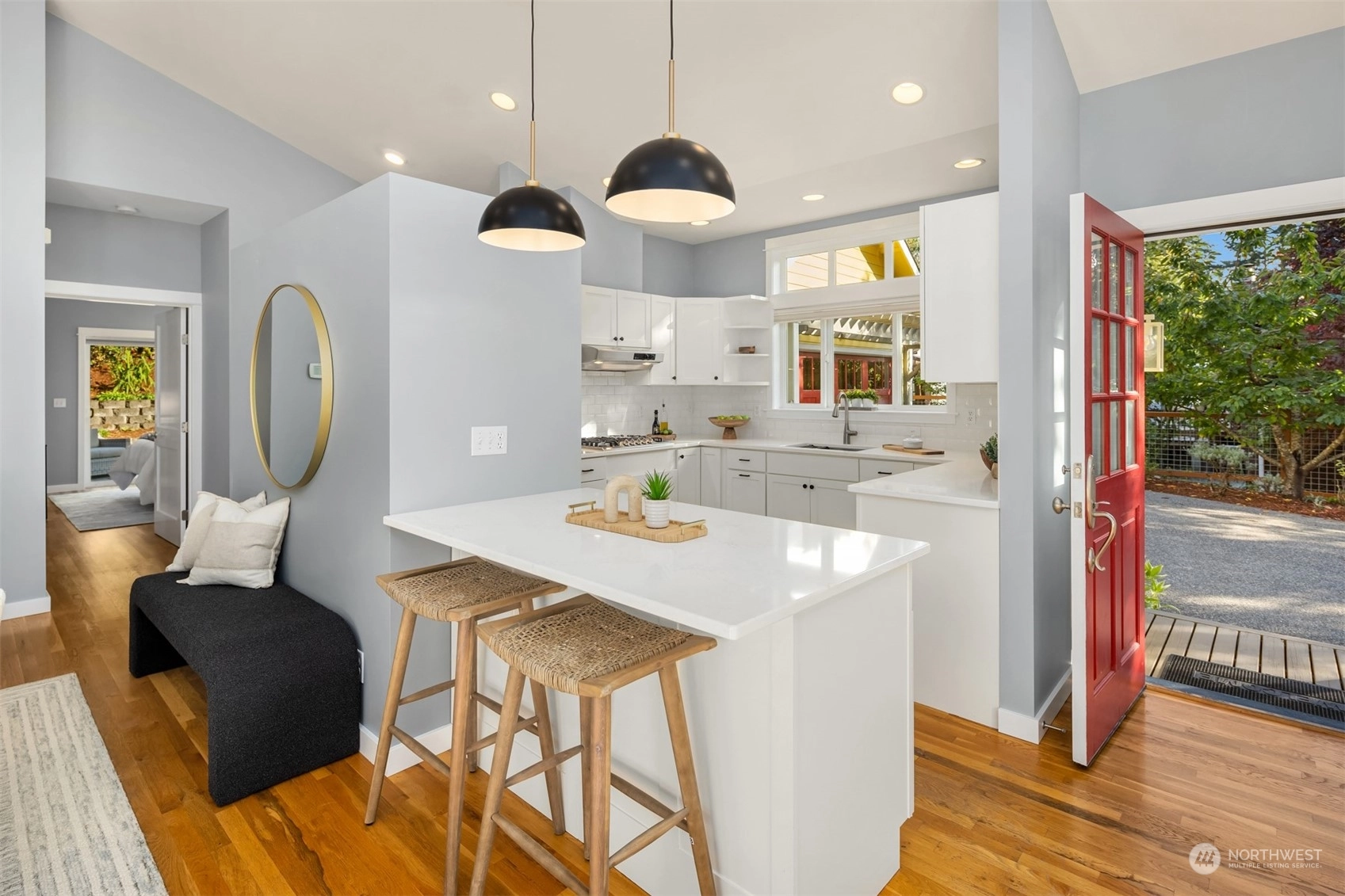 Discover this custom rambler, built in 2005—no steps or stairs! Move-in ready, immaculate home welcomes you w/ warmth. Open the door to a sunlit floor plan w/ soaring ceilings & oversized windows. West-facing big sky views & stunning sunsets + a little peek at the Olympics! The heart of the home is a remodeled kitchen w/ modern appl., bar seating & updated fixtures. Entertaining is easy across hardwoods in open dining & living areas. 3 beds offer flexible use as an office or studio. Outside, enjoy low-maintenance Hardiplank siding, private grounds, a front deck & back patio. An oversized detached garage connects via a covered breezeway. Located on Winslow’s western edge close to parks, trails, beaches & more. Don't miss this charming home!