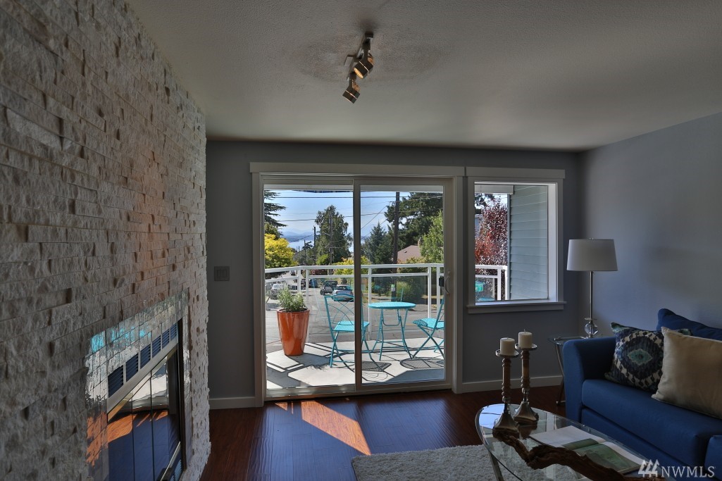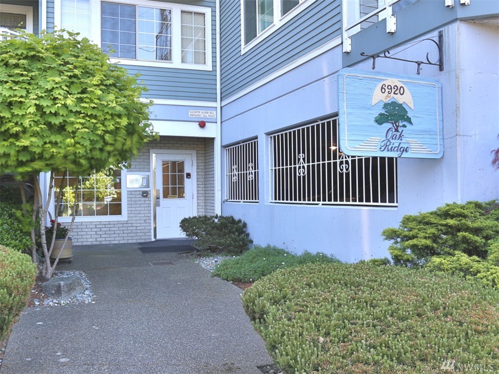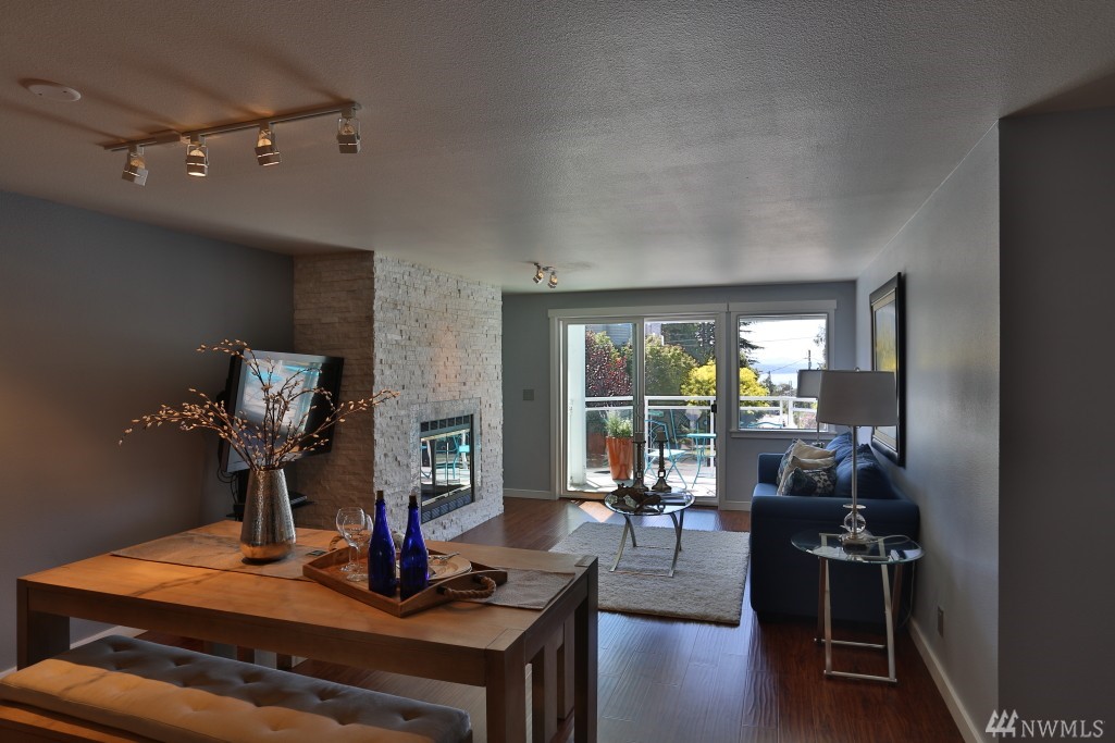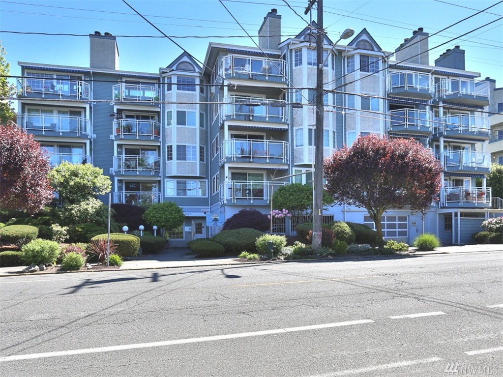 Spacious first floor (not ground floor) condo home in stable well maintained & run building. Western view of Sound and Mtns. Updated kitchen& baths, newer flooring, light and breezy color scheme. 2 bedrooms, 2 bathrooms, Lots of extra large closets, in unit laundry with newer washer/dryer. Living room w/beautiful wood burning fireplace. View deck with sun shade.Easy access to transportation, shopping, dining, recreation. Secure building with elevator, gated garage. 2 pets allowed.