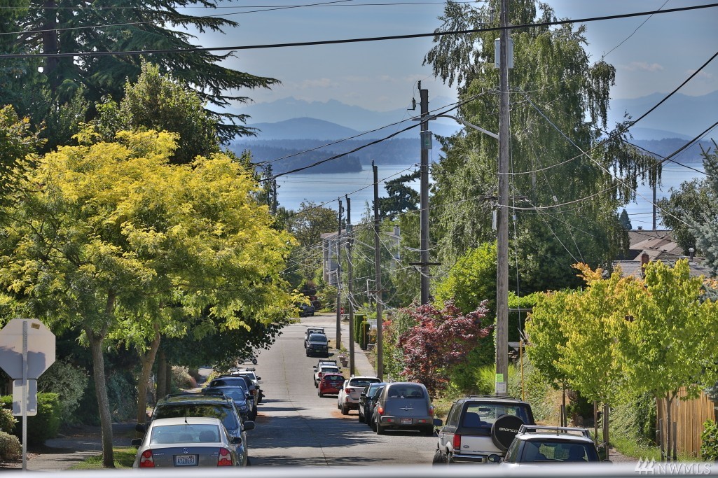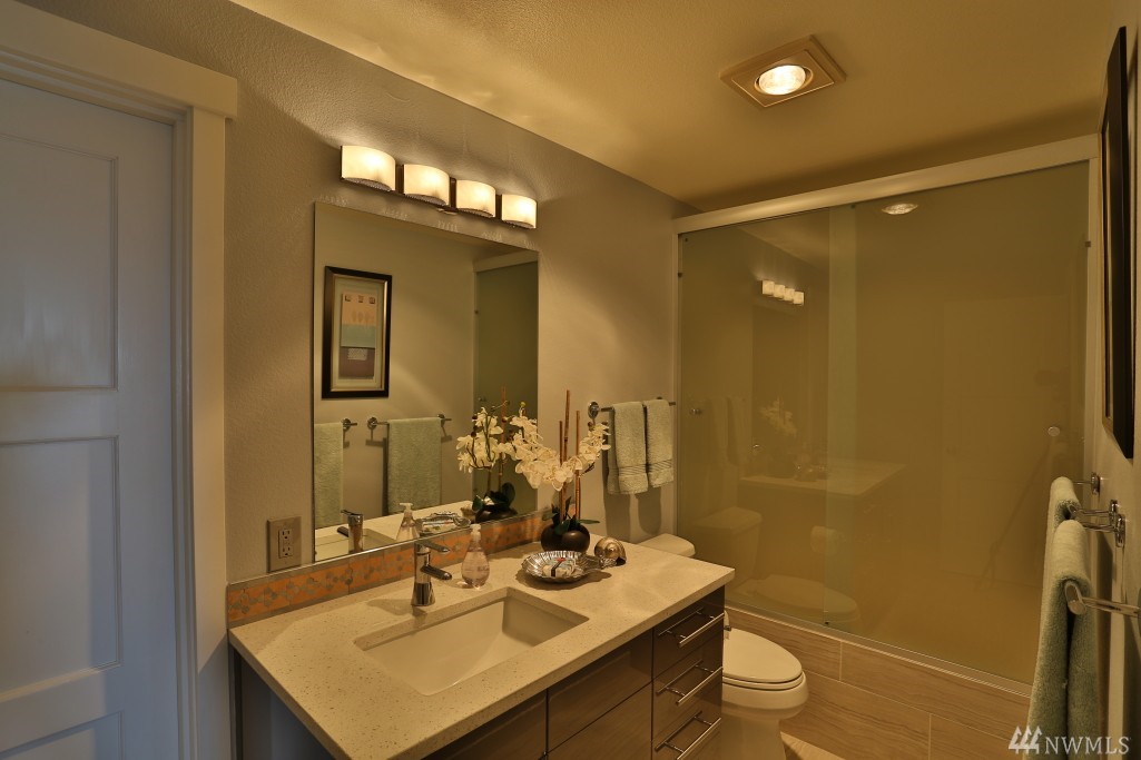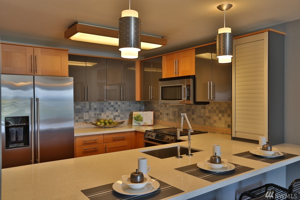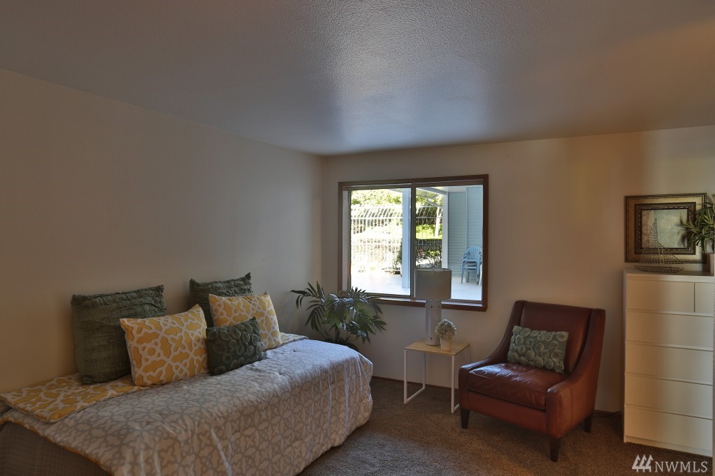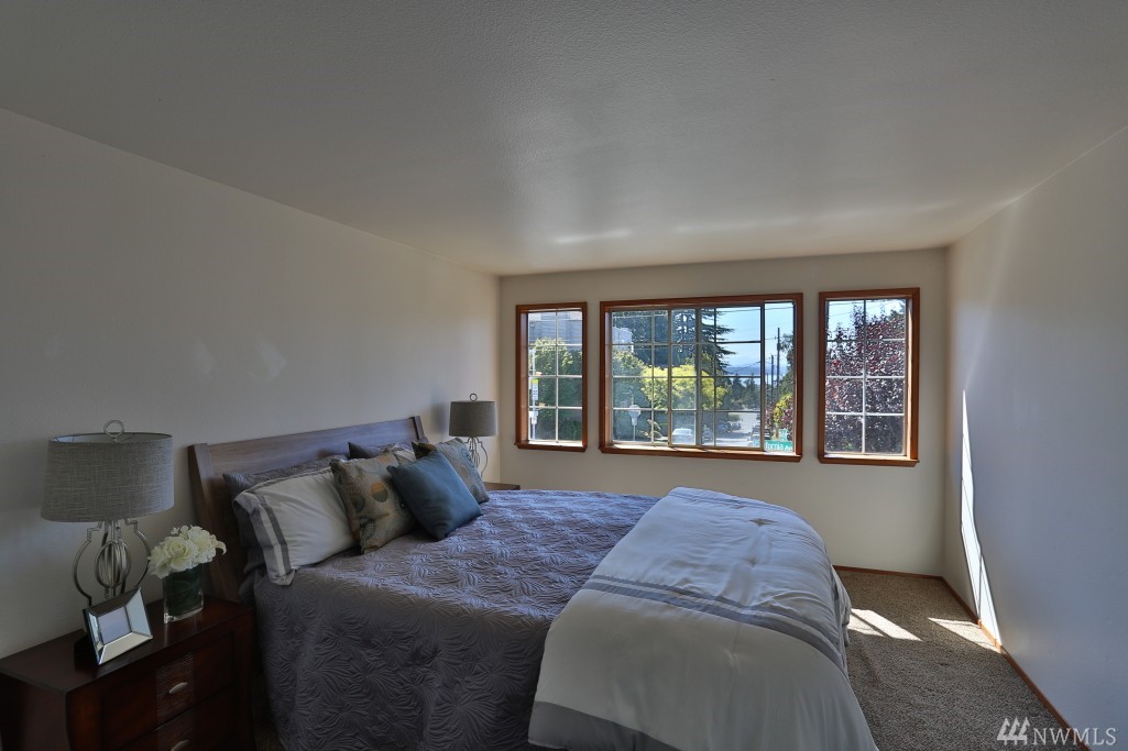 Spacious first floor (not ground floor) condo home in stable well maintained & run building. Western view of Sound and Mtns. Updated kitchen& baths, newer flooring, light and breezy color scheme. 2 bedrooms, 2 bathrooms, Lots of extra large closets, in unit laundry with newer washer/dryer. Living room w/beautiful wood burning fireplace. View deck with sun shade.Easy access to transportation, shopping, dining, recreation. Secure building with elevator, gated garage. 2 pets allowed.