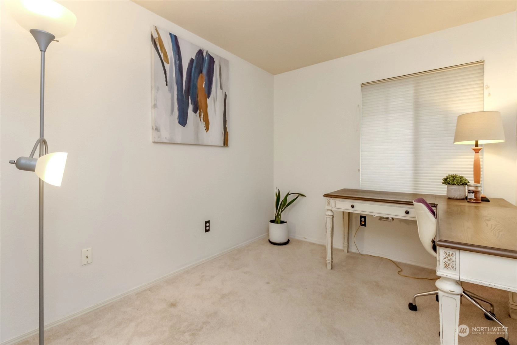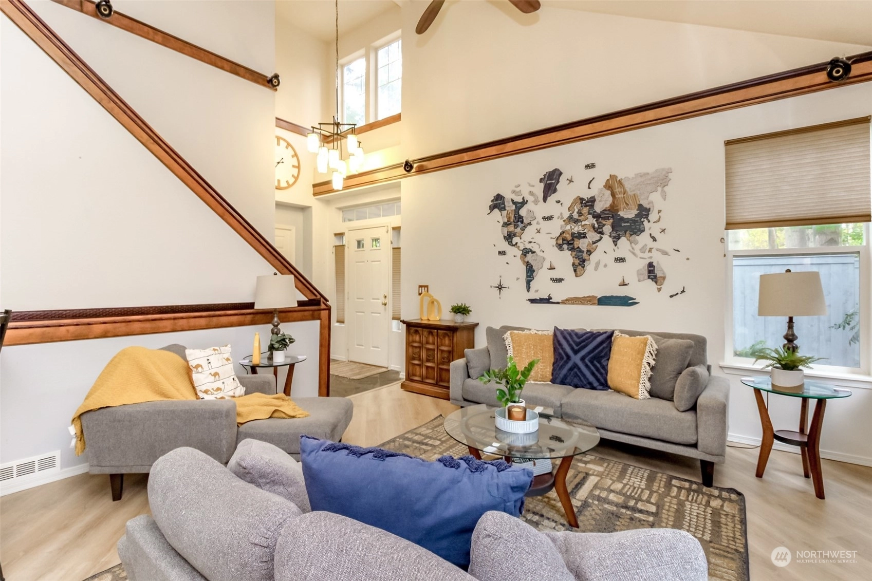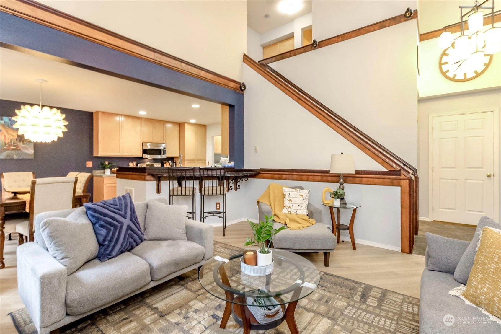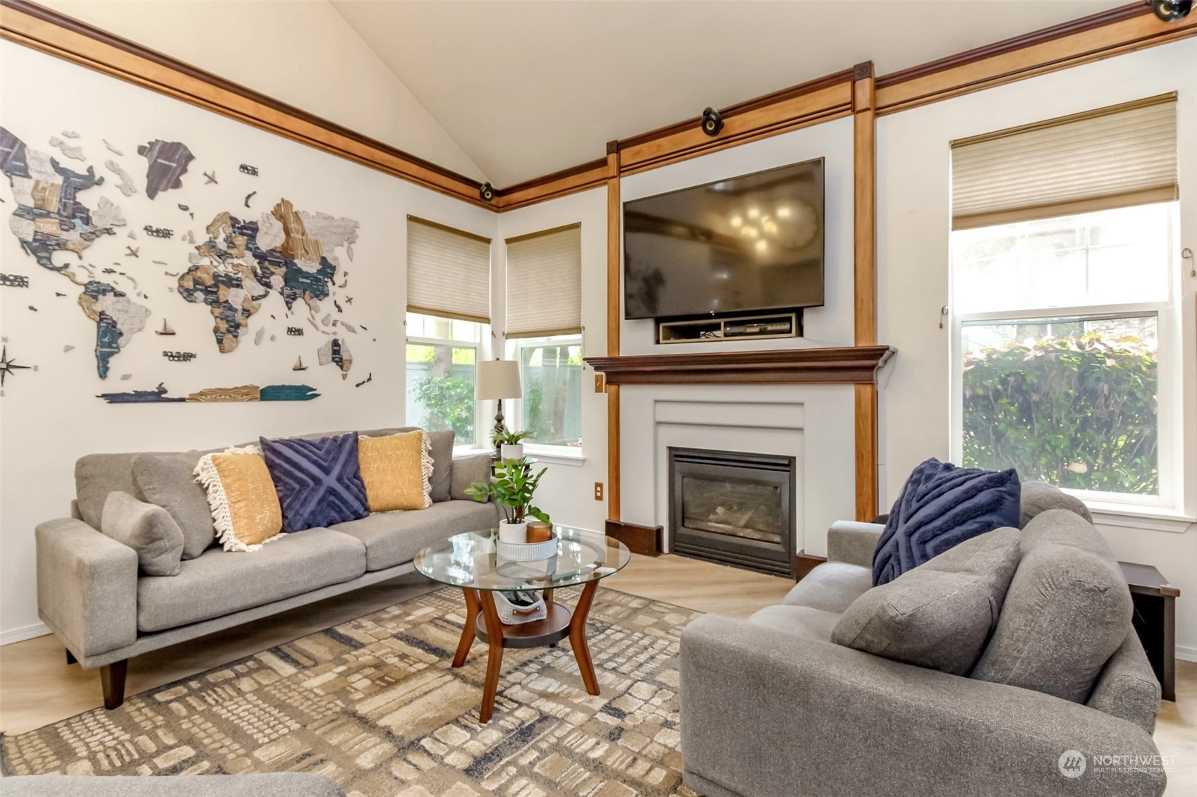 Welcome to the quaint community of Village Gate, combining comfort with convenience in this beautiful end-unit townhome, adjacent to peaceful green space! Step into slate tile floors, soaring ceilings & rich custom mahogany trim accents. Living room boasts a centerpiece fireplace & flows w/luxury vinyl plank floors thru to dining & updated kitchen with stainless steel appliances & breakfast bar. Main floor den & half bath. Upstairs offers owner's suite with en suite 5-piece bath & dual closets, spacious bedrooms, guest bath & built-in study area. Complete with designer colors, custom window treatments. Oversized single car garage + driveway parking. Shopping, dining & business amenities abound, quick access to transit, freeways & airport.