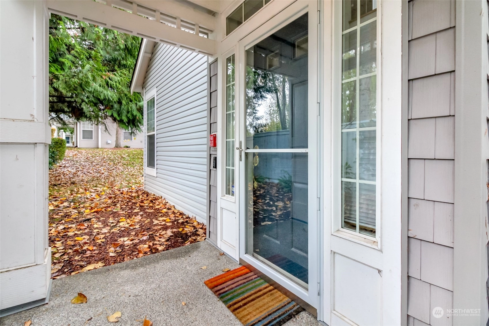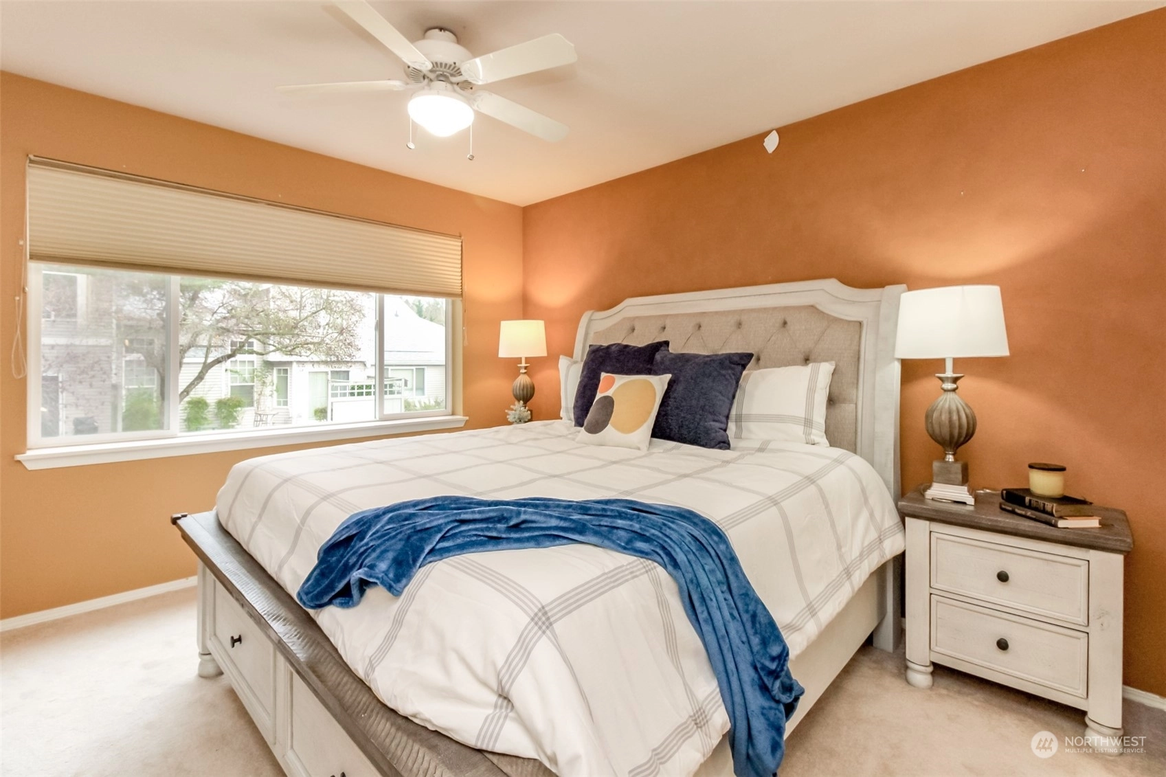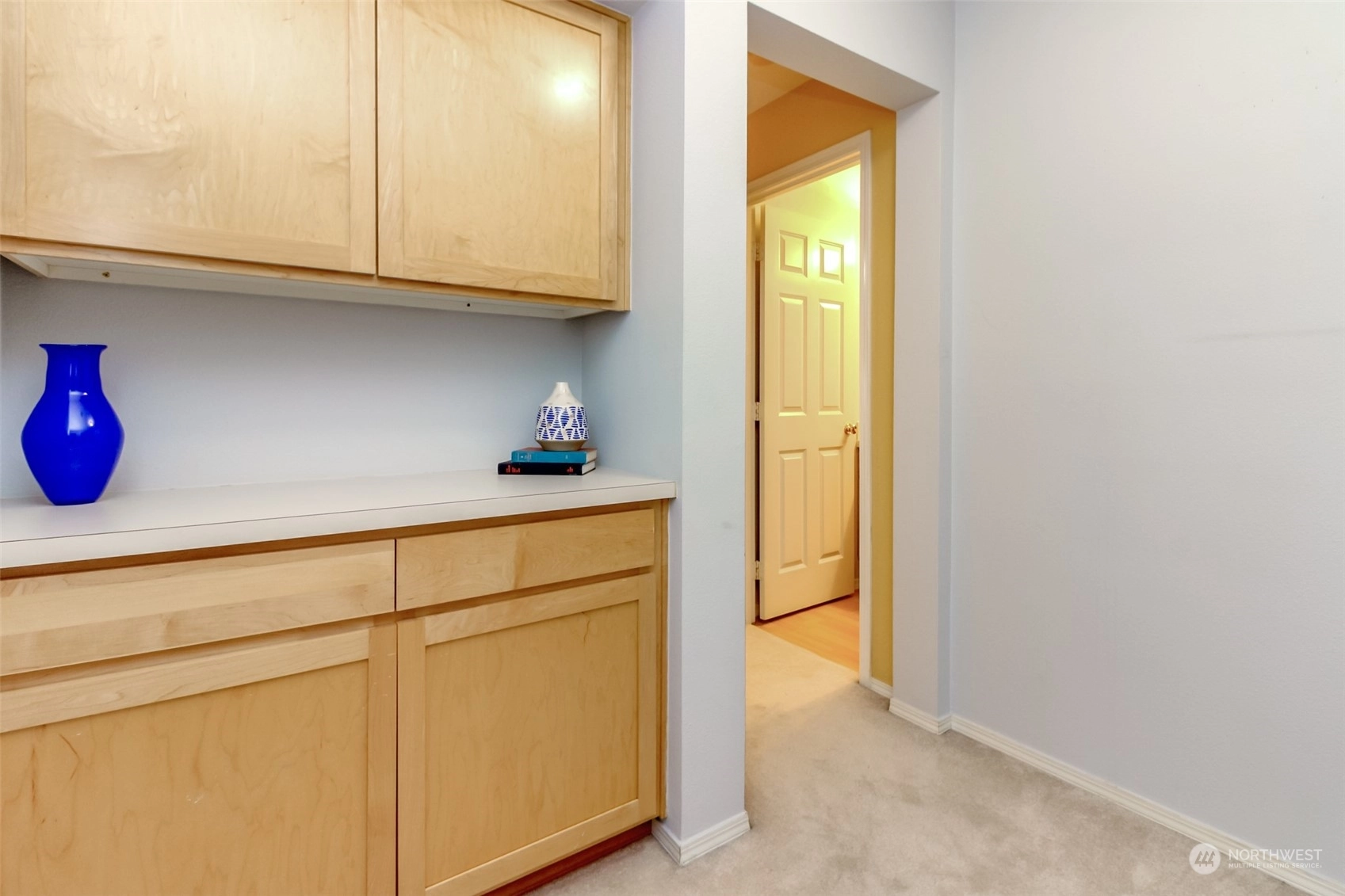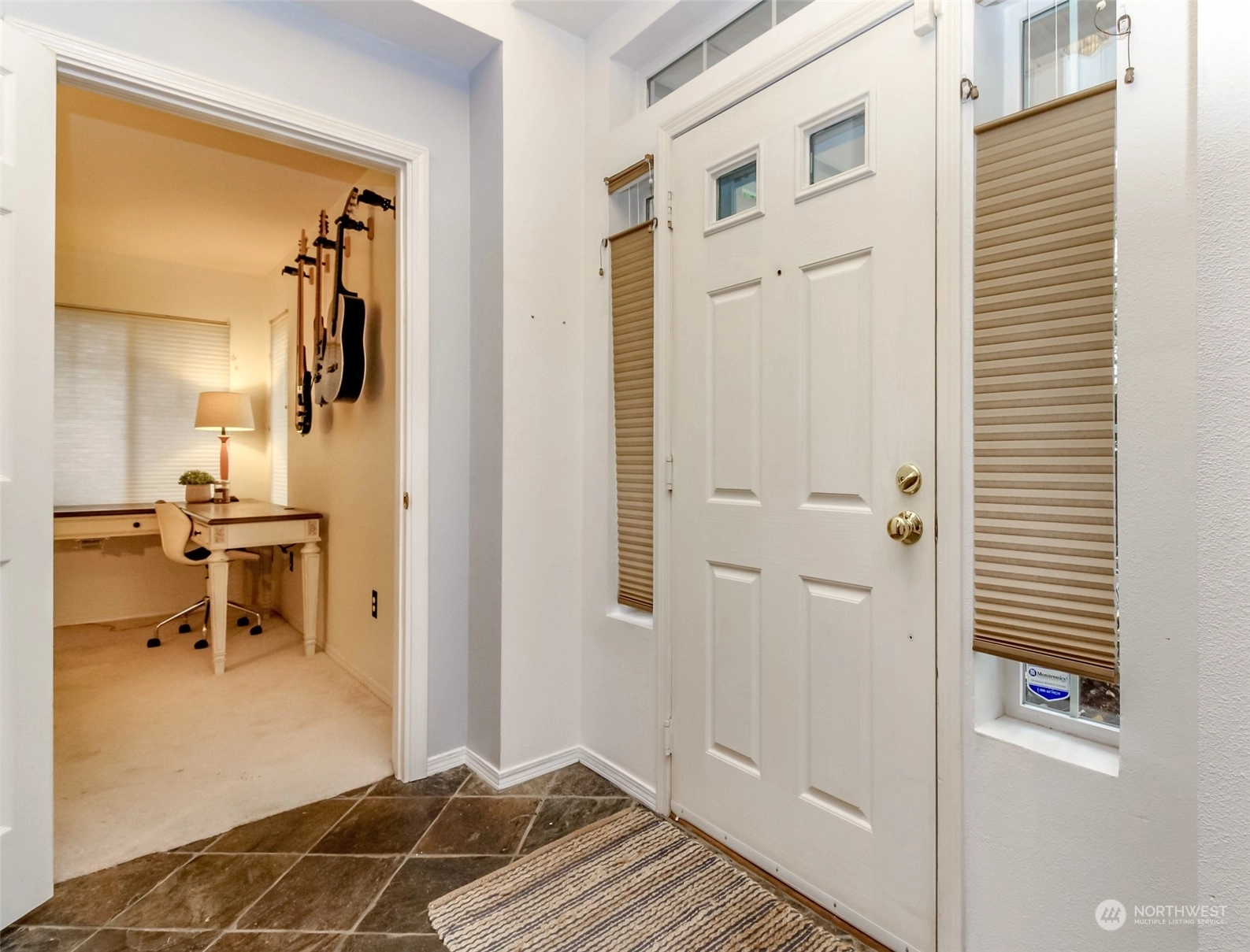 Welcome to the quaint community of Village Gate, combining comfort with convenience in this beautiful end-unit townhome, adjacent to peaceful green space! Step into slate tile floors, soaring ceilings & rich custom mahogany trim accents. Living room boasts a centerpiece fireplace & flows w/luxury vinyl plank floors thru to dining & updated kitchen with stainless steel appliances & breakfast bar. Main floor den & half bath. Upstairs offers owner's suite with en suite 5-piece bath & dual closets, spacious bedrooms, guest bath & built-in study area. Complete with designer colors, custom window treatments. Oversized single car garage + driveway parking. Shopping, dining & business amenities abound, quick access to transit, freeways & airport.