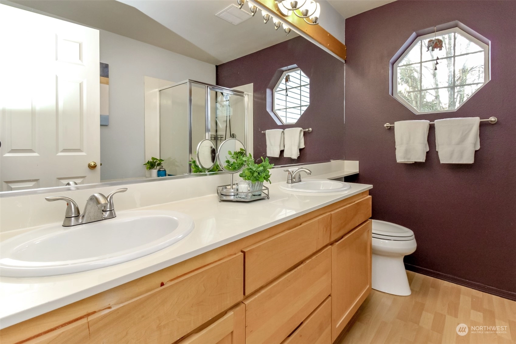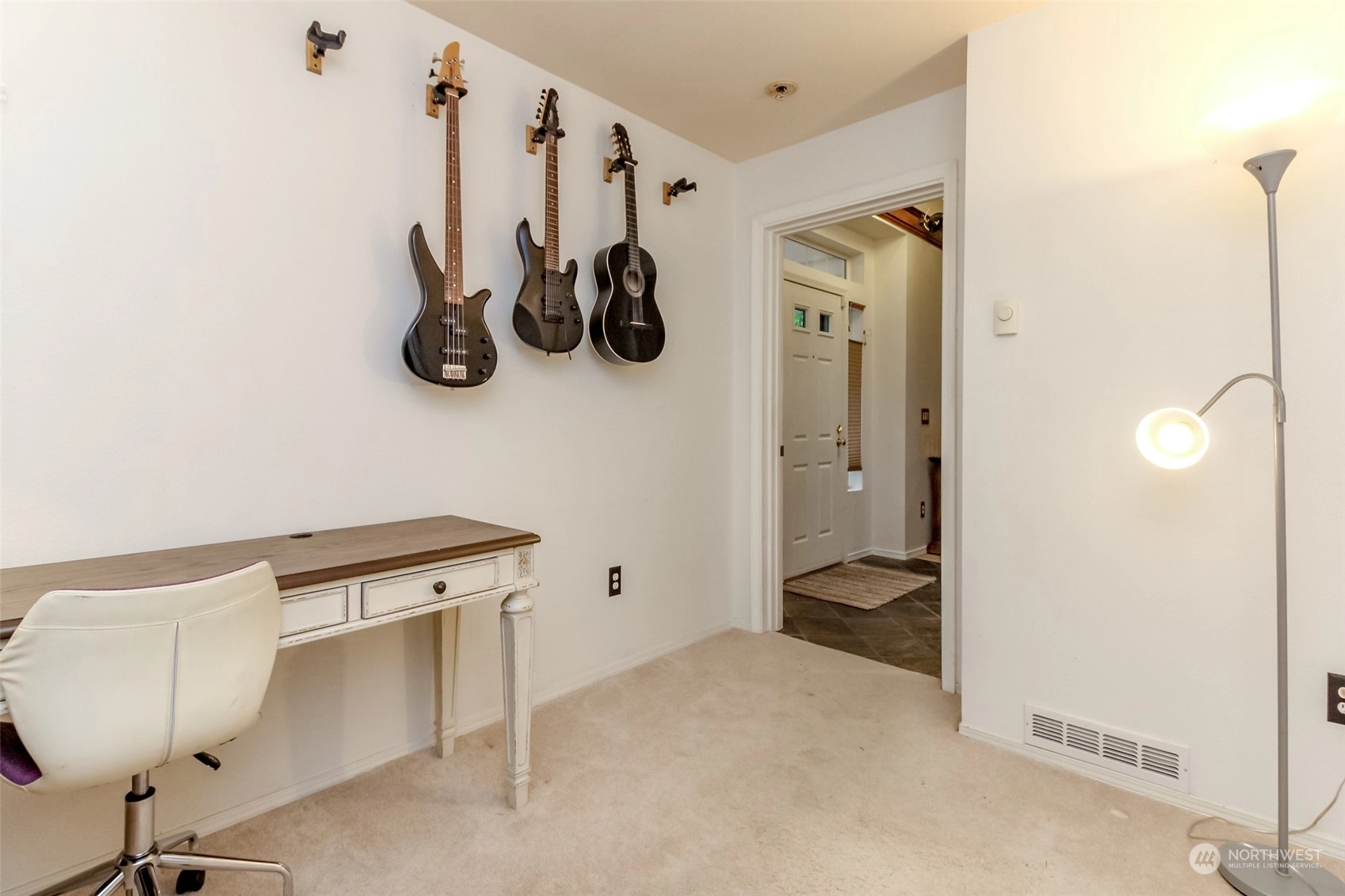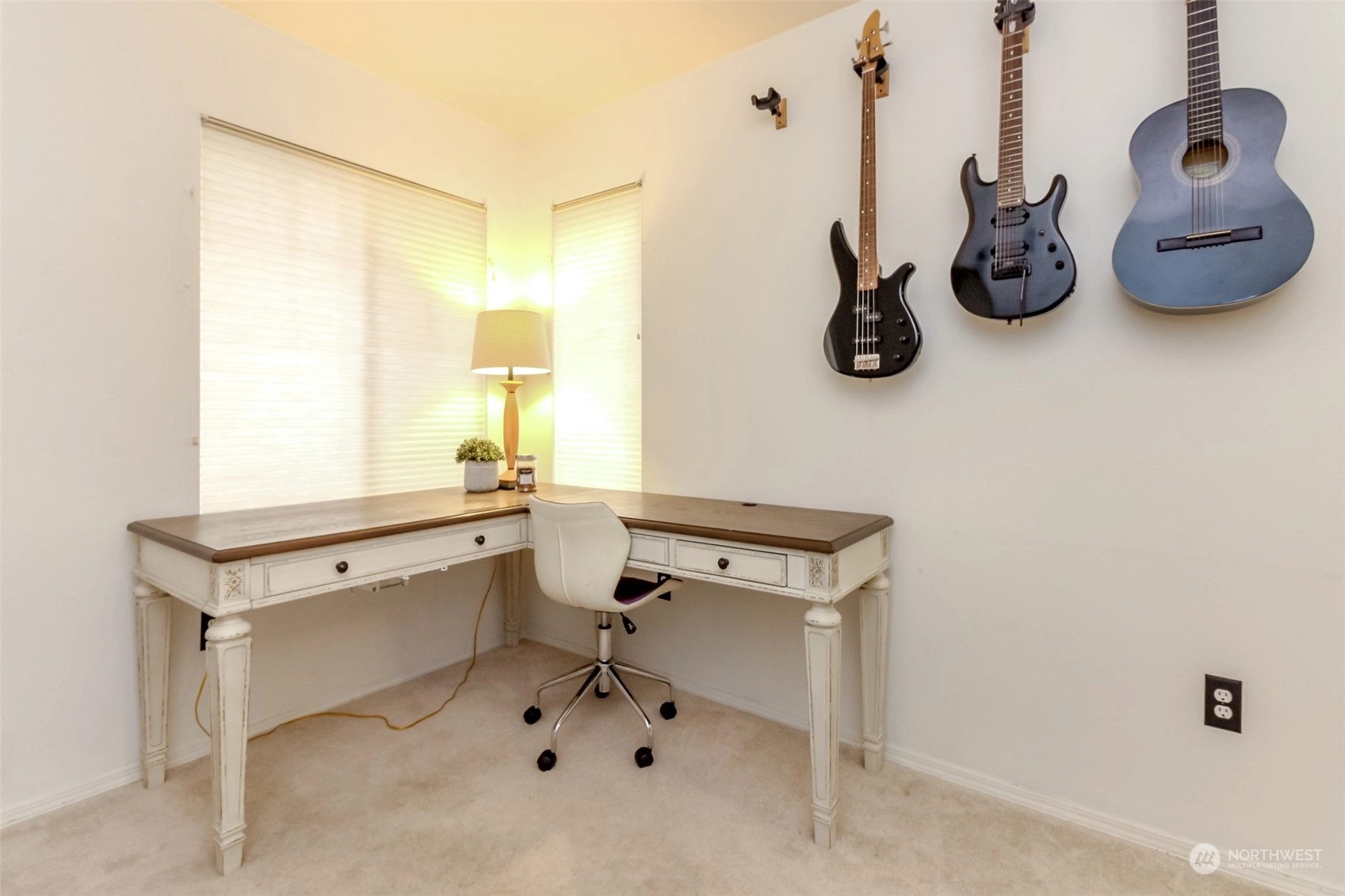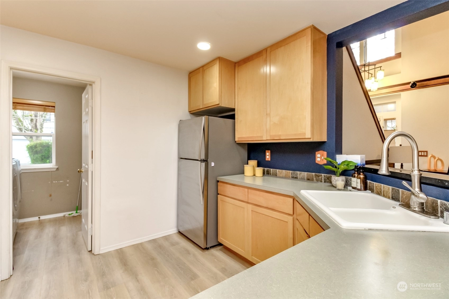 Welcome to the quaint community of Village Gate, combining comfort with convenience in this beautiful end-unit townhome, adjacent to peaceful green space! Step into slate tile floors, soaring ceilings & rich custom mahogany trim accents. Living room boasts a centerpiece fireplace & flows w/luxury vinyl plank floors thru to dining & updated kitchen with stainless steel appliances & breakfast bar. Main floor den & half bath. Upstairs offers owner's suite with en suite 5-piece bath & dual closets, spacious bedrooms, guest bath & built-in study area. Complete with designer colors, custom window treatments. Oversized single car garage + driveway parking. Shopping, dining & business amenities abound, quick access to transit, freeways & airport.