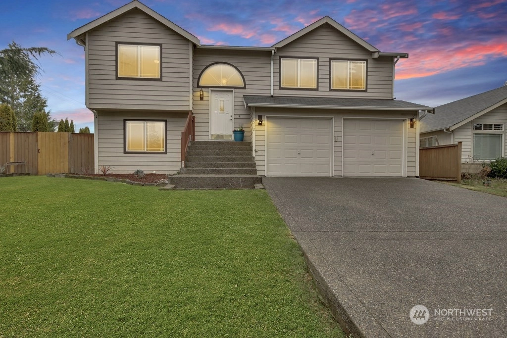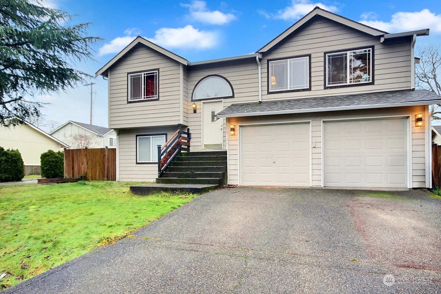 This 4-bedroom, 2.75-bath split-entry Spanaway home offers an ideal blend of comfort and convenience. The open-plan kitchen, dining, and living room flow seamlessly, with a deck off the kitchen for outdoor enjoyment. Upstairs features the primary with en suite bath along with two additional bedrooms and another full bath. Downstairs offers a bedroom, full bath, laundry, spacious family and bonus rooms—ideal for guests and/or a home office. The large backyard features a large patio, storage shed and is fully fenced. Two-car attached garage with shop space. Located near schools, shopping, and JBLM. Must see this fantastic sweat equity opportunity!