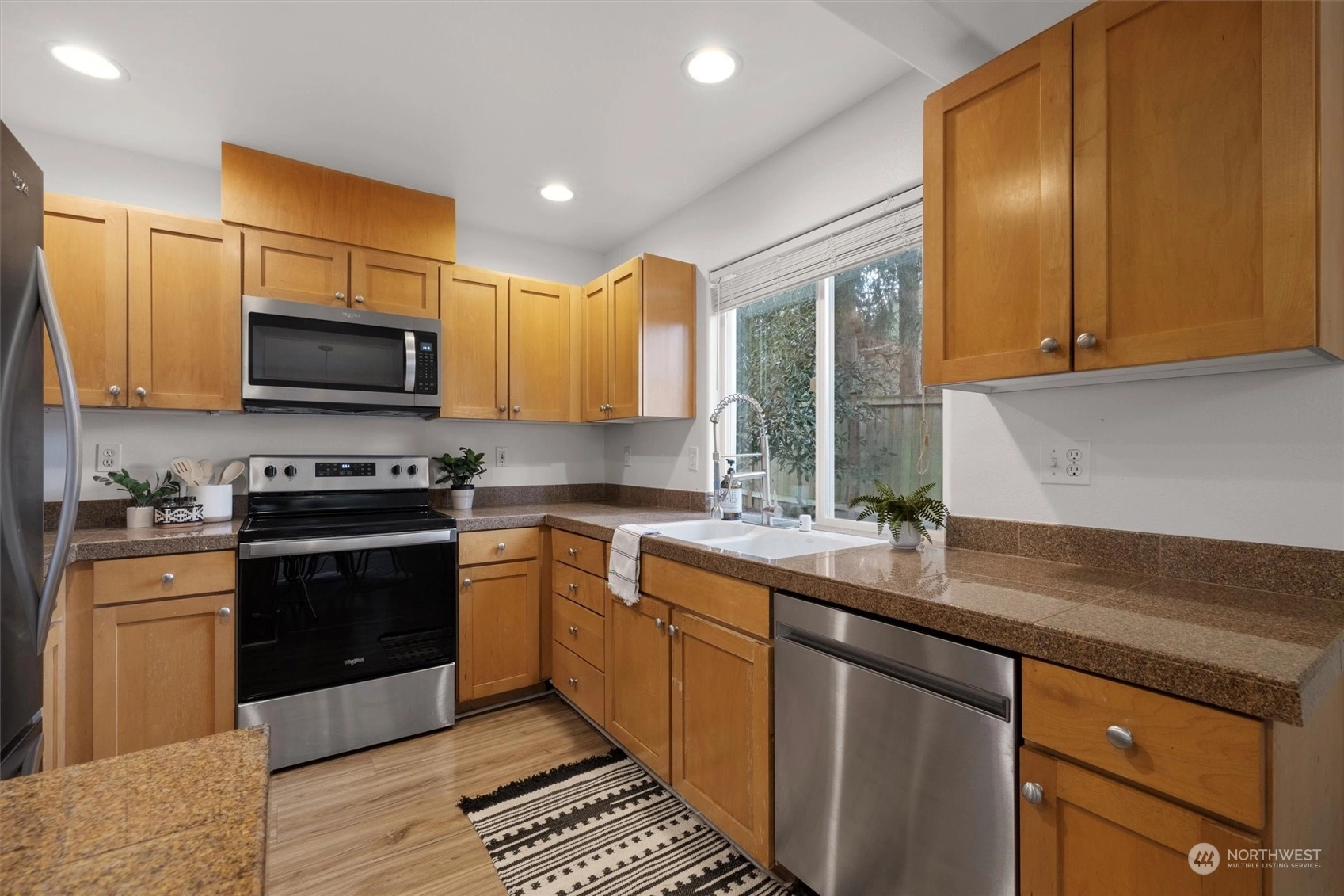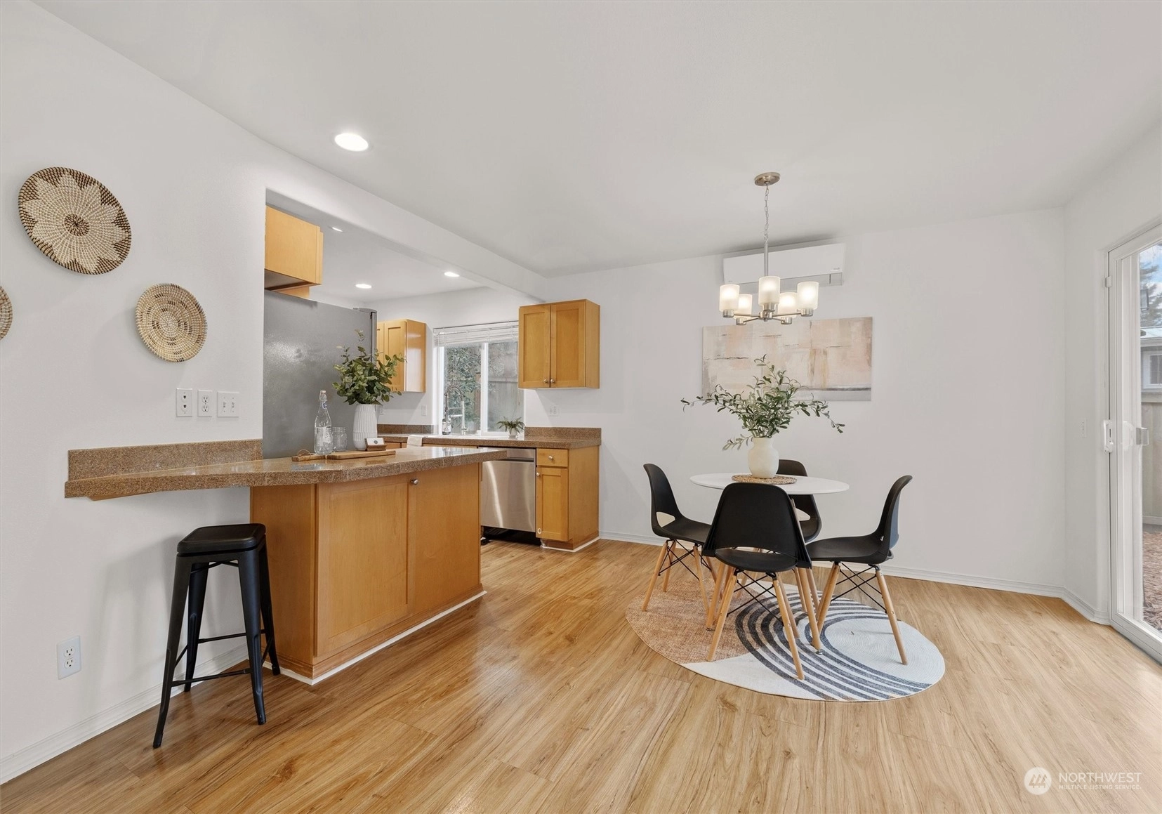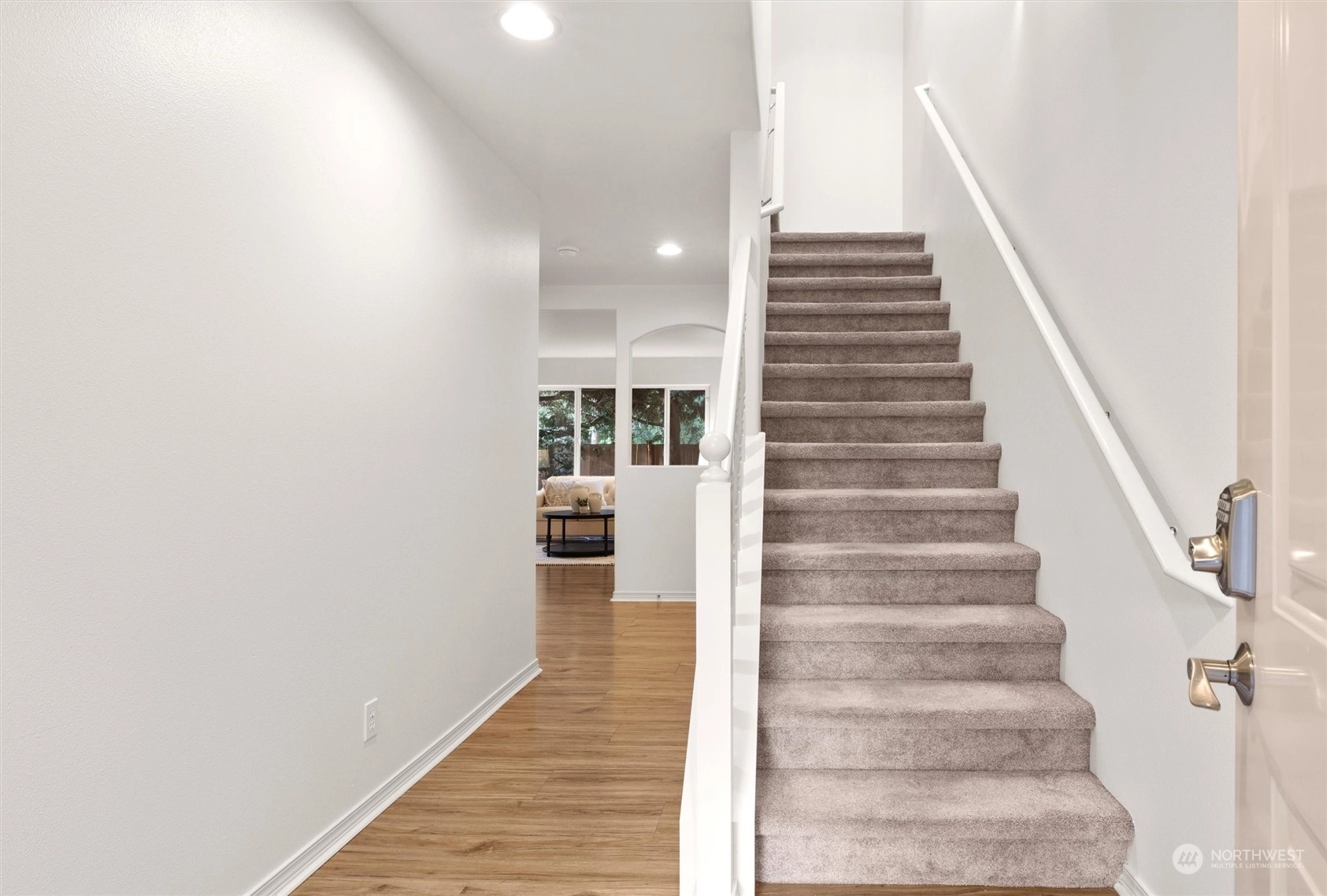 Stunning Edmonds townhome: the perfect blend of comfort, convenience and location with updated features, private backyard, gated entry & attached garage with EV charger. Laminate flooring throughout main floor with wall to wall carpet upstairs. Heat pumps installed on main floor and primary bedroom provide A/C. Huge, fully fenced private back yard area. Gas fireplace, stainless steel appliances and turnkey condition round out the updated creature comforts. This end unit has comfortable flow with spacious rooms. 5-piece primary suite has large walk-in closet, separate soaking tub w/ double sinks. Perfectly appointed with an even more appealing price point. A great opportunity in Edmonds with ideal location to all points of interest.