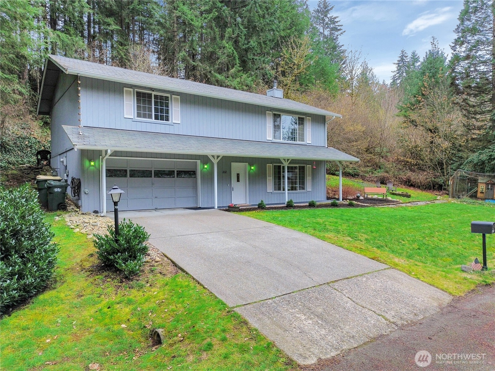 Clean and well maintained home with a warm comfy-feel in a unique and excellent location! Conveniently located just a few steps off 507 behind the local schools lies this quaint, wooded community. Featuring a generous sized main level room with full bath and laundry, this could be used as a primary or second family room. Upstairs is the galley style, yet open kitchen adjacent to the large living area with wood burning stove. Two more beds and a full bath complete the upper level. Outside you'll find a generous deck, chicken coupe, and cozy fireplace area. Lots of storage in the oversized two car garage.