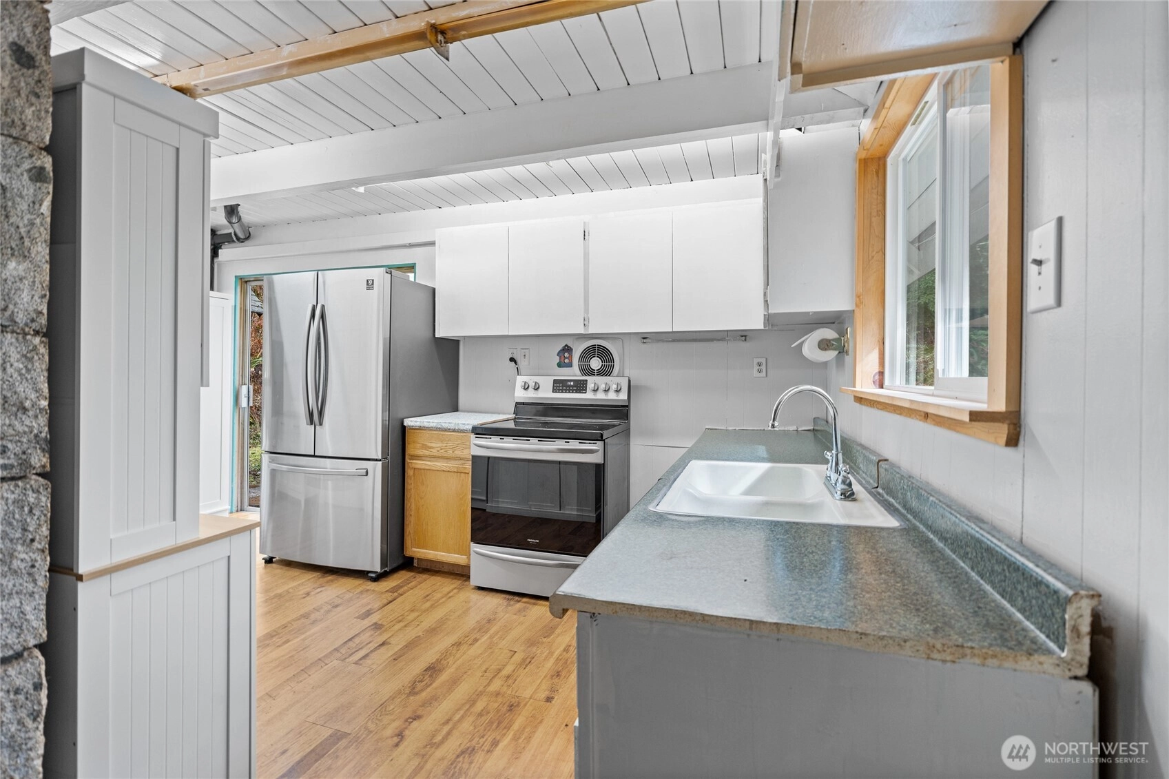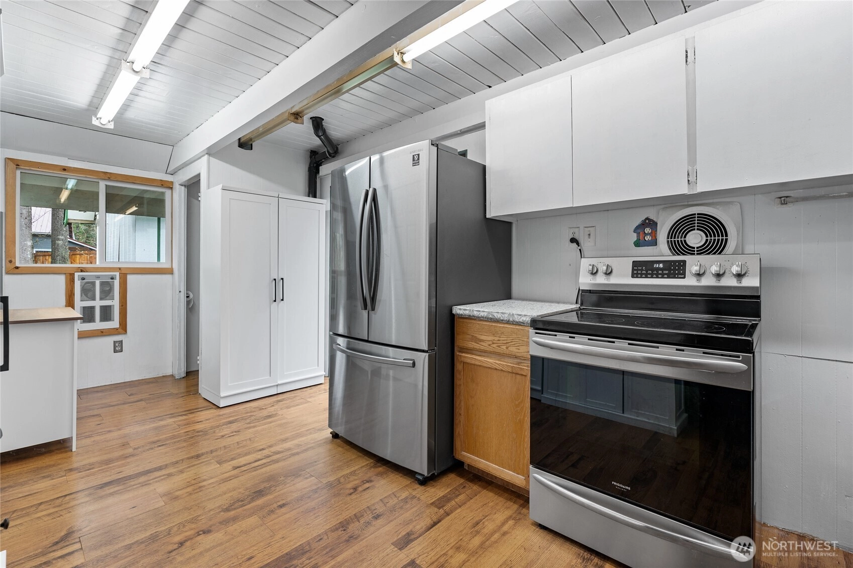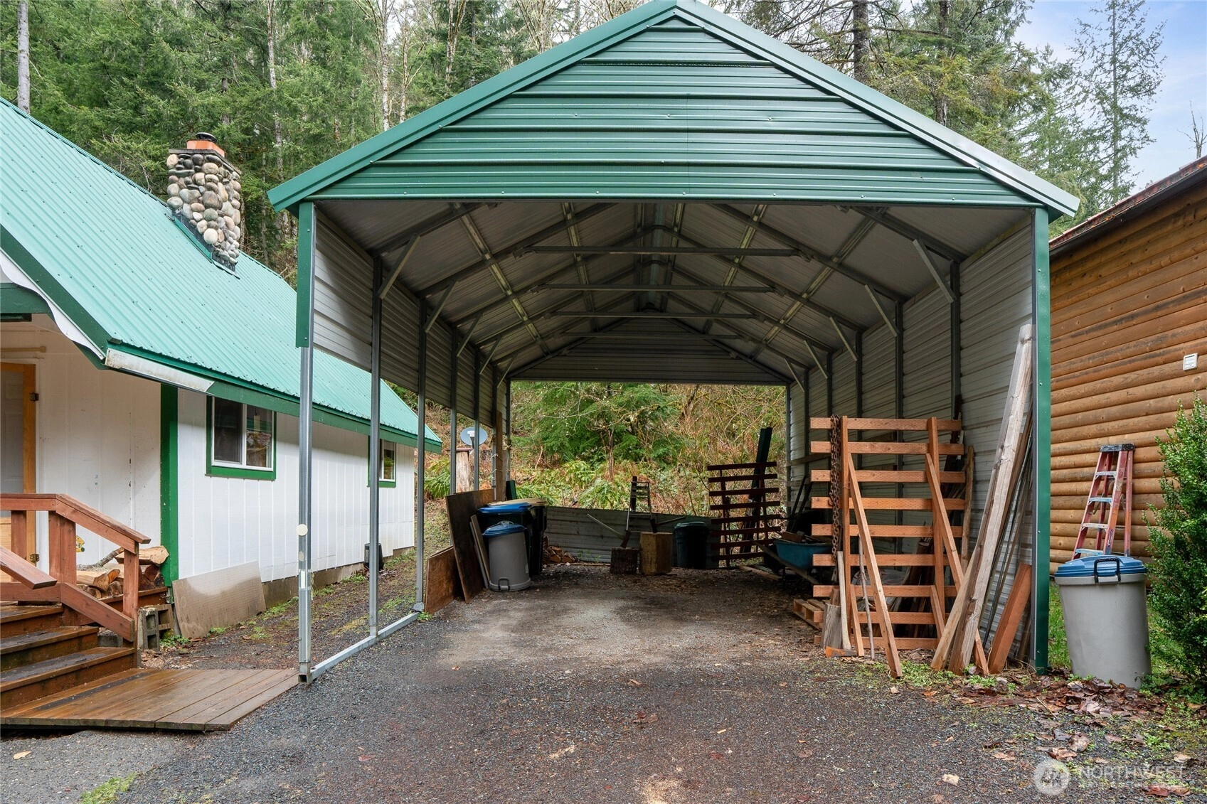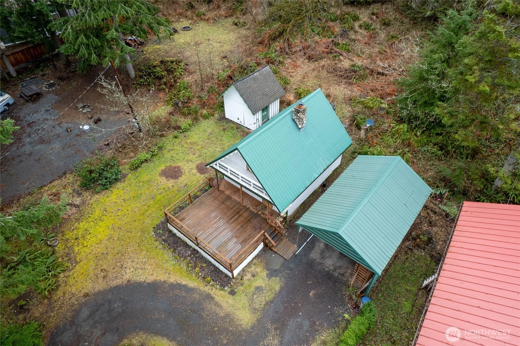 Welcome home to the beloved paradise estates community. This Cabin features 720sqft of living space, 1 bedroom and ½ bath upstairs along with a powder room on the main floor. Upgrades to cabin included new windows, stainless steel appliances, hot water heater, upstairs plumbing, electrical panel, fireplace insert, chimney case replaced with double wall pipe and upgraded stonework all work was completed within the last 3 years. This Home is situated on .40 acres and backs up to private land and Tahoma state forest land. Exterior of the home features a metal roof, large deck and upper balcony to enjoy the surrounding views. Covered carport will stay and outbuilding has a generator hookup and washer and dryer.