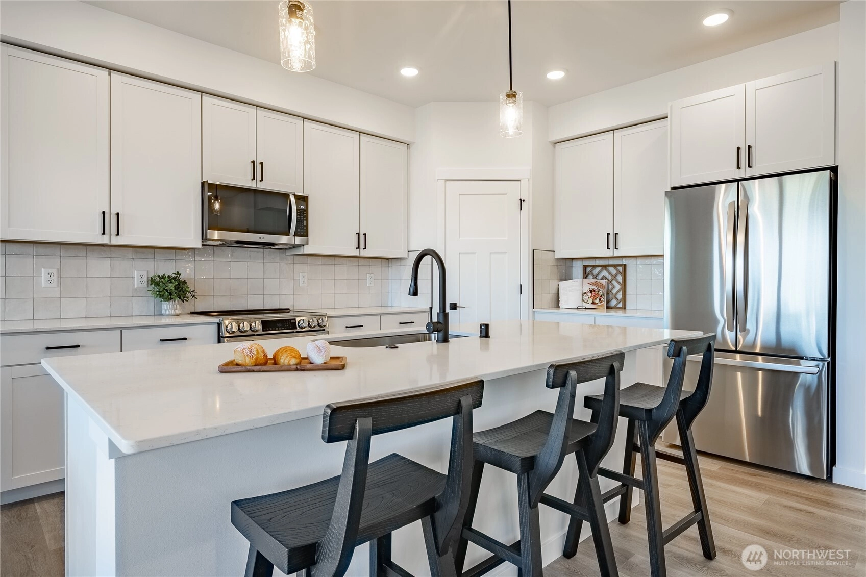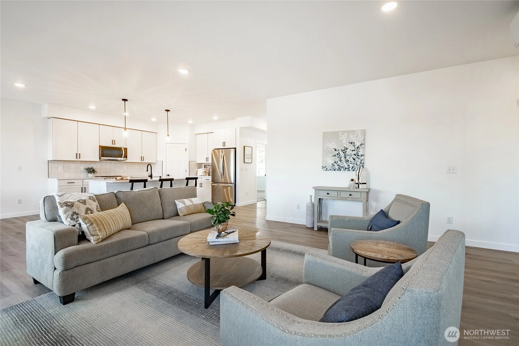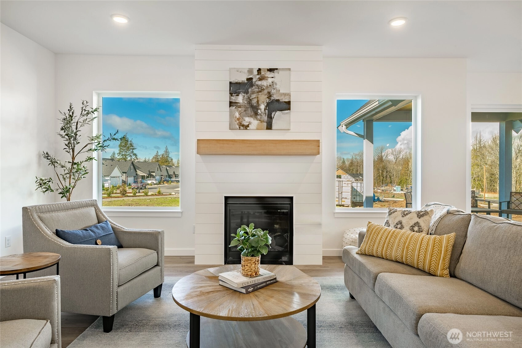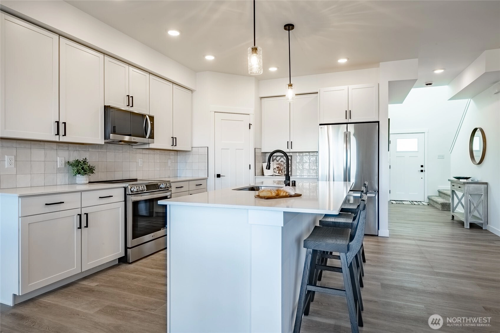 Welcome to The Ridge in Blaine, WA! This 4-bedroom home offers a spacious layout with a bonus loft living area upstairs, perfect for additional entertaining space, or a playroom. The main floor features an open-concept design with high ceilings and a cozy propane fireplace, creating a warm and inviting atmosphere. Step outside to the covered back patio, ideal for year-round outdoor enjoyment. High-end finishes throughout include luxury vinyl plank flooring, flat panel cabinets, quartz countertops & designer tile backsplash, and slab-on-grade foundation. Mini-split heating and cooling. Conveniently located near downtown Blaine and I-5, easy access to all amenities. *SAVINGS with our Preferred Lender: .75% Lender Credit, $5,000 Seller Credit.