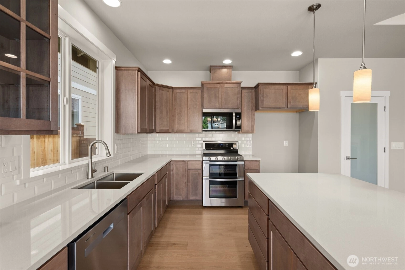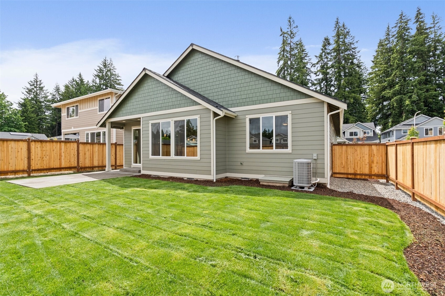 Discover Tumwater's Skyview Estates by local builder Rob Rice Homes where elegance and convenience meet! Rare single-level 3-bed/2-bath plan spans 1944 sf. Kitchen boasts quartz counters with full tile back splash, Maple "Shadow" shaker cabinets, gas range, and opens to vaulted great room with fireplace. Entry, kitchen & dining feature engineered hardwood flooring, quartz counter tops throughout. Enjoy the outdoors on the covered patio, fully landscaped yard with privacy fencing! Energy-efficient features include solar panels, heat pump for heating/cooling, and electric hybrid hot water. Ideal location near Black Hills High, Costco, and quick I-5 access. Photos are Virtually Staged