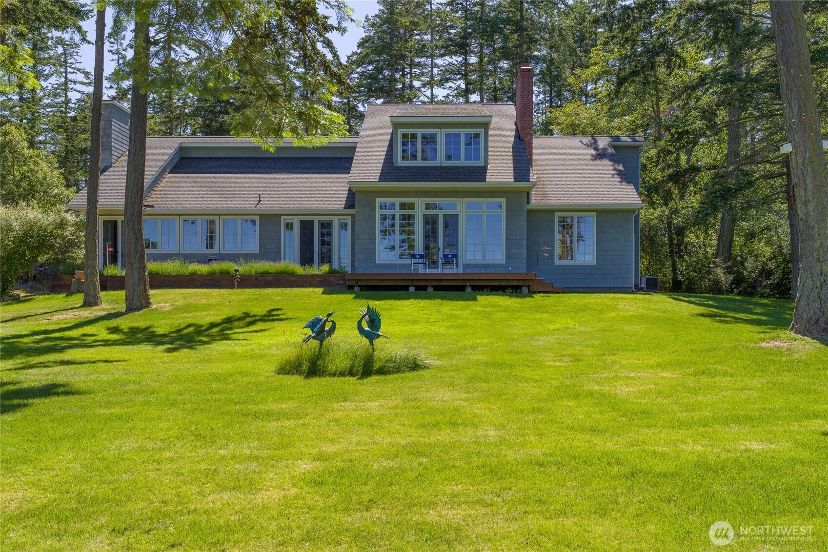 Experience the perfect blend of New England elegance and Pacific NW beauty in this rare San Juan Islands waterfront estate. Set on 1.6 private acres with 209 ft of shoreline, the home showcases sweeping Mt. Baker and Salish Sea views--watch ferries, orcas and eagles from your deck. French doors open to sunlit gardens & lawns, ideal for entertaining. Inside, a grand living room with Rumford fireplace, formal dining & bright kitchen/family room with oak floors create timeless appeal. The luxurious primary suite boasts a spa-like bath & oversized walk-in closet, plus two guest rooms, den & 2-car garage. A property of unmatched setting, style and serenity.