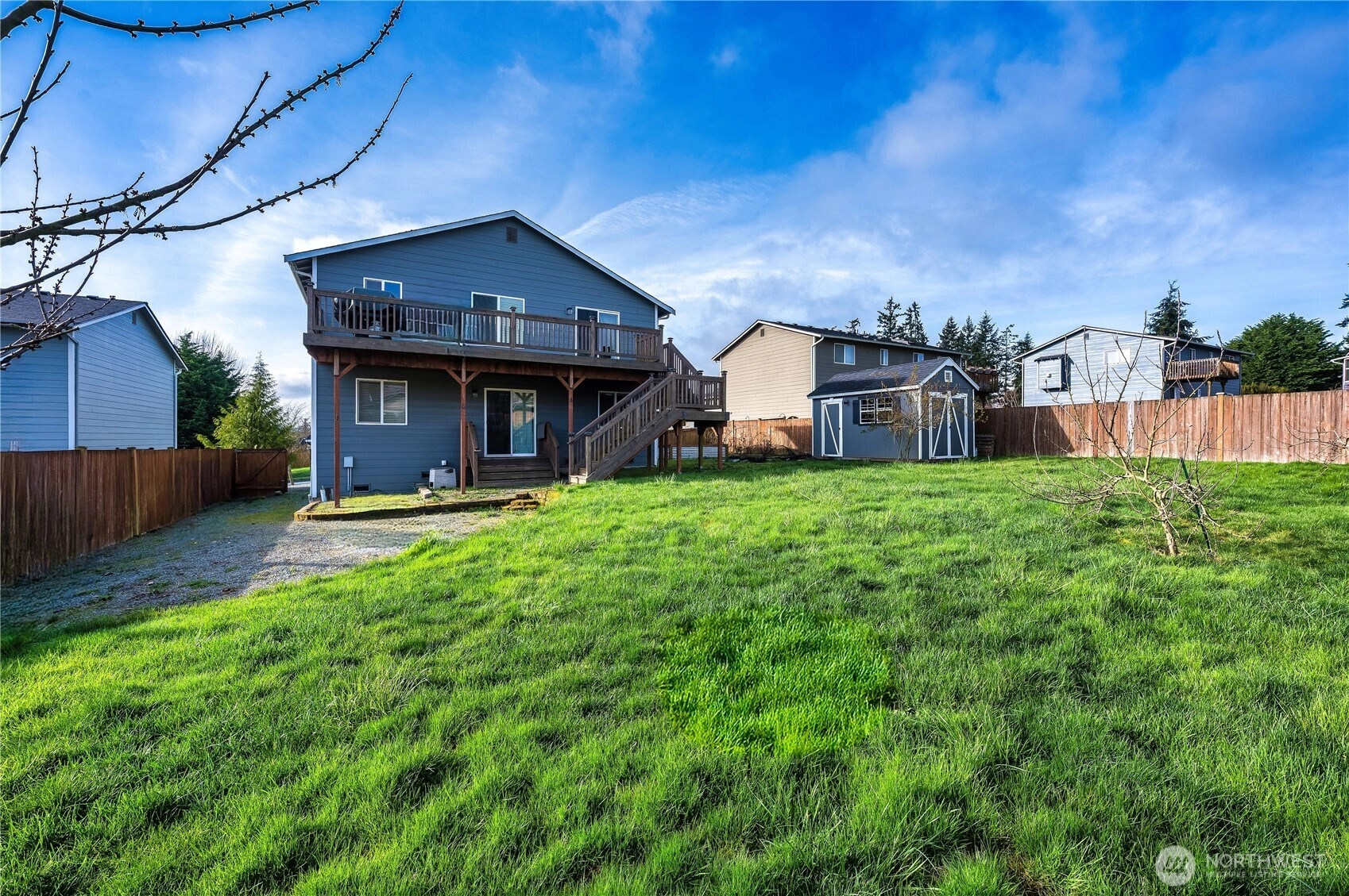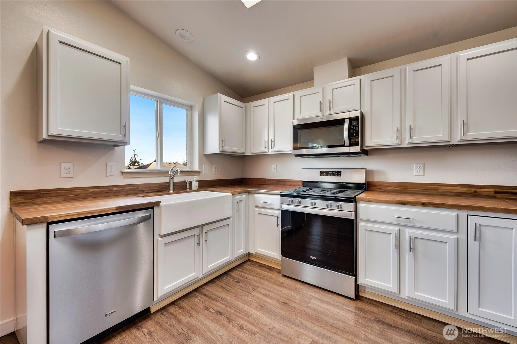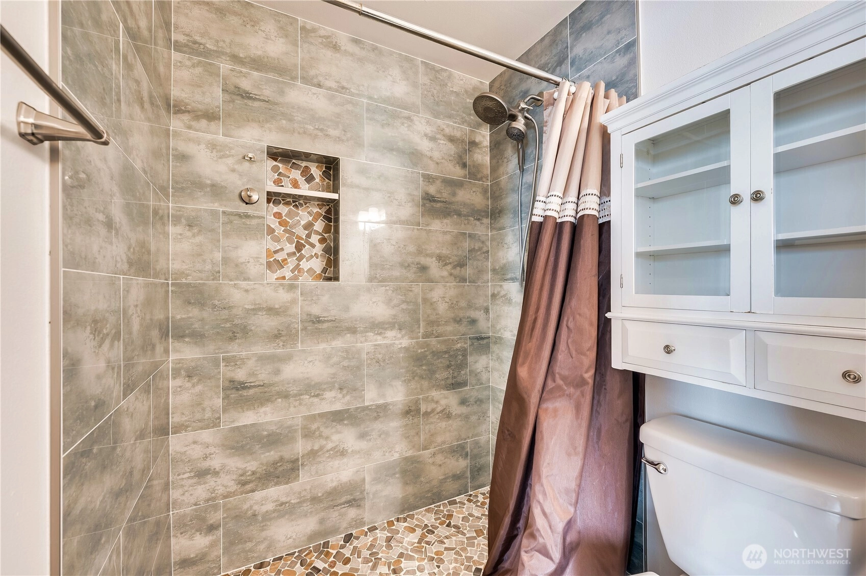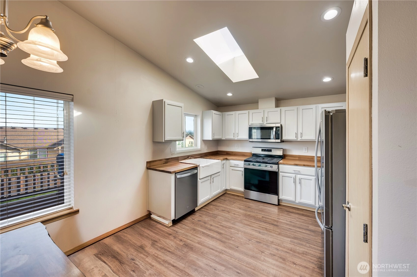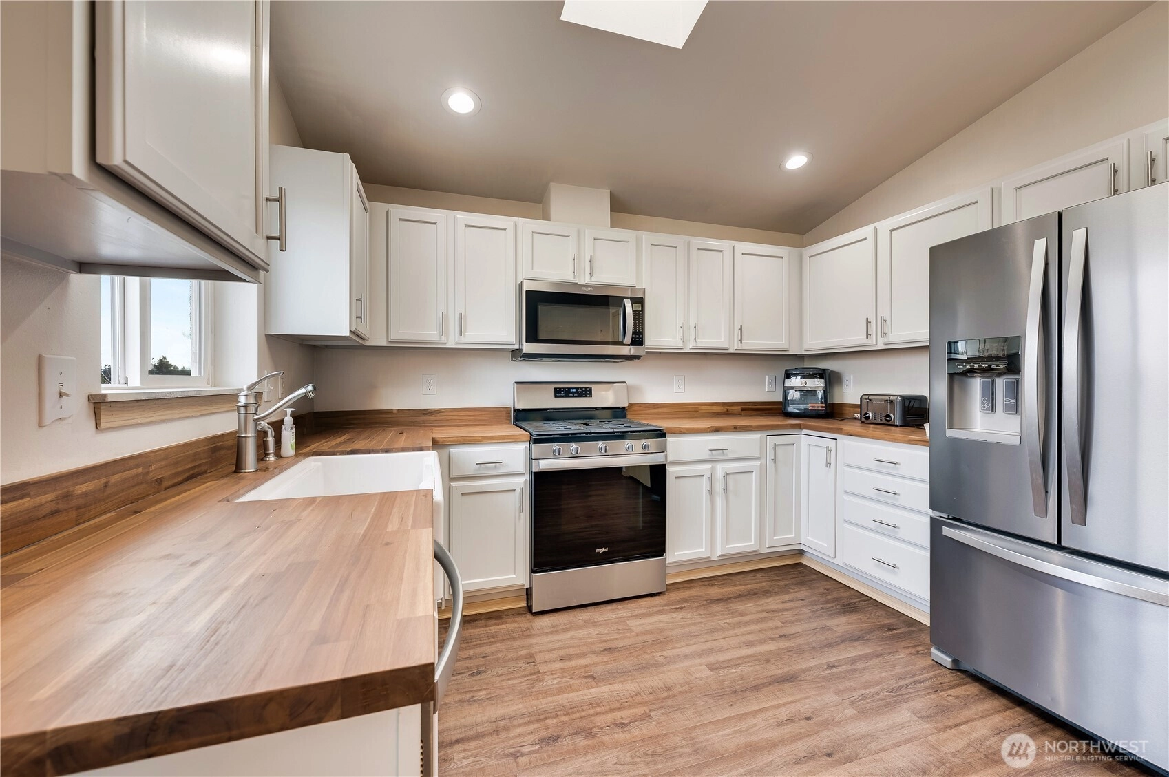 Welcome to your home in the desirable Stanwood community, nestled in a quiet cul-de-sac close to Stanwood High School and local amenities. This property boasts a vaulted ceiling, beautiful views from the deck, and a big fenced yard with a tool shed, a pond, and a garden spot. The upper level features a kitchen with new butcher block countertops, a living room w/ a gas fireplace, a dining room, two bedrooms, and a fully updated bathroom. The primary bedroom includes a newly updated ensuite with a walk-in tile shower and a walk-in closet. Downstairs, find a bedroom, a spacious recreational room perfect for an office or entertainment area with a gas fireplace, and a 3/4 bath with laundry facilities. A 2-car garage completes this inviting home