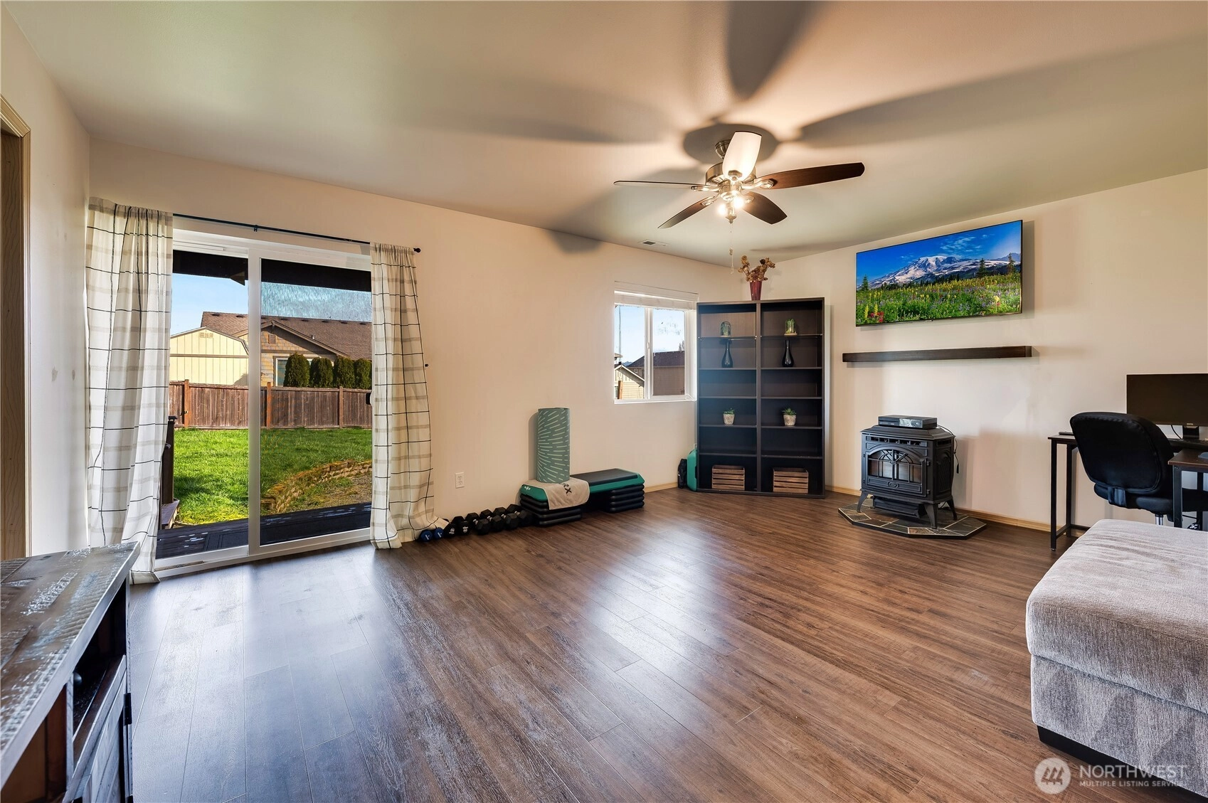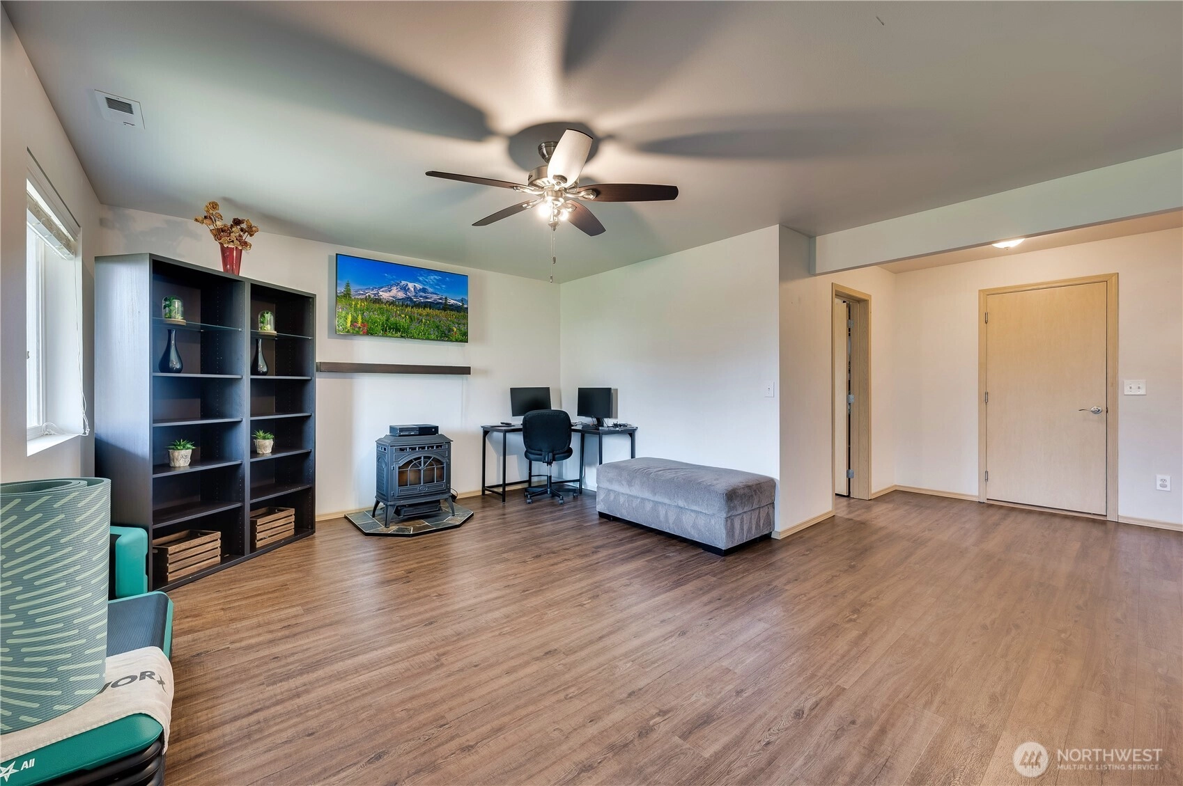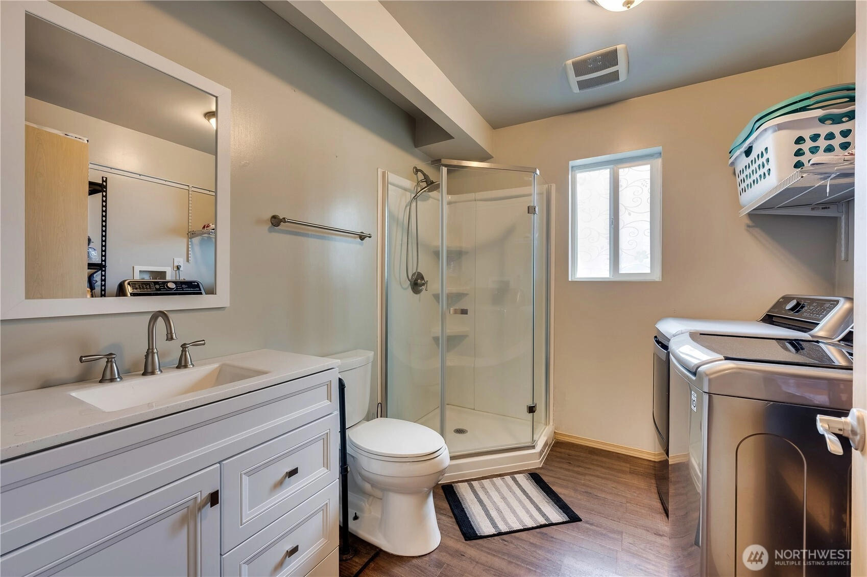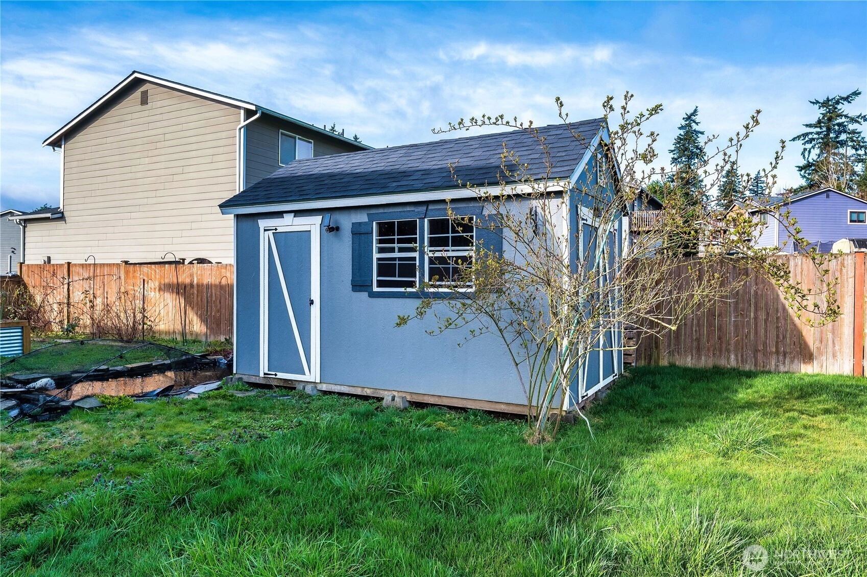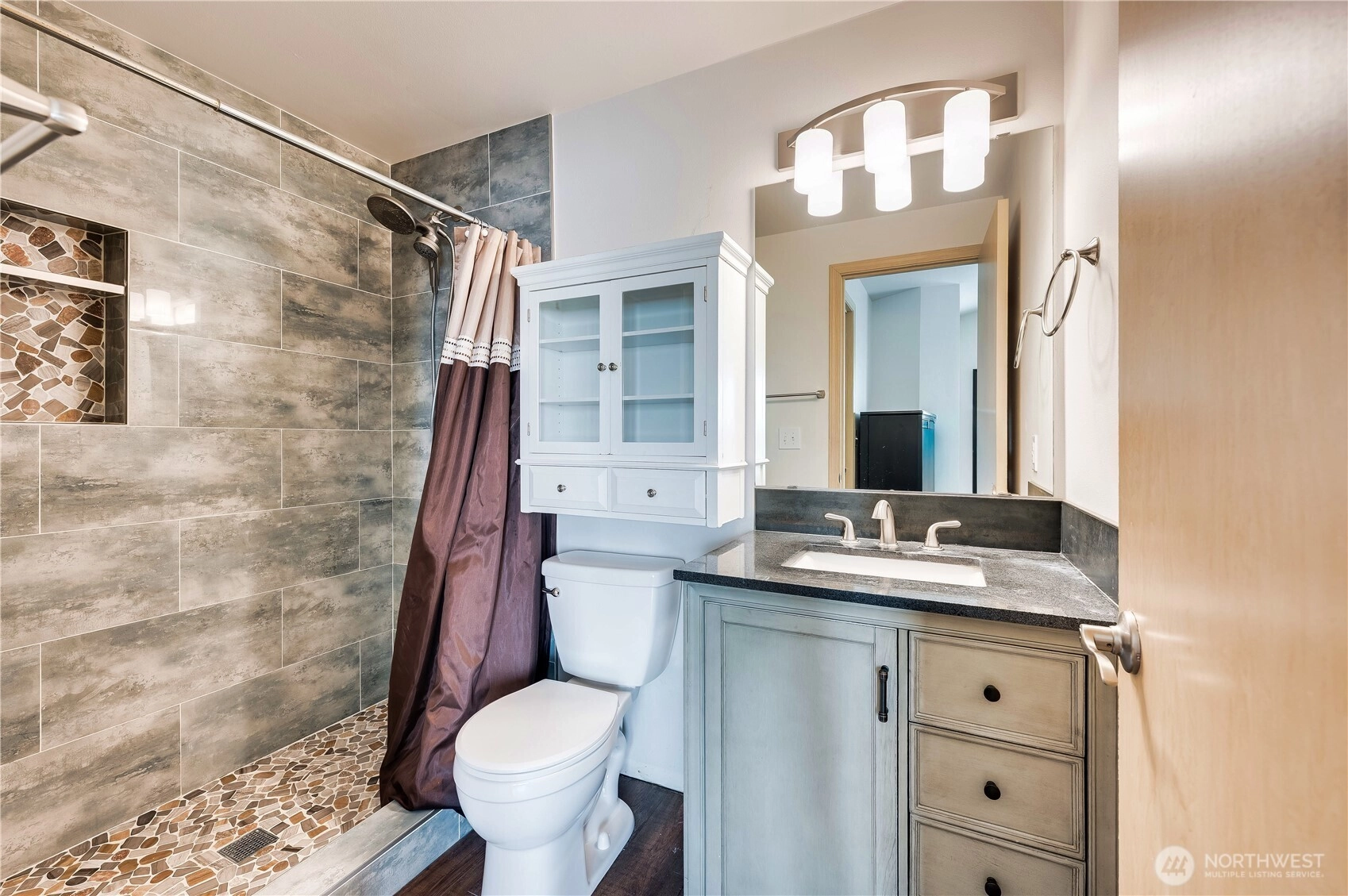 Welcome to your home in the desirable Stanwood community, nestled in a quiet cul-de-sac close to Stanwood High School and local amenities. This property boasts a vaulted ceiling, beautiful views from the deck, and a big fenced yard with a tool shed, a pond, and a garden spot. The upper level features a kitchen with new butcher block countertops, a living room w/ a gas fireplace, a dining room, two bedrooms, and a fully updated bathroom. The primary bedroom includes a newly updated ensuite with a walk-in tile shower and a walk-in closet. Downstairs, find a bedroom, a spacious recreational room perfect for an office or entertainment area with a gas fireplace, and a 3/4 bath with laundry facilities. A 2-car garage completes this inviting home