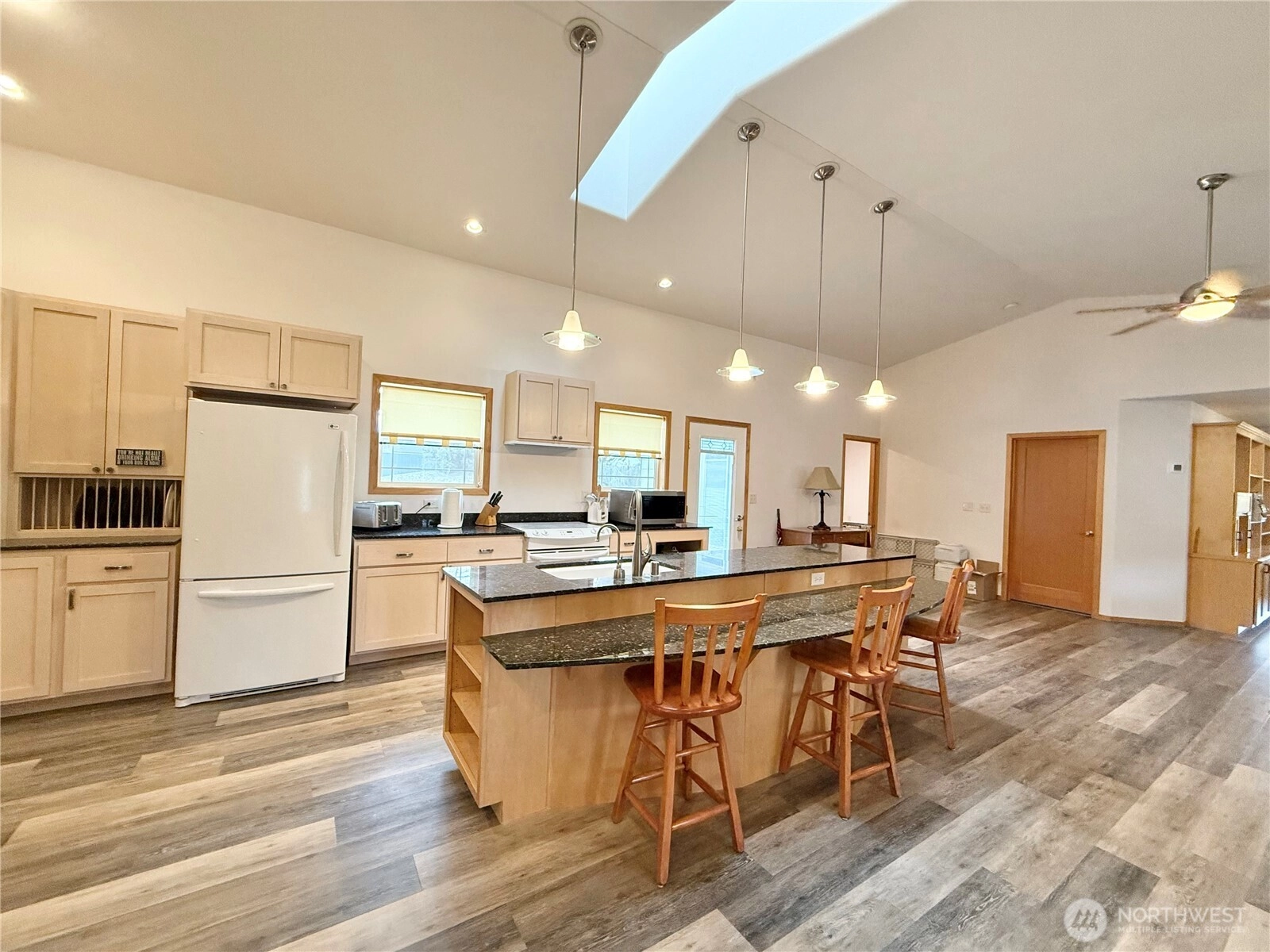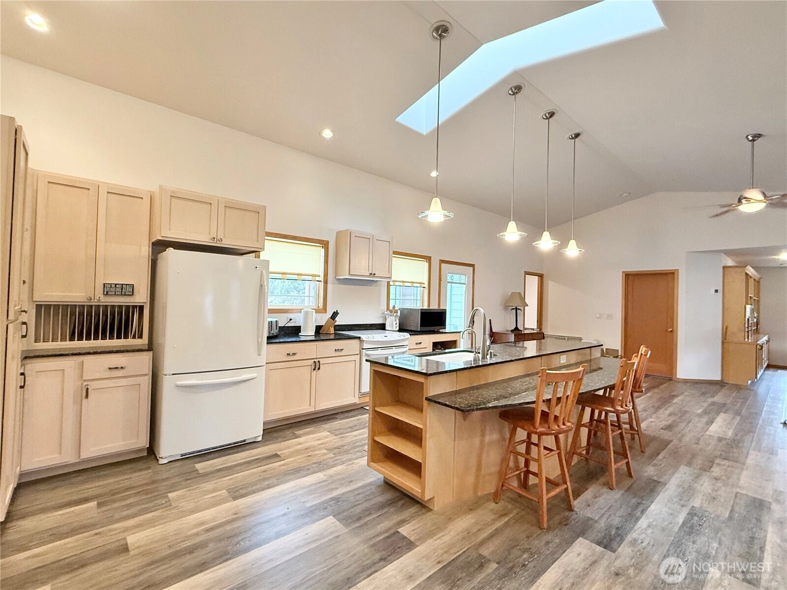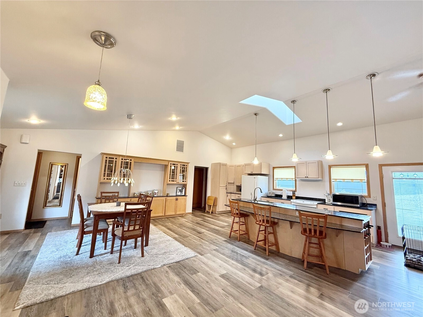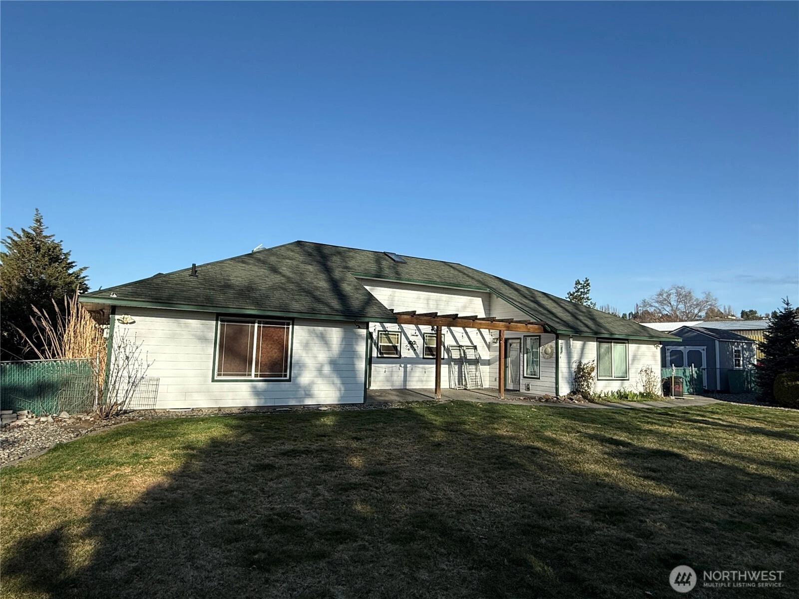 Omak - Peaceful location at the end of the street. Home features 2409 sq.ft. 3 bedrooms/3 bathrooms open concept with vaulted ceilings, great room w/dining room, living room, & kitchen w/breakfast bar & granite countertops. All appliances stay. Extras include sky lights, ceiling fans, & custom light fixtures. Tons of BUILT-INS! Primary bedroom w/large walk-in closet & island, second W/D, double sinks & newly remodeled tile shower. 2 bedrooms w/Jack & Jill (three quarter) bathroom. Okanogan Irrigation for yard w/sprinkler system. Fully fenced back yard, professionally landscaped, gate for easy access. RV parking w/water & power. Pergola. Motion lights. Circular - paved driveway. Oversized 2 car attached garage. $425,000 H-3649/MLS-2348020