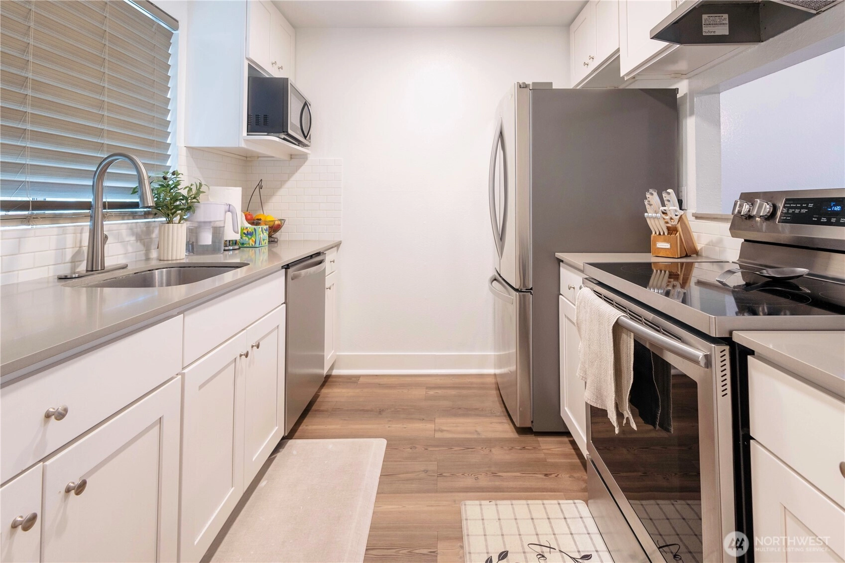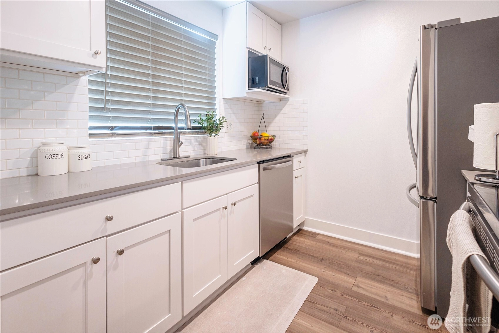 Welcome home to this smart and well maintained condo in the heart of Federal Way! Featuring a beautifully updated kitchen with newer appliances, updated flooring on main level, fresh paint throughout, and a newer washer and dryer! Open living and dining room space with cozy gas fireplace. 1/2 bath on main floor for guests. 2 spacious bedrooms upstairs both with quality closet organizers. Plenty of organized storage throughout! Full bath upstairs has new tile shower and plenty of counter space. Enjoy summer BBQ's on the back deck that has outdoor storage. HOA dues include water, sewer, trash. Within walking distance to many great shops, restaurants, parks, and more!