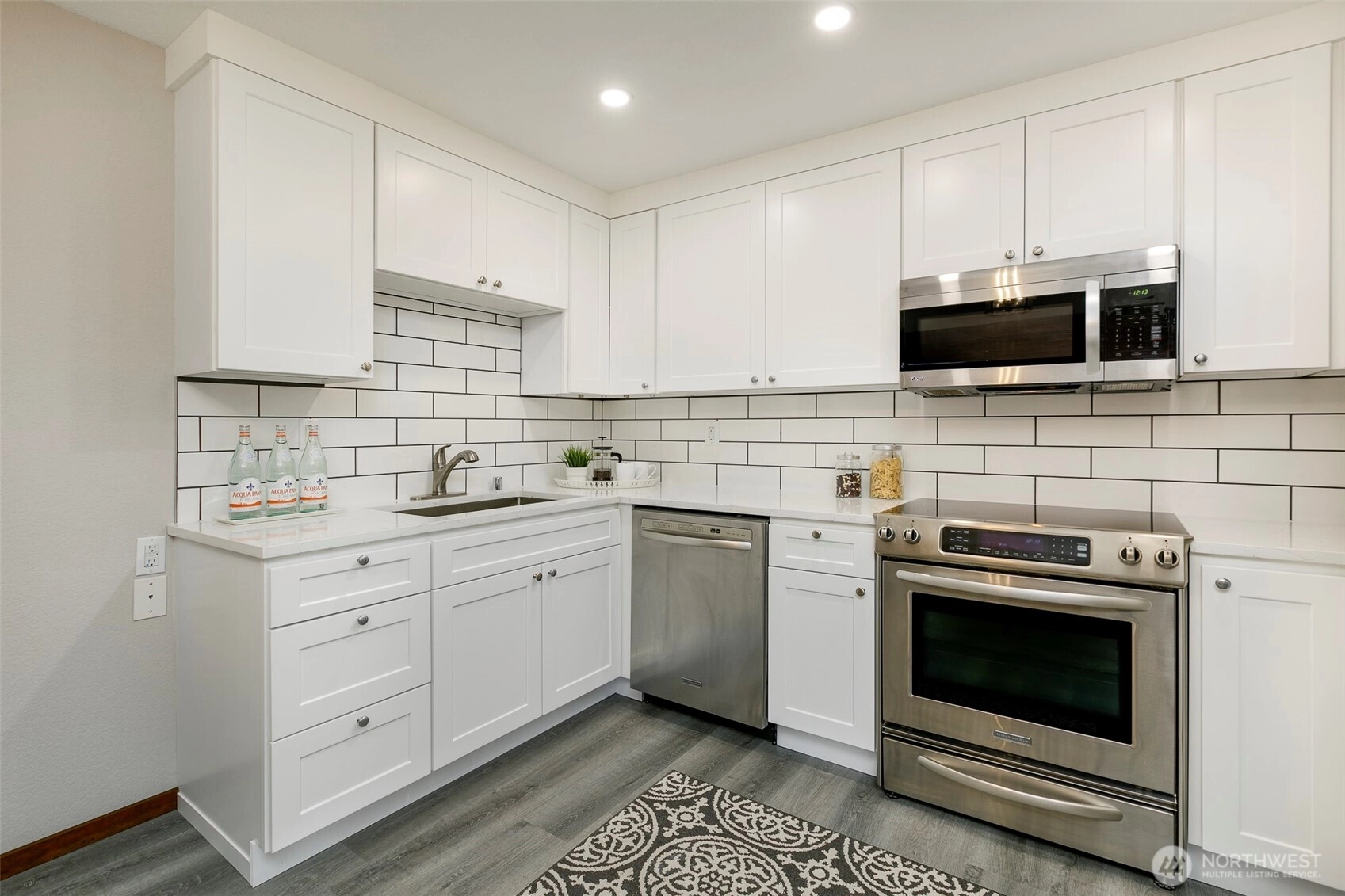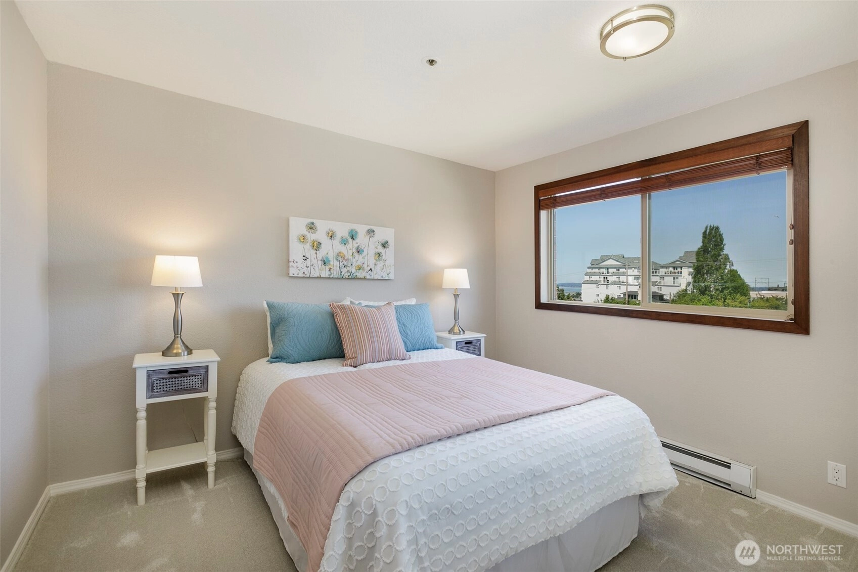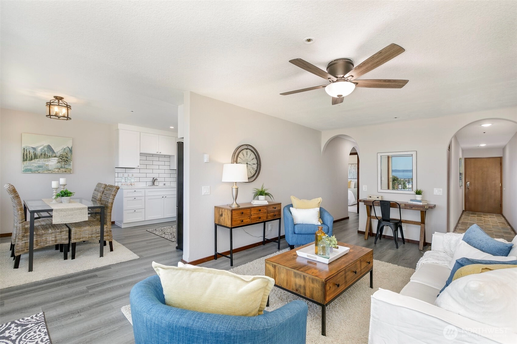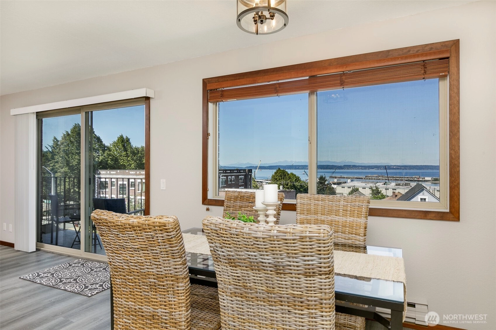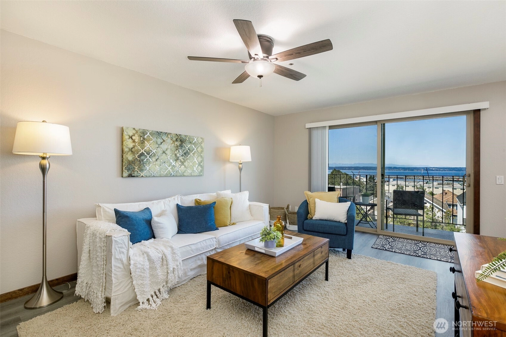 Newly renovated 2-bedroom, 1-bathroom condo with eye-catching views of Puget Sound and the Olympics. Sit on your terrace and relax while enjoying the beautiful sun set over the mountains. Features include a new kitchen with stunning quartz countertops, sleek new cabinets, subway tiled backsplash, new floors throughout, fresh paint, and an updated bathroom all designed for both comfort and elegance. Enjoy the ease of in-unit laundry and the benefits of an HOA that covers water, sewer, and garbage. Located a short distance from vibrant shopping and dining options and public transportation. This condo offers a secure parking spot and a storage space. Experience the ideal urban lifestyle today!