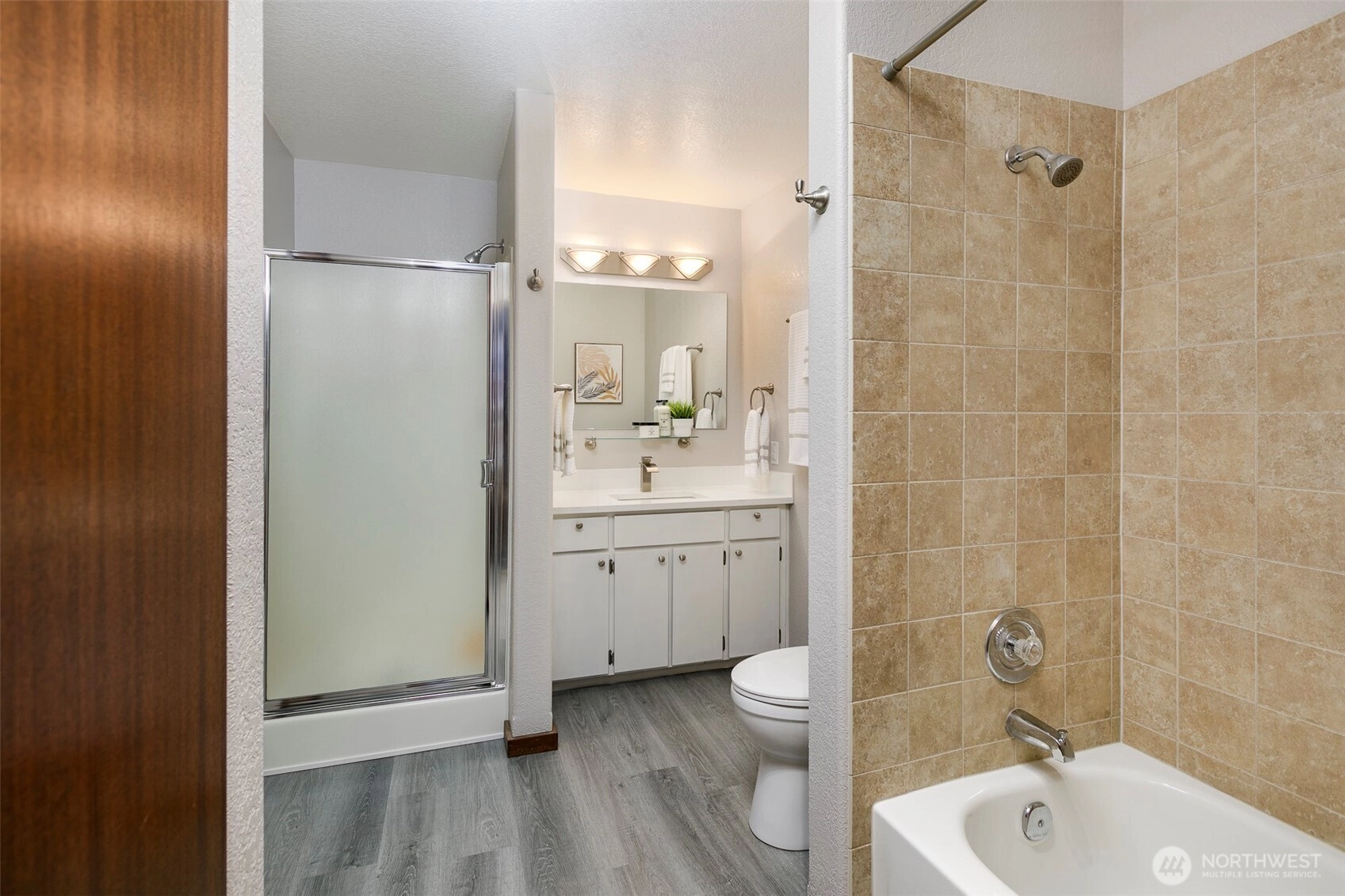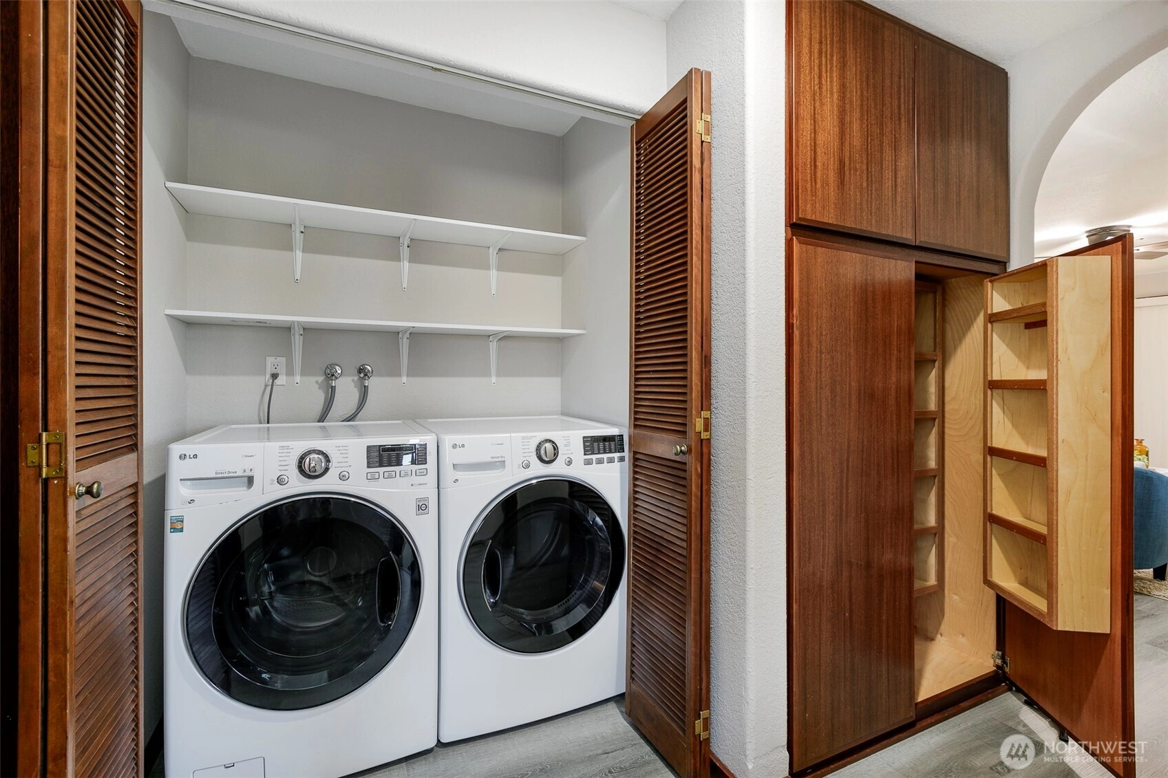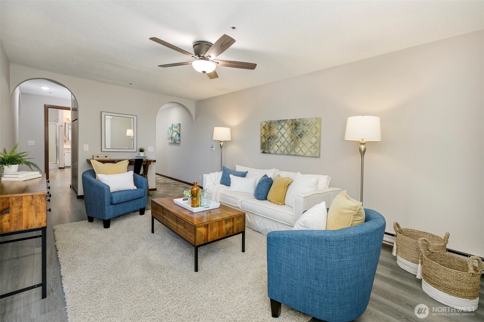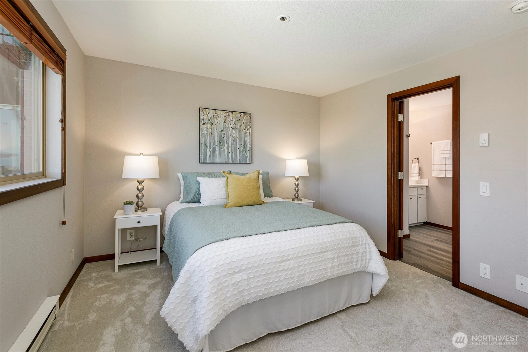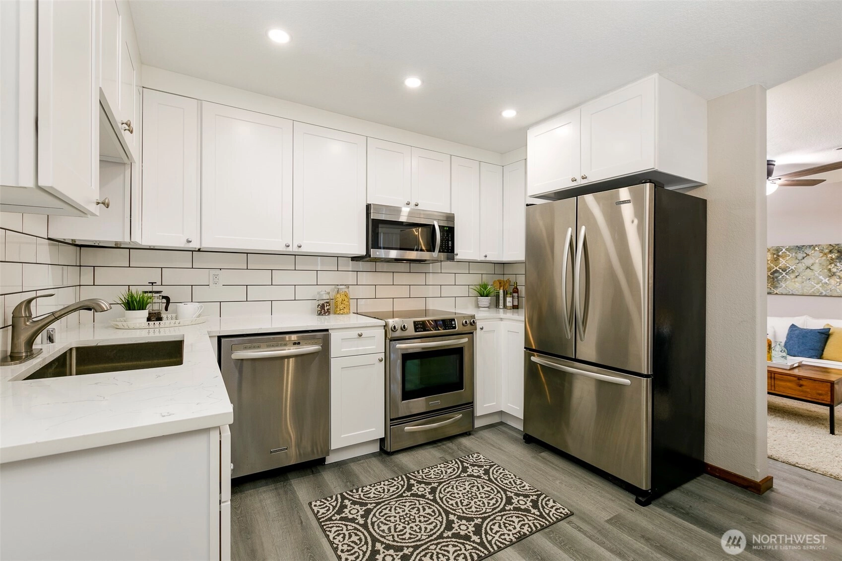 Newly renovated 2-bedroom, 1-bathroom condo with eye-catching views of Puget Sound and the Olympics. Sit on your terrace and relax while enjoying the beautiful sun set over the mountains. Features include a new kitchen with stunning quartz countertops, sleek new cabinets, subway tiled backsplash, new floors throughout, fresh paint, and an updated bathroom all designed for both comfort and elegance. Enjoy the ease of in-unit laundry and the benefits of an HOA that covers water, sewer, and garbage. Located a short distance from vibrant shopping and dining options and public transportation. This condo offers a secure parking spot and a storage space. Experience the ideal urban lifestyle today!